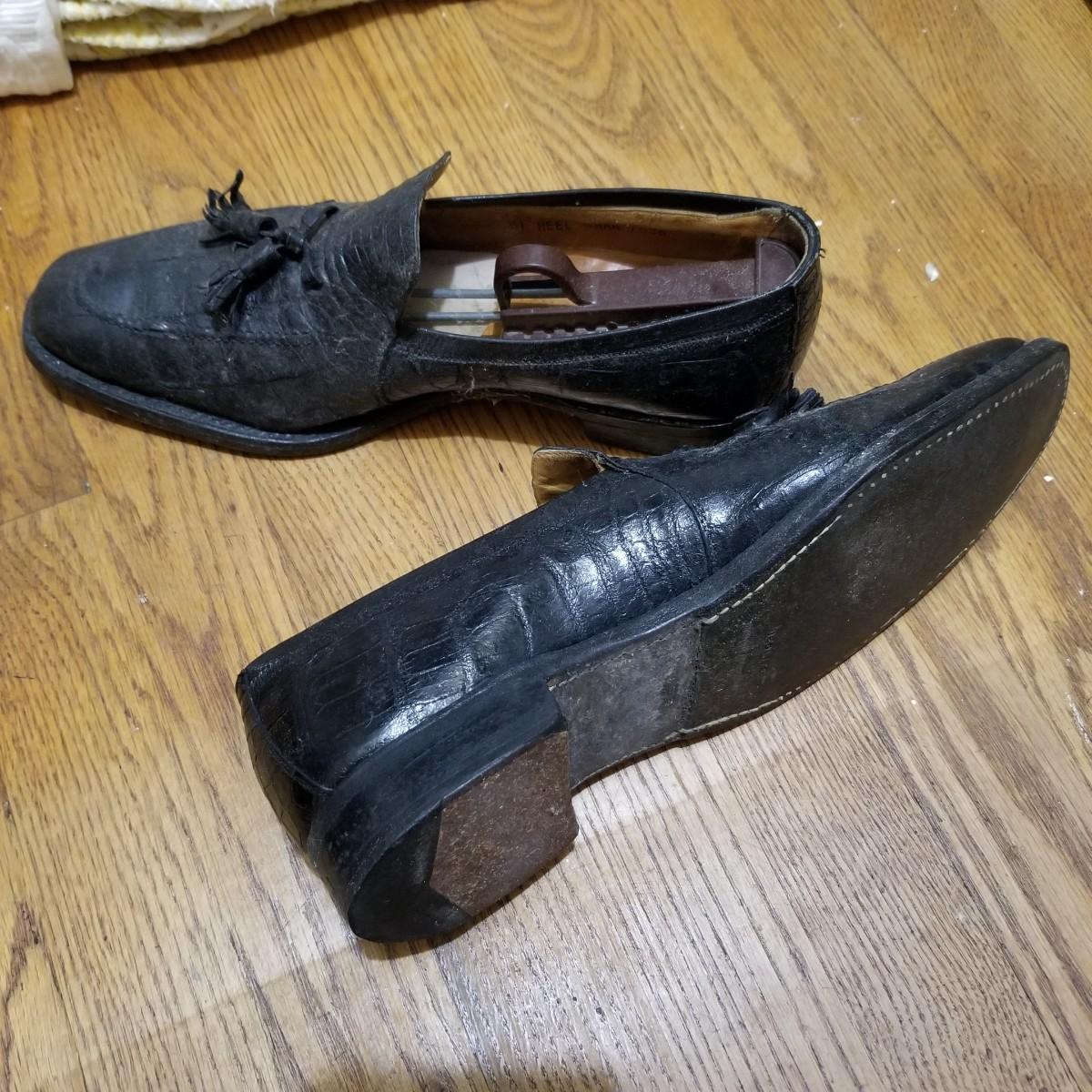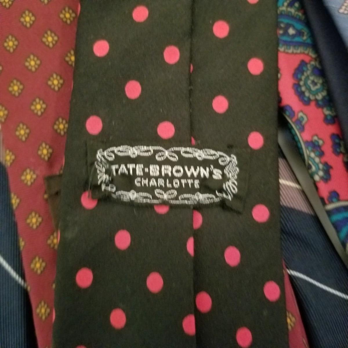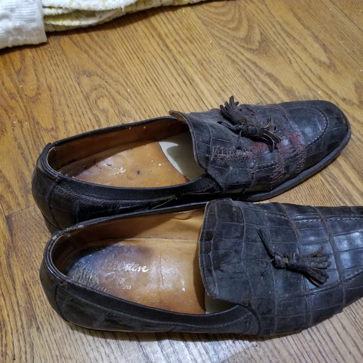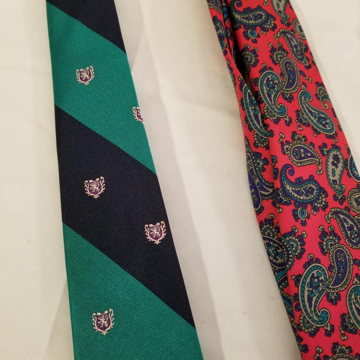 A collection of men's clothing items. Three shirts, two jackets, three pairs of tasseled shoes, thirty dress ties.  Sizes X-large. The shoes are size 10.5. Men's sport coat has some discoloring, see photos. Local Pickup Only.