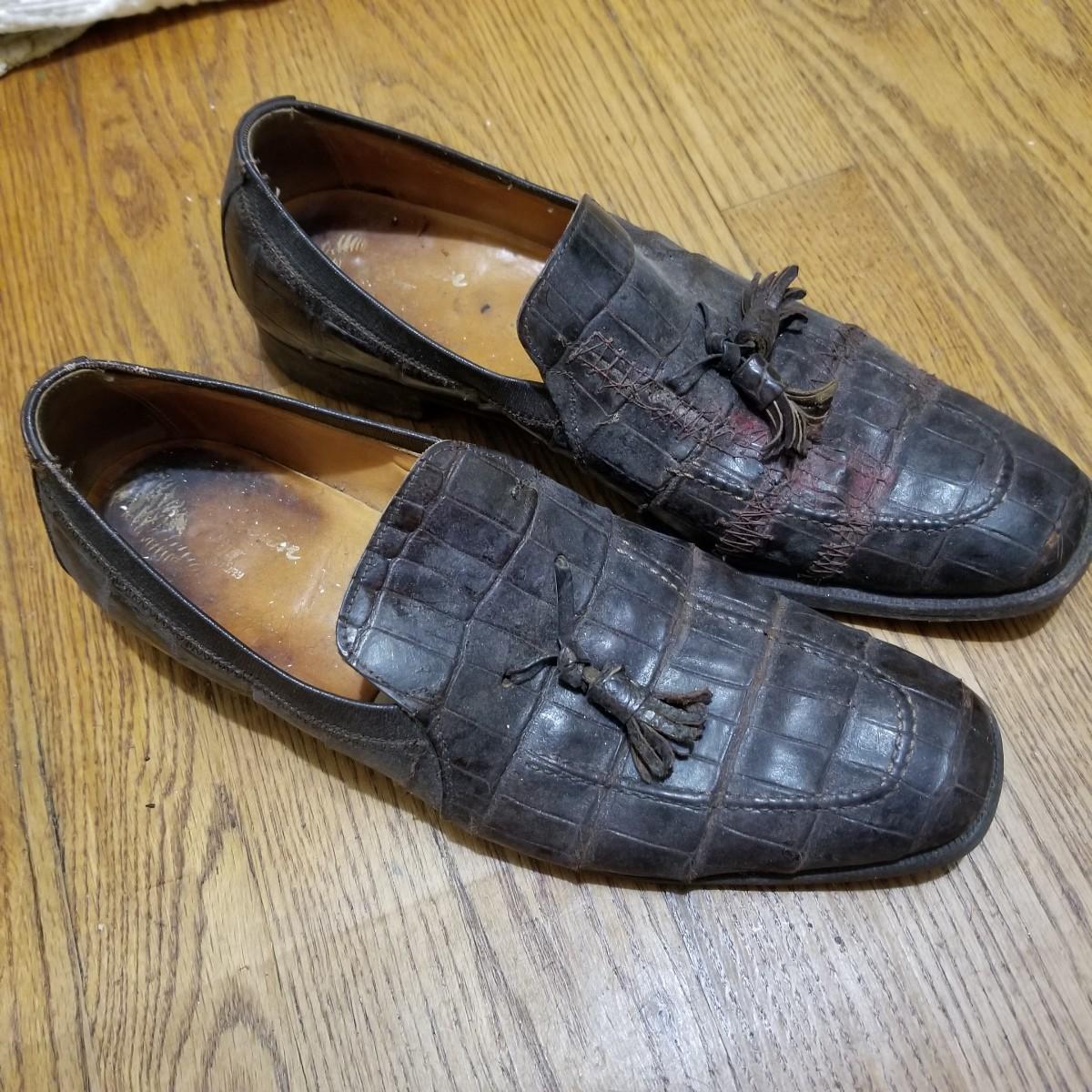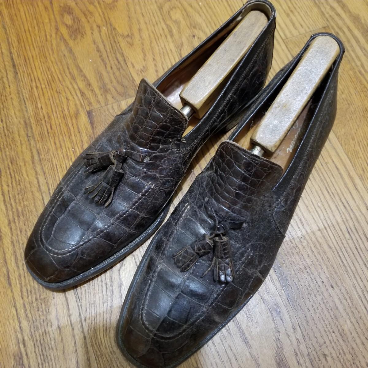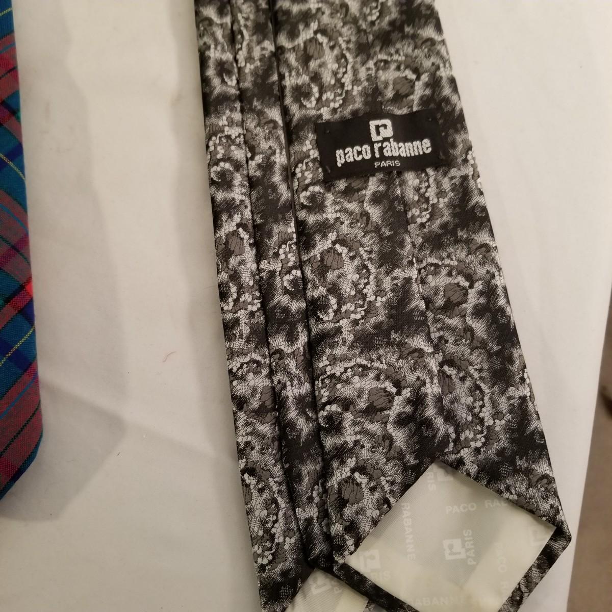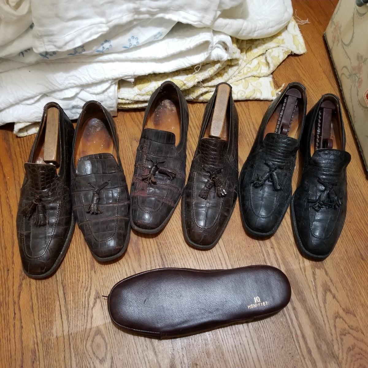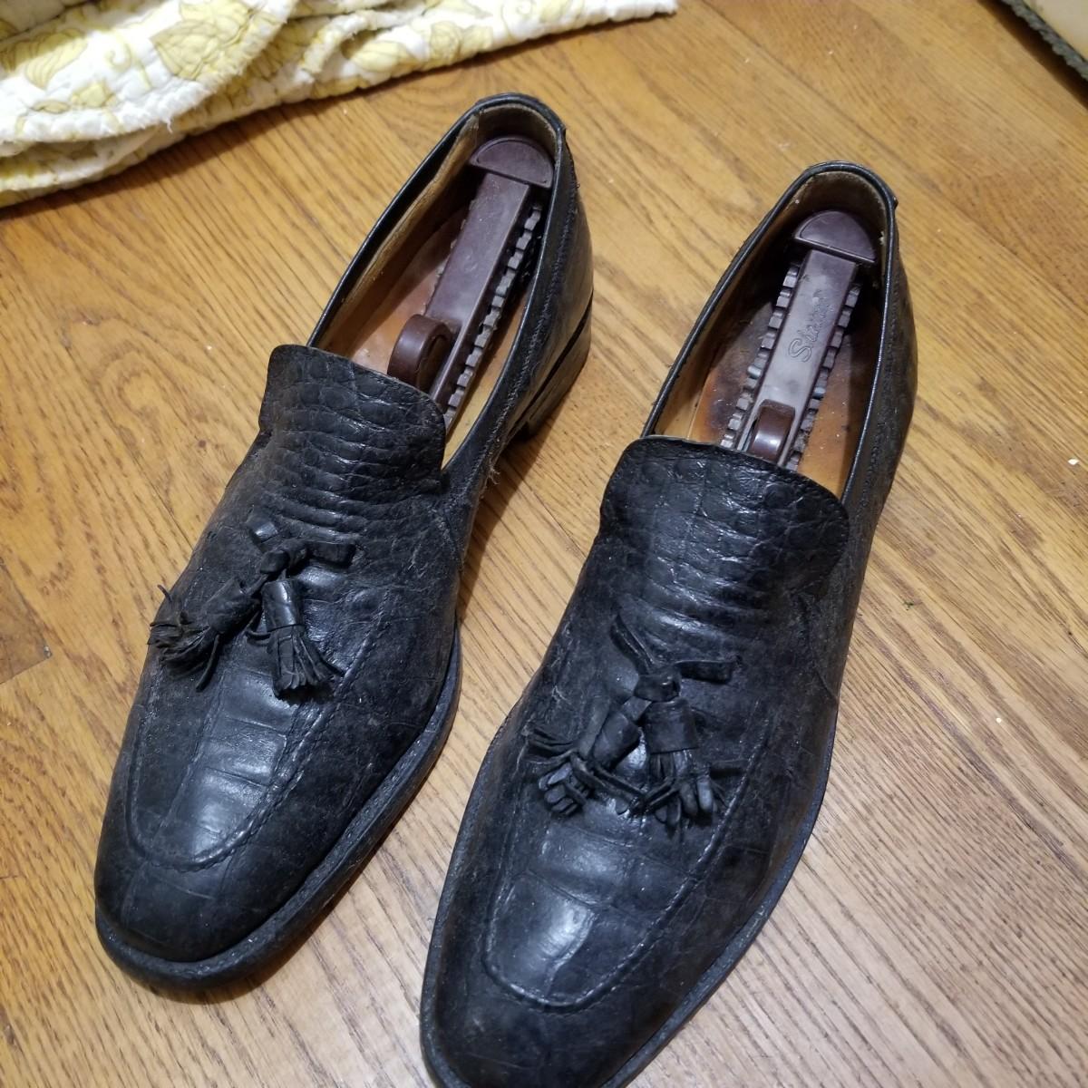 A collection of men's clothing items. Three shirts, two jackets, three pairs of tasseled shoes, thirty dress ties.  Sizes X-large. The shoes are size 10.5. Men's sport coat has some discoloring, see photos. Local Pickup Only.