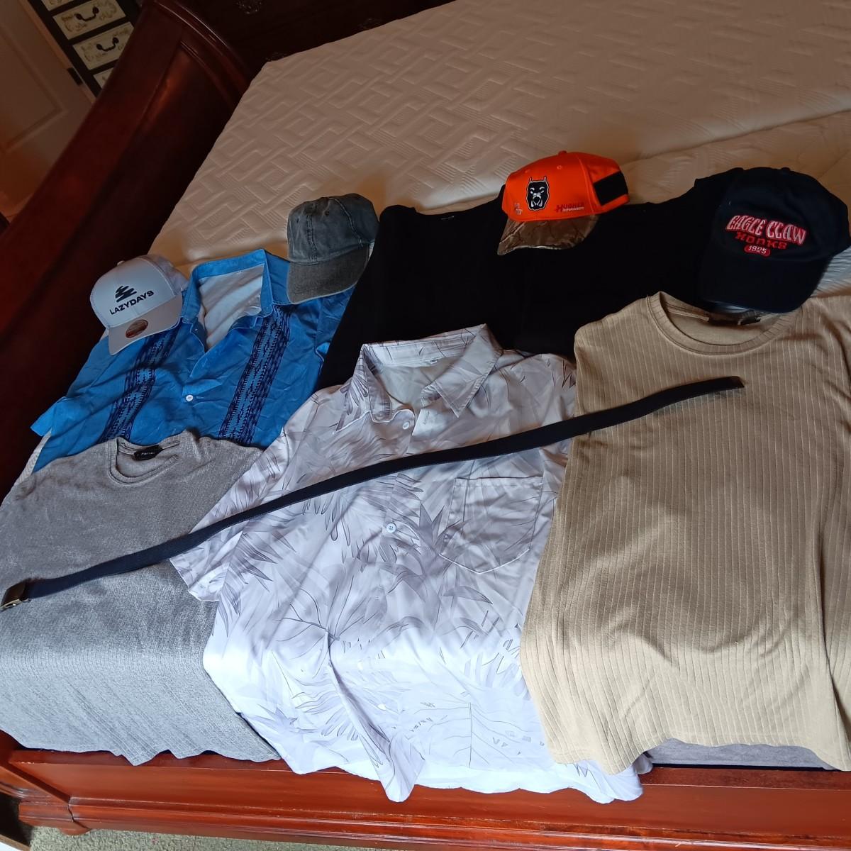 MEN'S SHIRTS (XL), BALL CAPS & BELT (38)