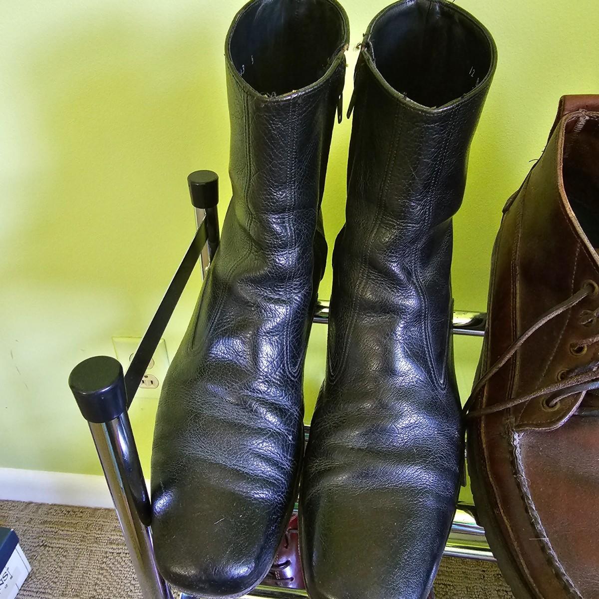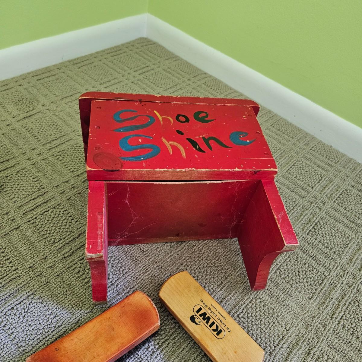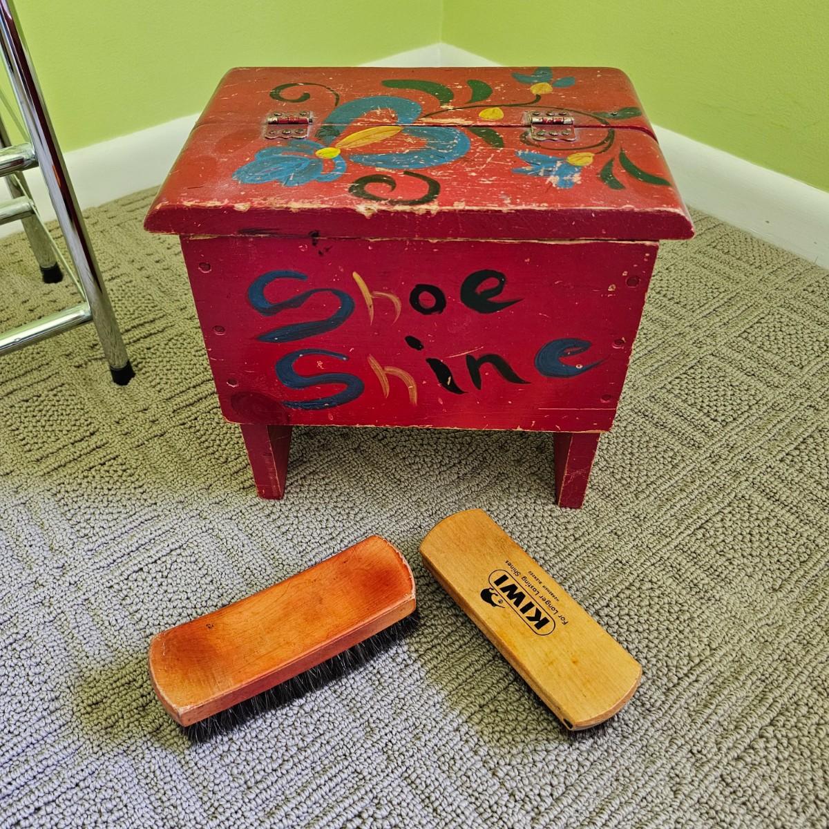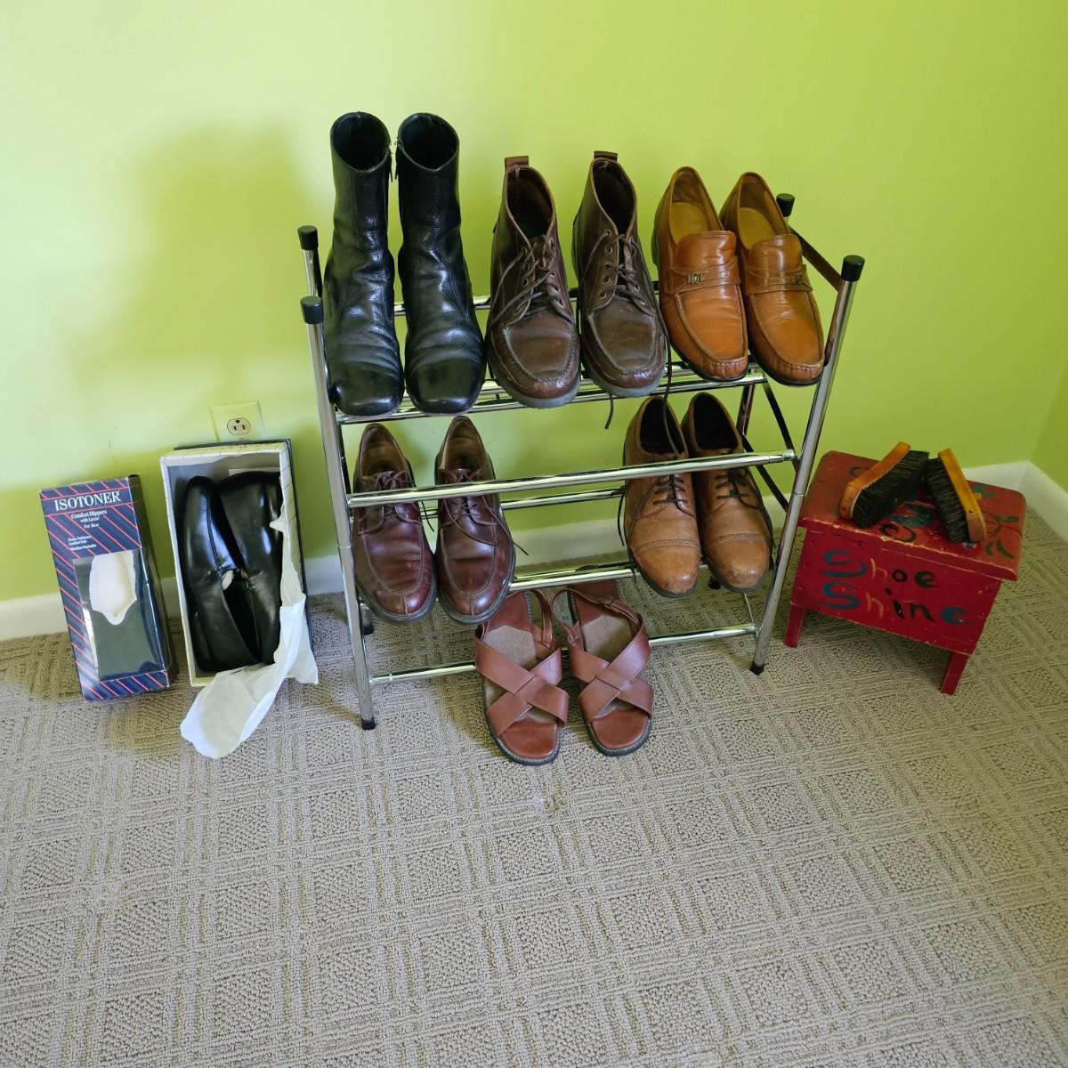Seven pair of mens size 12 shoes and sandals. Oxfords, wingtips, boots, black and brown/tan. Includes one steel shoe rack, 25" x 9" x 27"H, and a vintage shoe shine measures 12" x 8" x 10". Box has accessories included, but we cannot verify the contents. See photos for details. Shipping available.