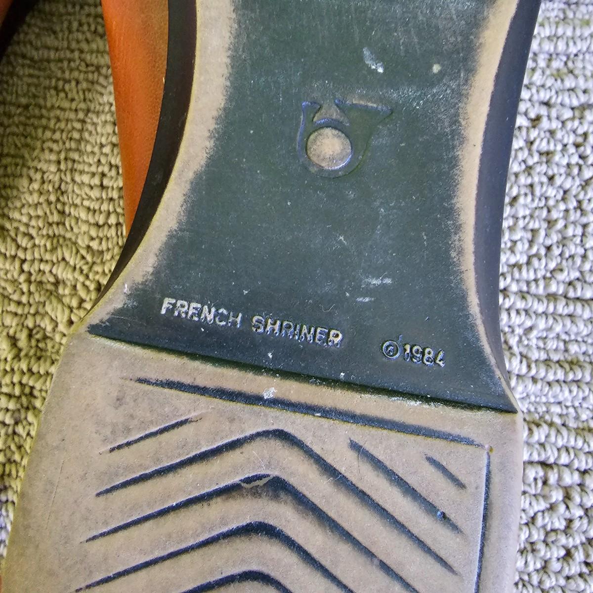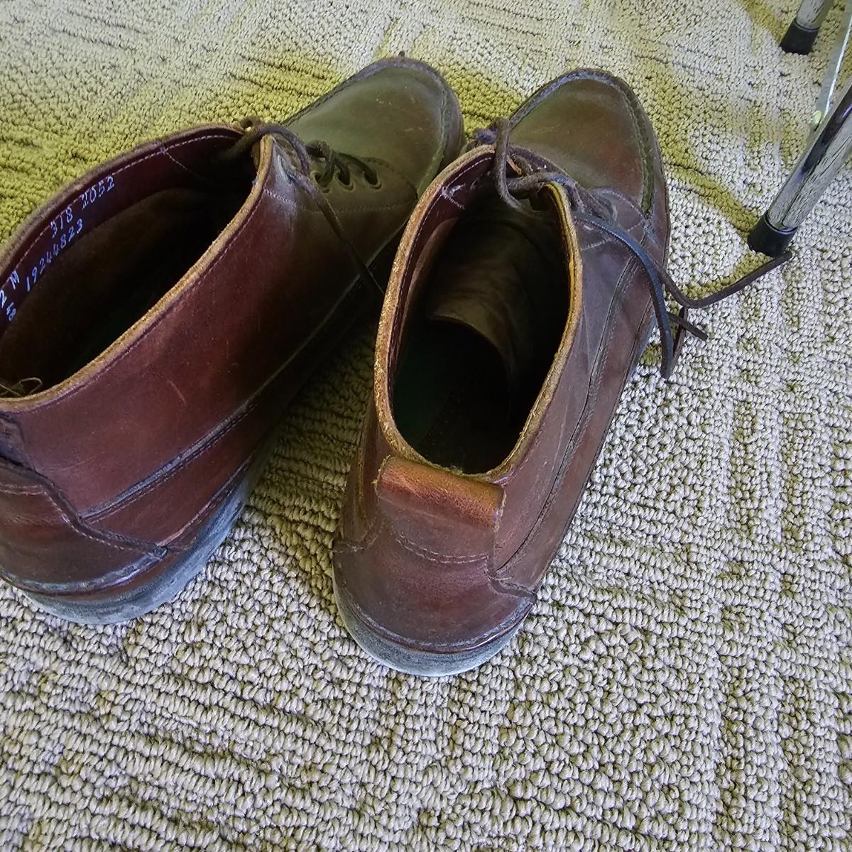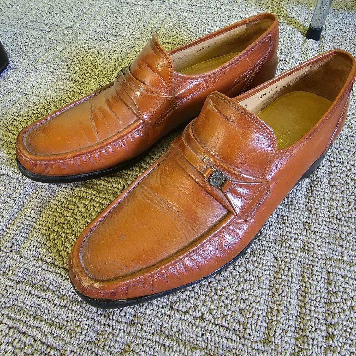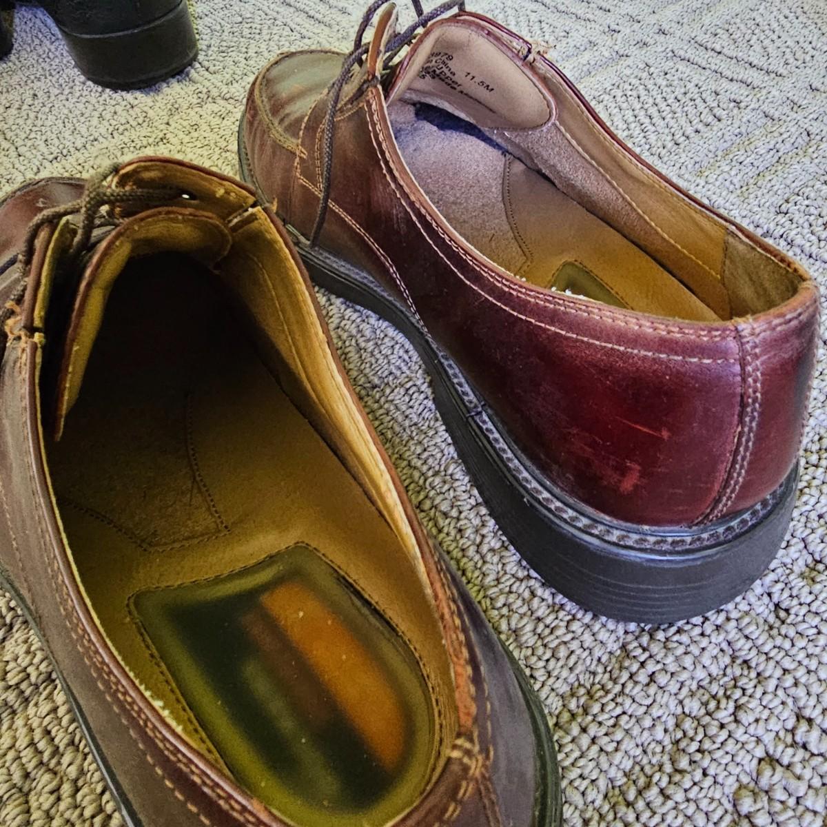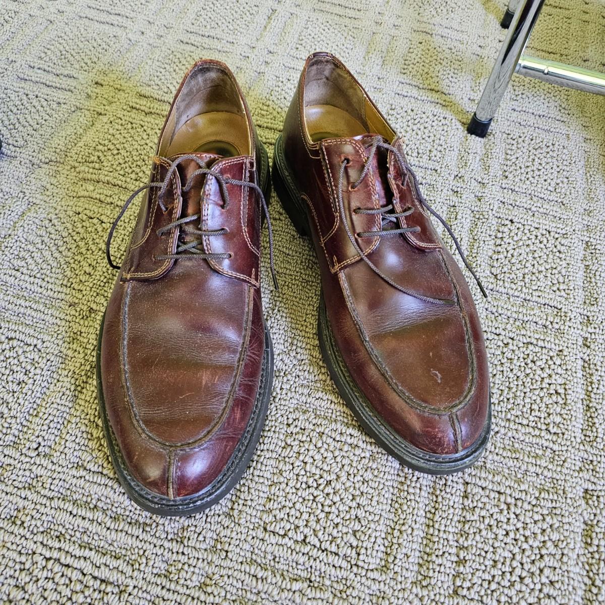 Seven pair of mens size 12 shoes and sandals. Oxfords, wingtips, boots, black and brown/tan. Includes one steel shoe rack, 25" x 9" x 27"H, and a vintage shoe shine measures 12" x 8" x 10". Box has accessories included, but we cannot verify the contents. See photos for details. Shipping available.