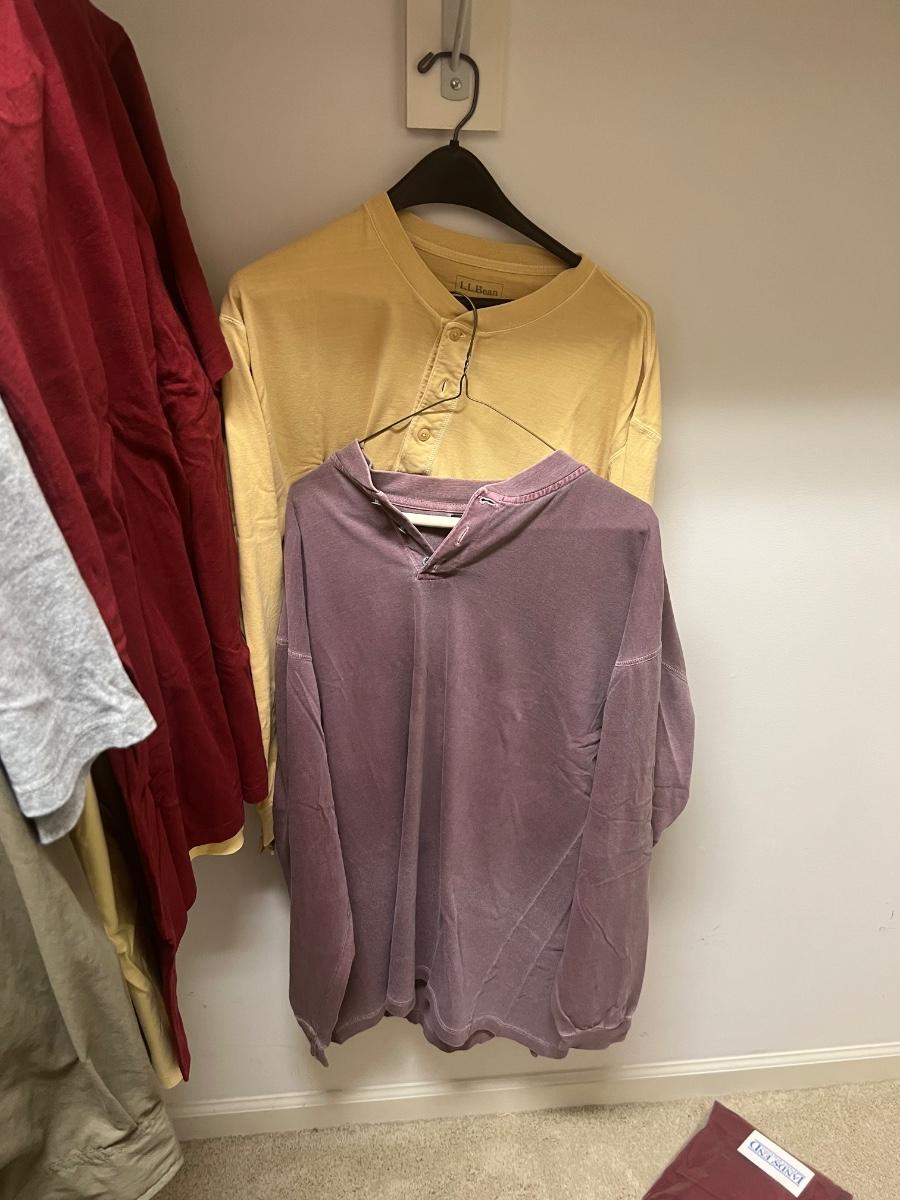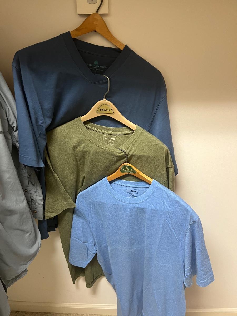 Great brand names in this large lot of men’s shirts that includes long and short sleeve, button down and tee’s. Also includes two new shirts still in packaging. Any wooden hangers shown in images are not included.