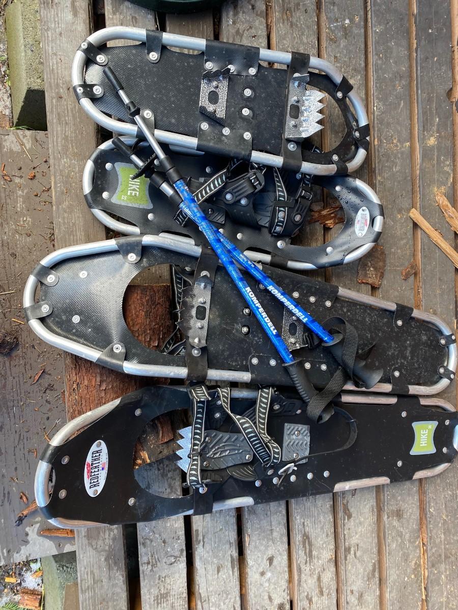 Mens snowshoes, fits up to a size 14. Made by Redfeather. Lightly used, in great condition. Includes a set of adjustable snow hiking poles by Komperdell. Pair on the bottom in second pic.
