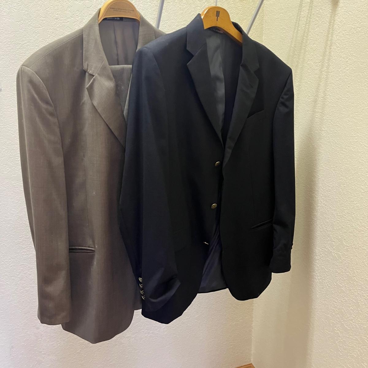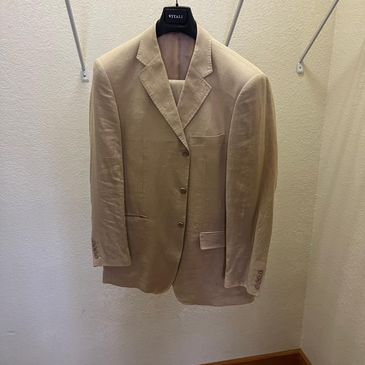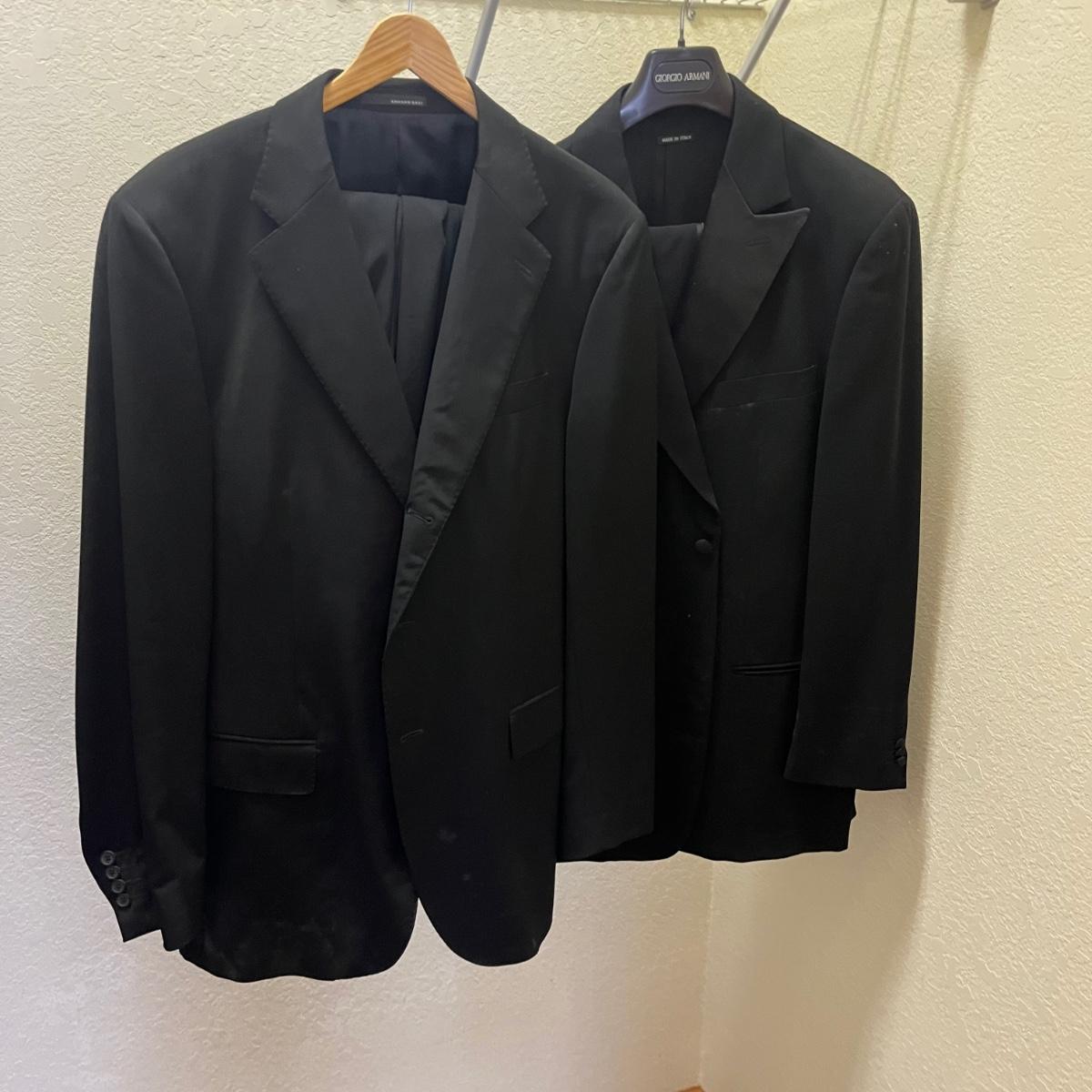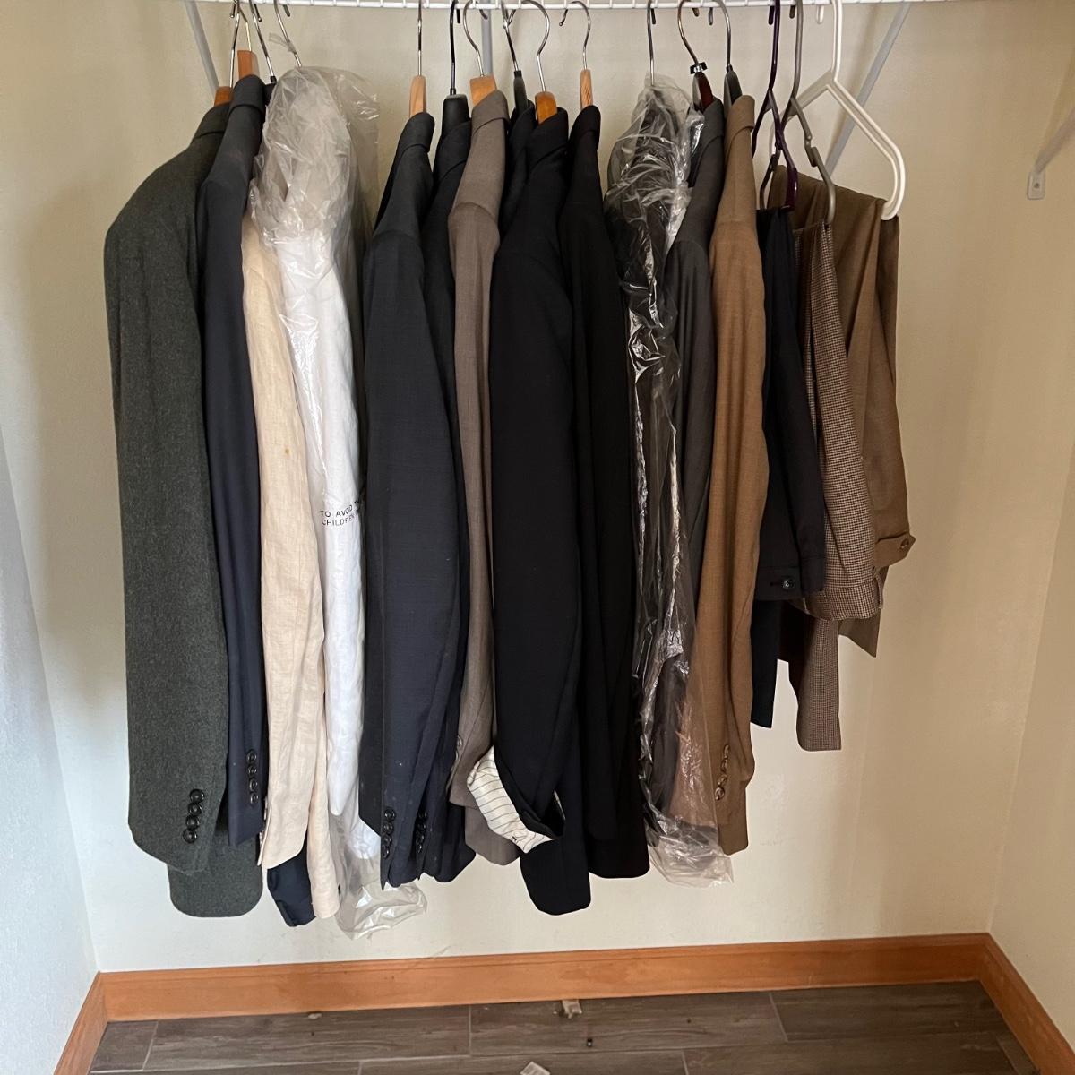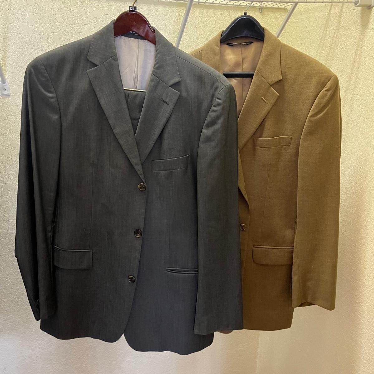 Lot contains a selection of men’s suits and coats including Armani tuxedo, Jos A Banks, Giovanni linen suit, Hugo Boss suit, Vitali Linen suit, Pierre Cardin and more. Most suits appear to be size 43-44. Suits have been in a non climate controlled area and could use a cleaning.
