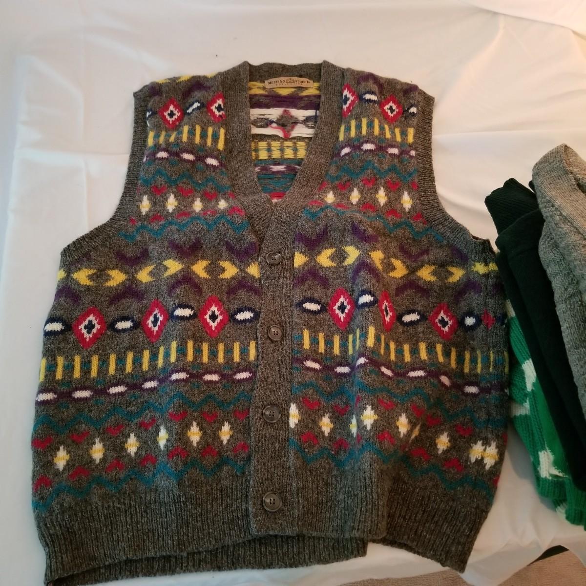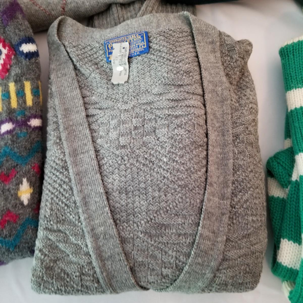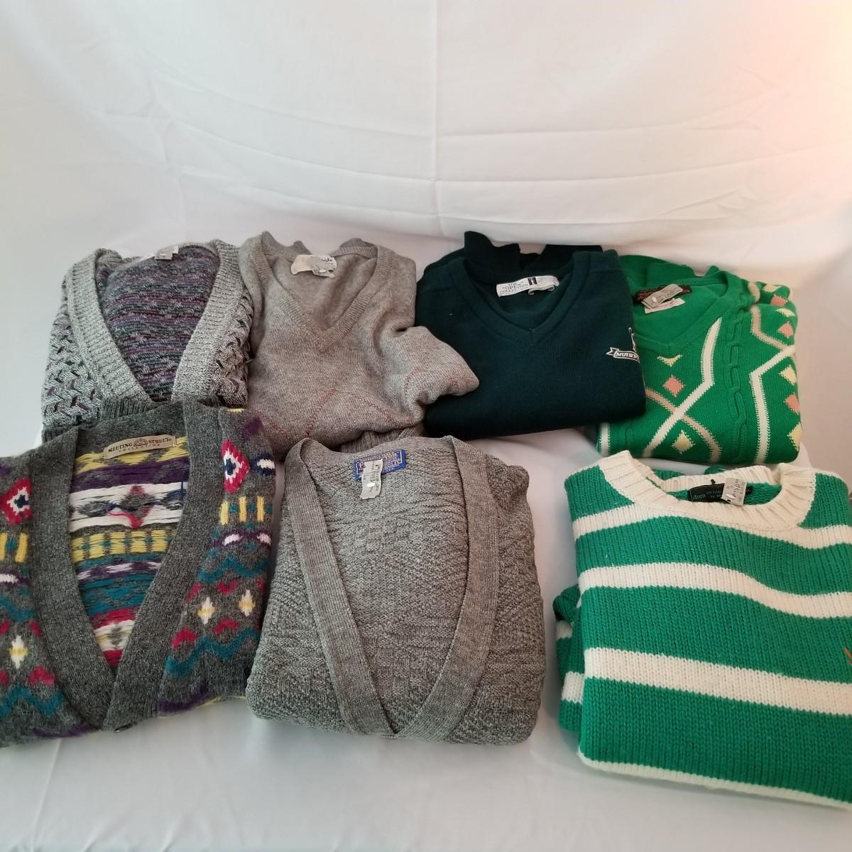 Six sweaters and one sweater vest. Various brands (including Pendleton) and colors. Knits and wool. Size large. See photos for detail. Shipping available.