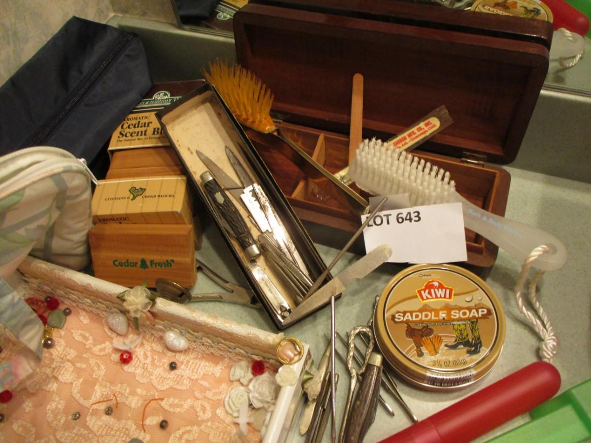 Cedar scent blocks, jewelry case, body brus, make-up travel bag, Pocket Knives