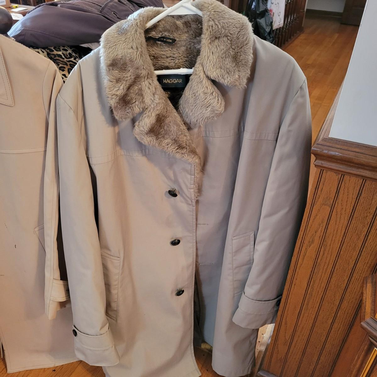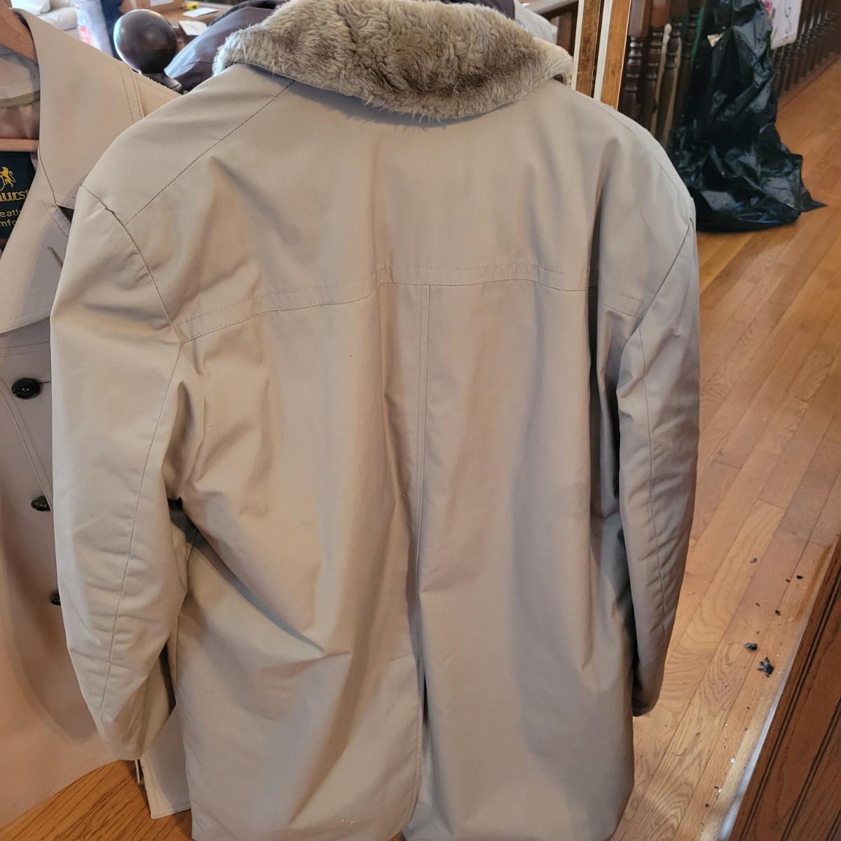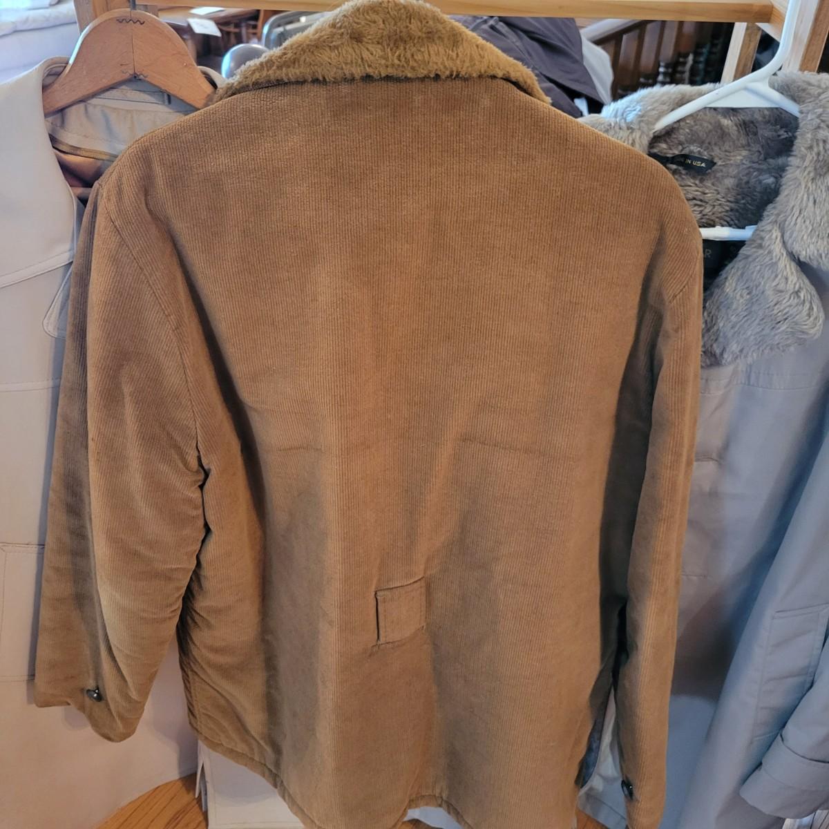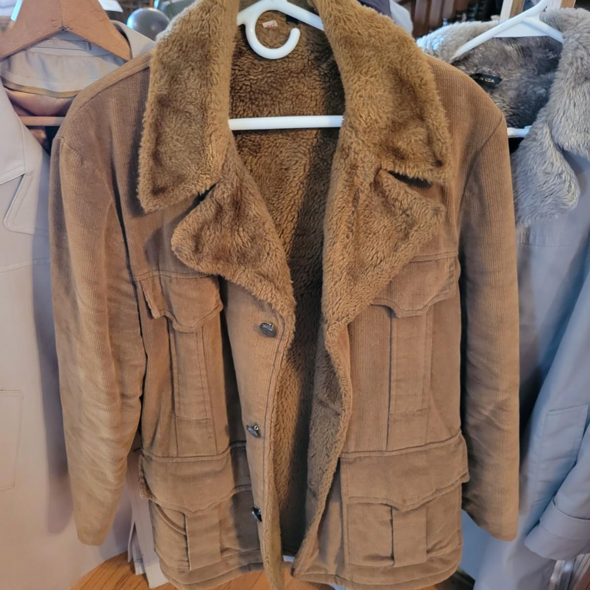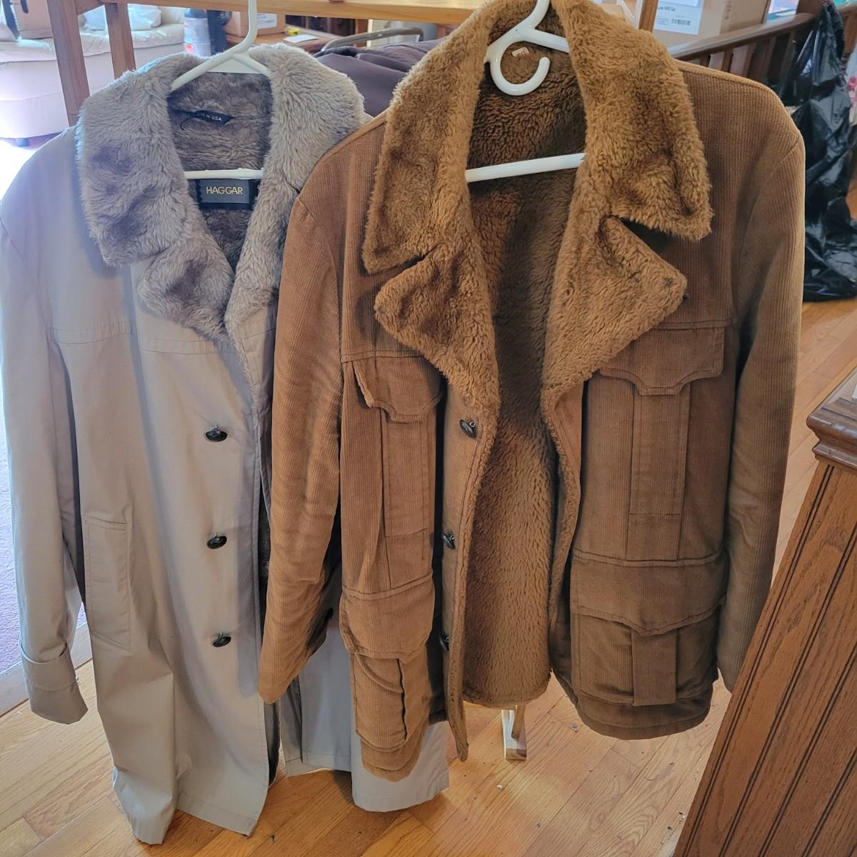 A pair of vintage men's coats. Lot includes a corduroy coat with a heavy fleece interior and collar. Also includes a rain jacket with a fleece collar and interior. Both are sz40. Local pickup only