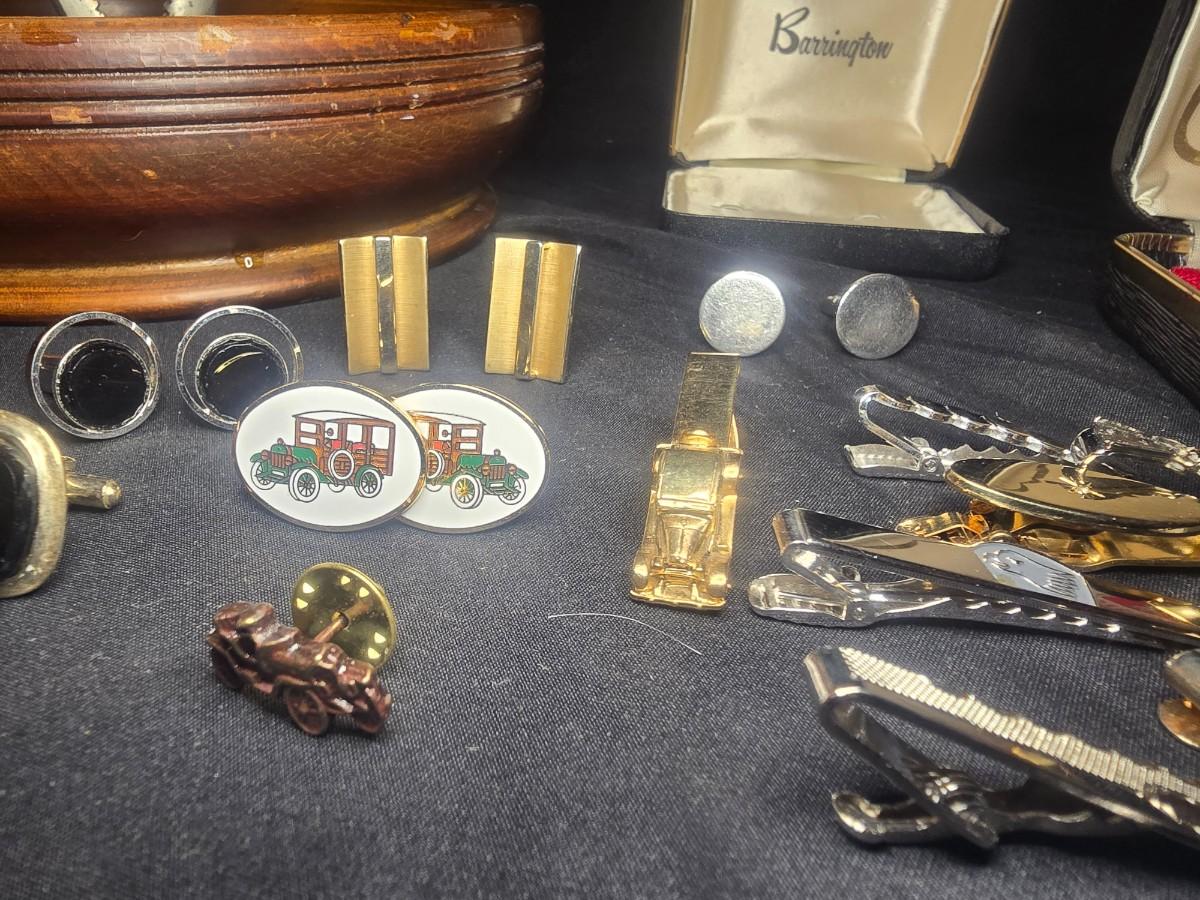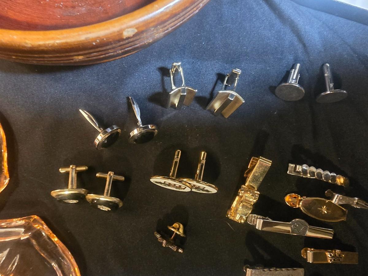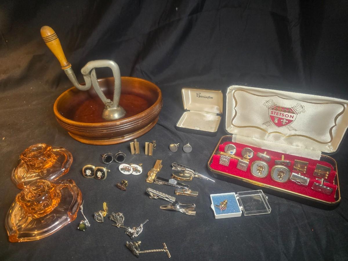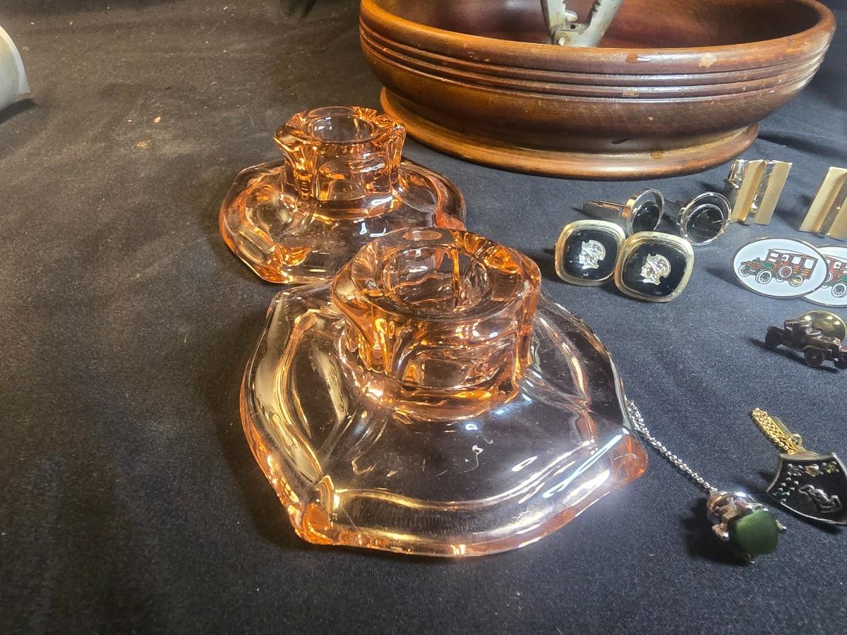 MEN'S VINTAGE JEWELRY, WOODEN NUT CRACKER BOWL AND DEPRESSION GLASS CANDLE HOLDERS