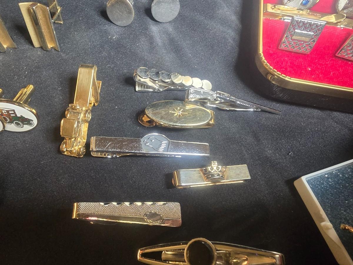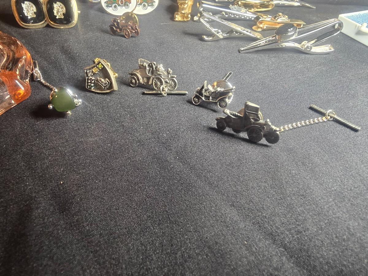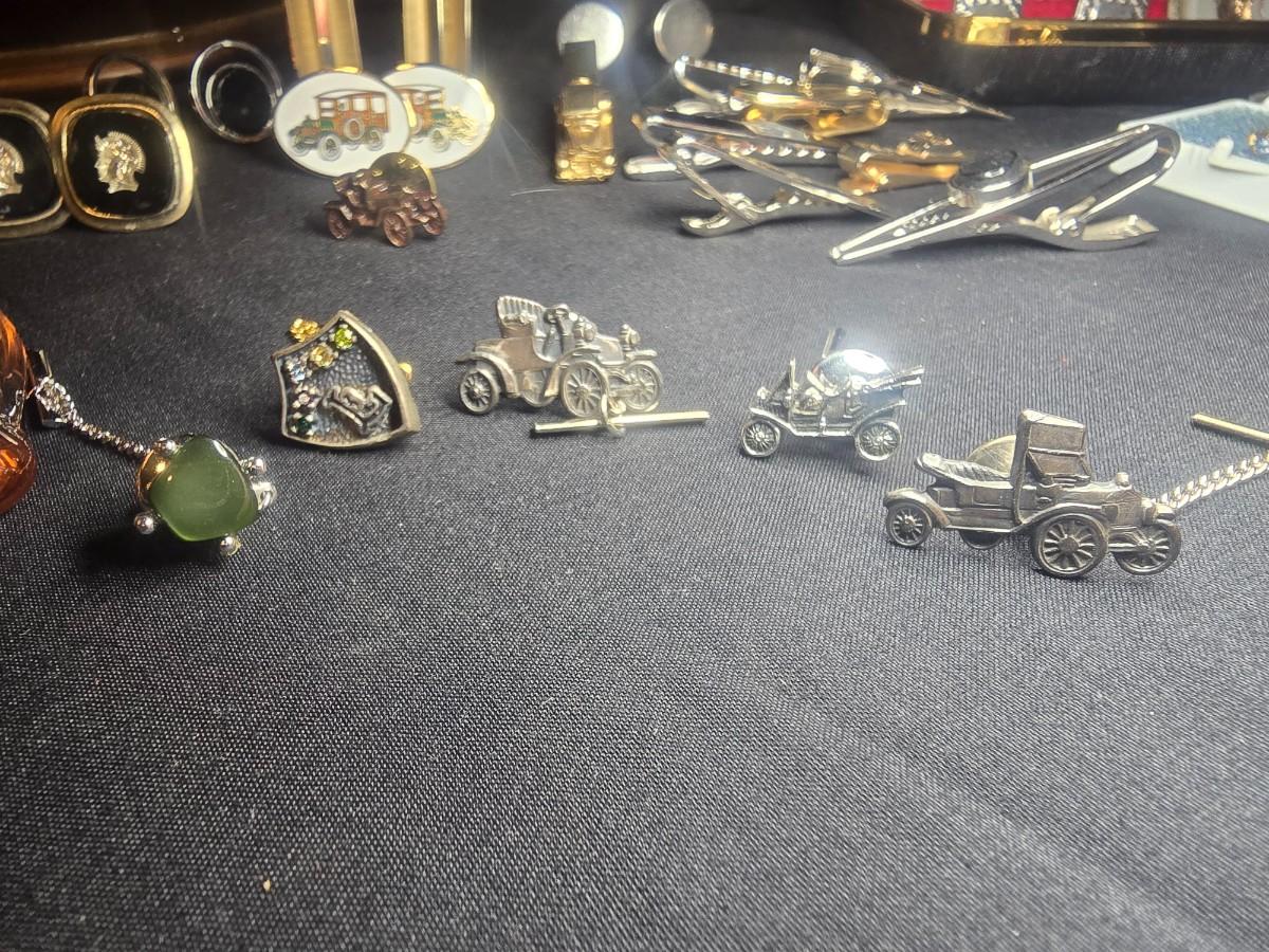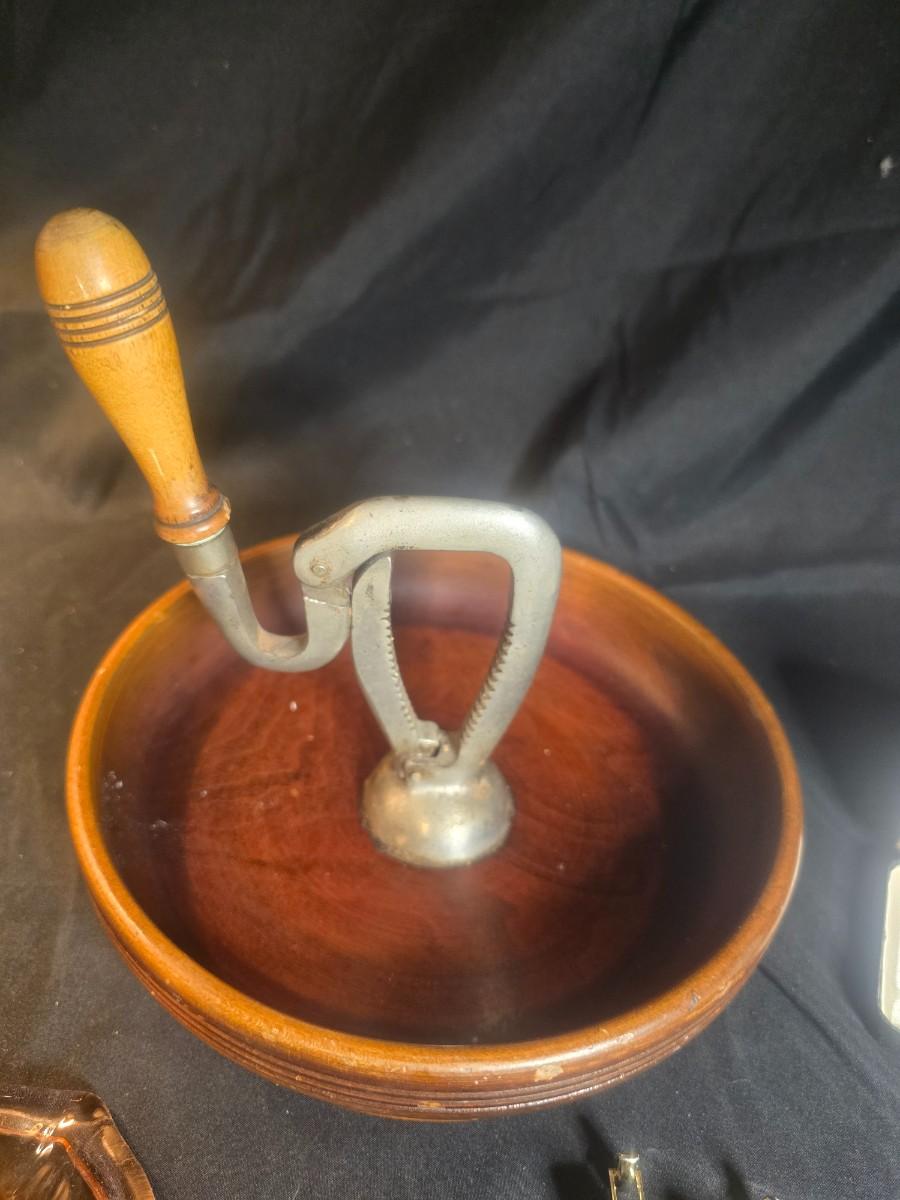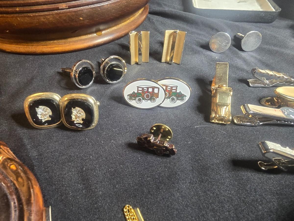 MEN'S VINTAGE JEWELRY, WOODEN NUT CRACKER BOWL AND DEPRESSION GLASS CANDLE HOLDERS
