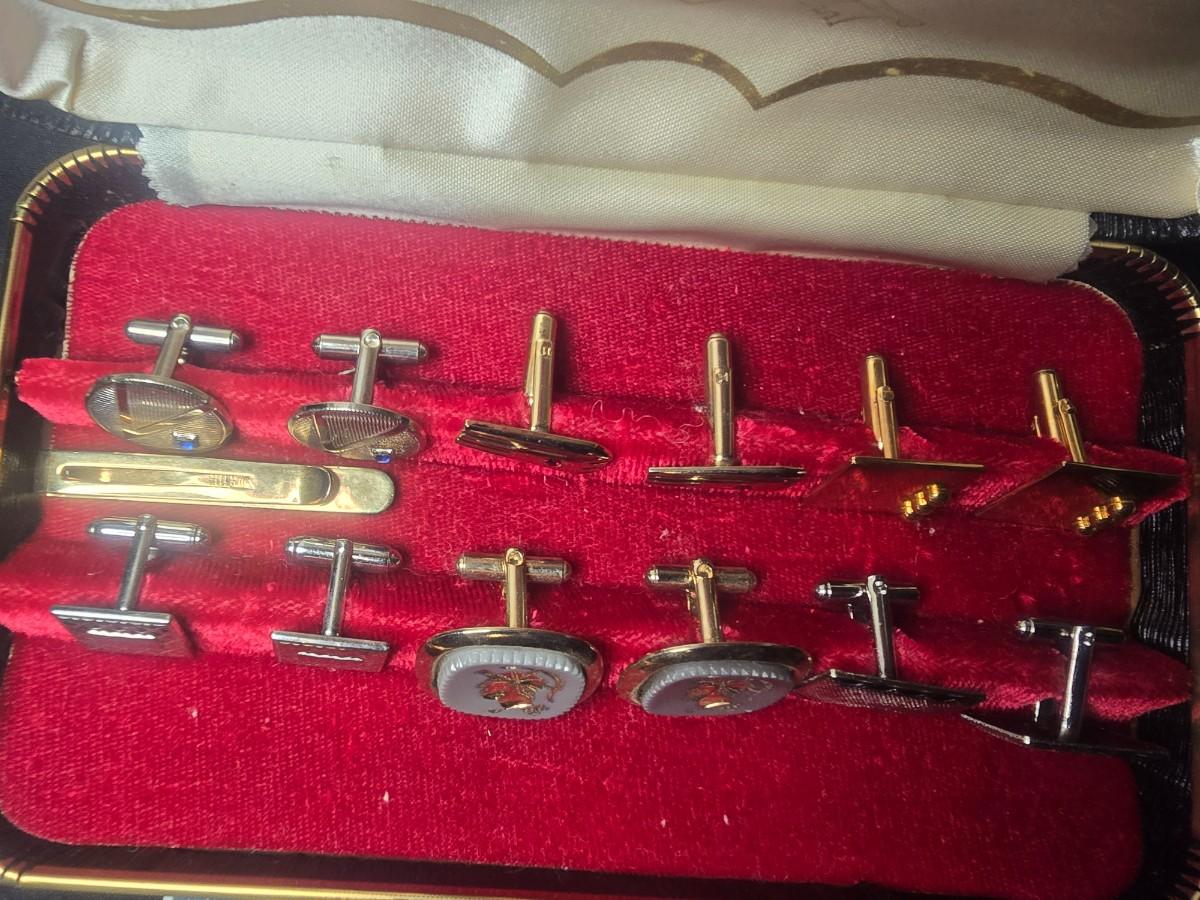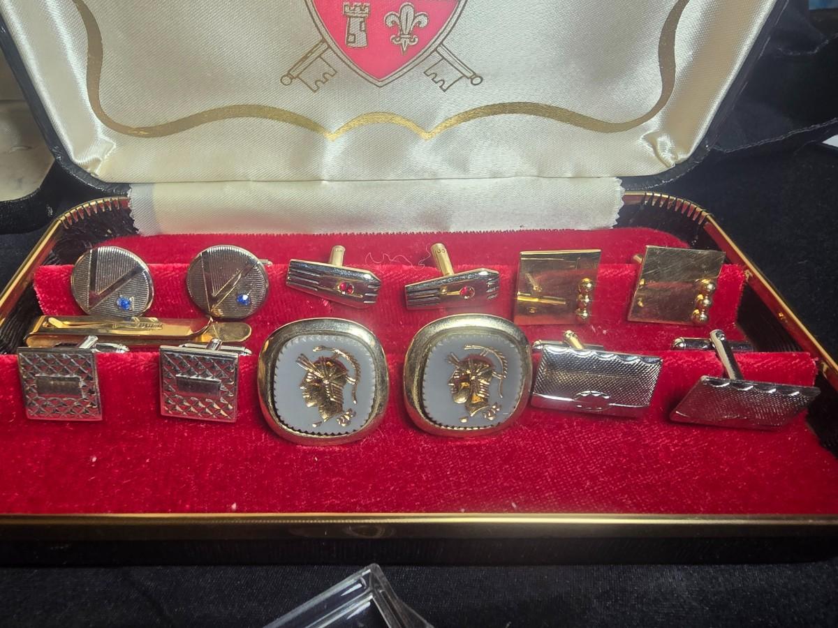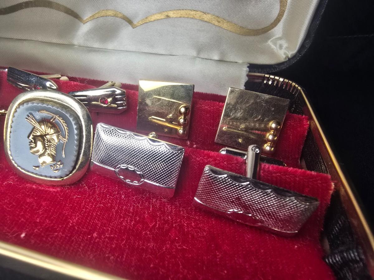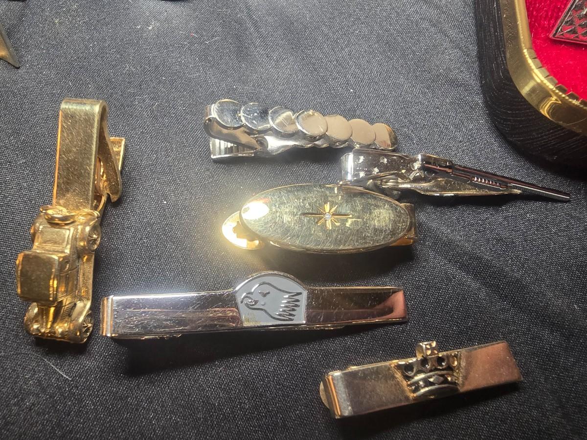 MEN'S VINTAGE JEWELRY, WOODEN NUT CRACKER BOWL AND DEPRESSION GLASS CANDLE HOLDERS
