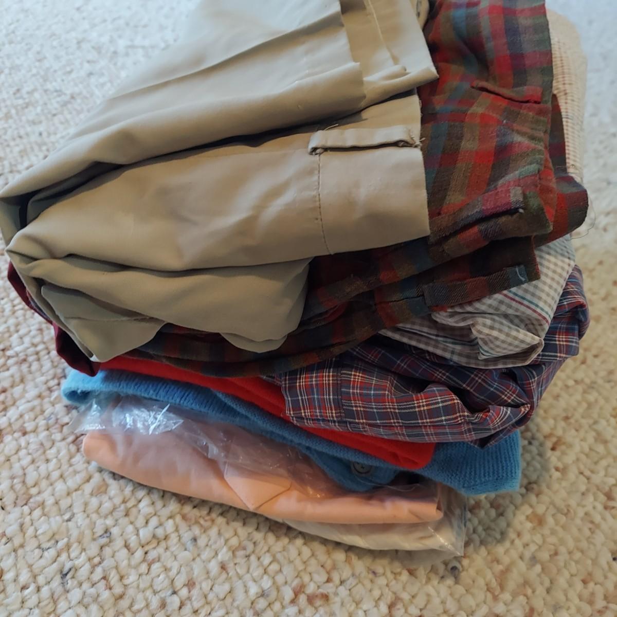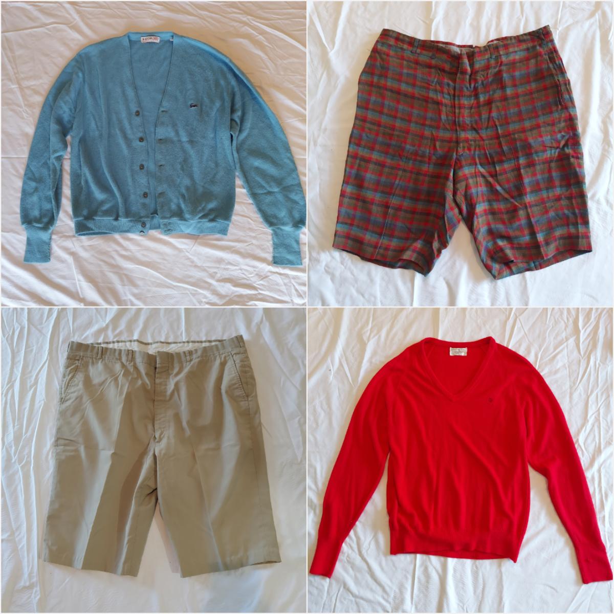 Several pieces of men's vintage sportswear in large sizes. Lot includes fives pairs of shorts, three shirts and two sweaters that includes a red Christian Dior sweater.. Pants have approximately a 40” waist. Please see photos for details. Shipping available
