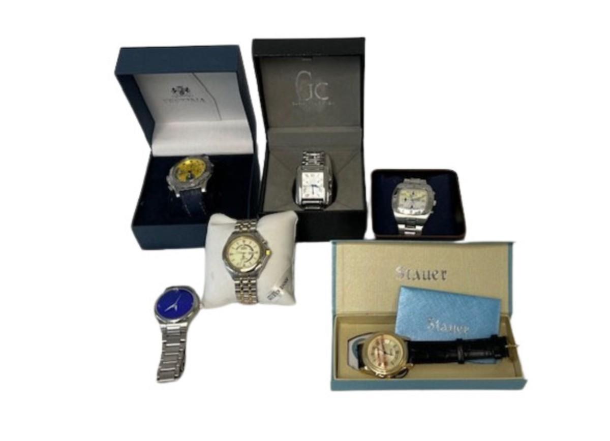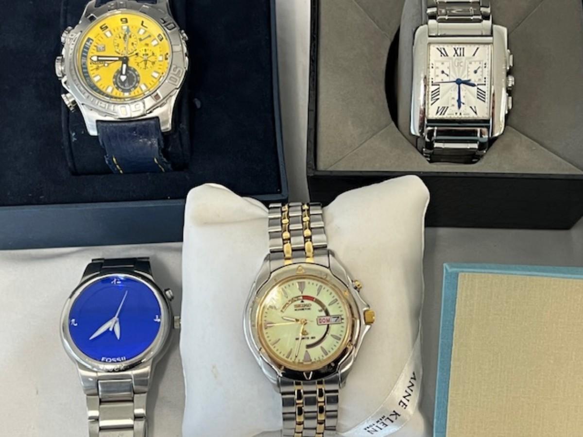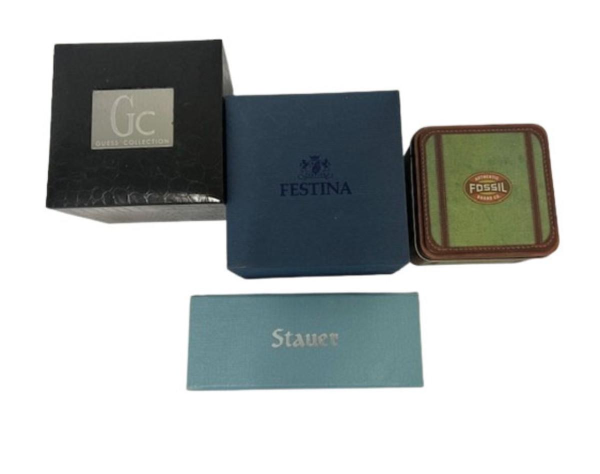 Includes Guess, Festina, Fossil x2, Seiko, and Staeur (NOS). Total of 6 pieces. Not tested. [RG]