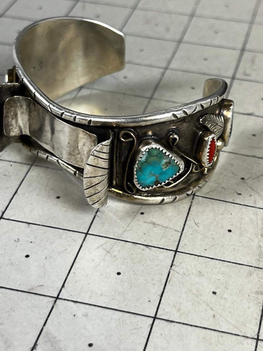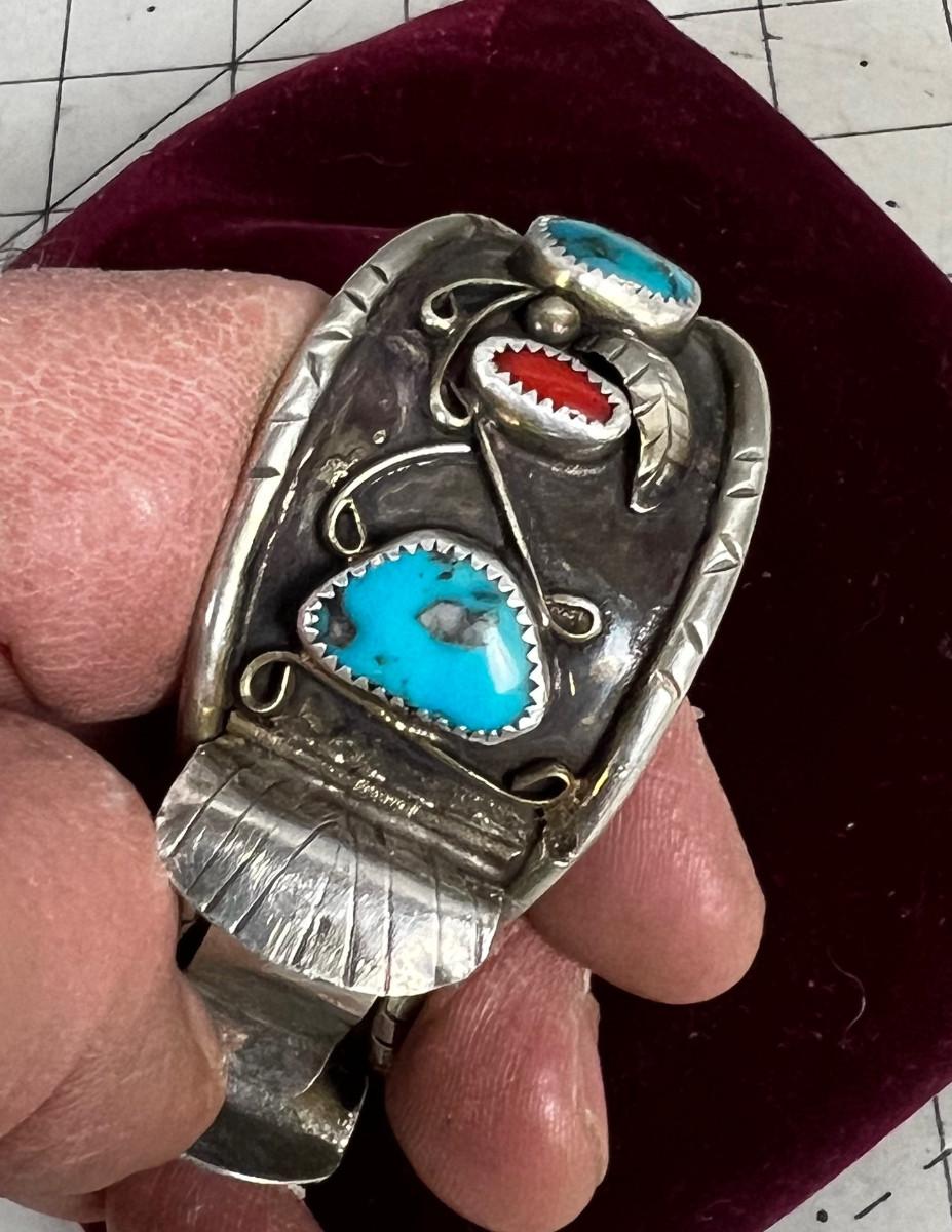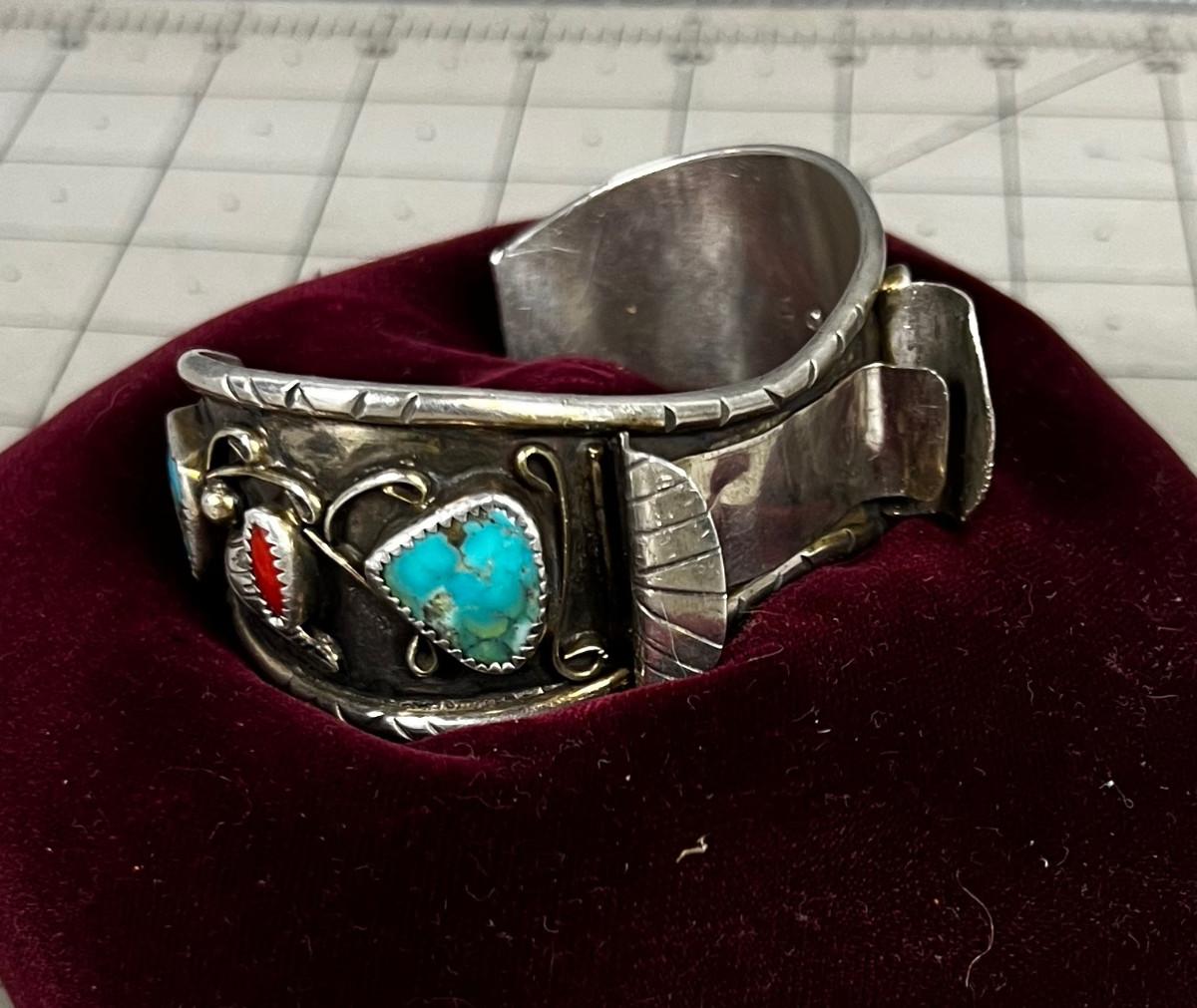 Men's Watch Cuff Turquoise, Coral and Silver Marked OJ