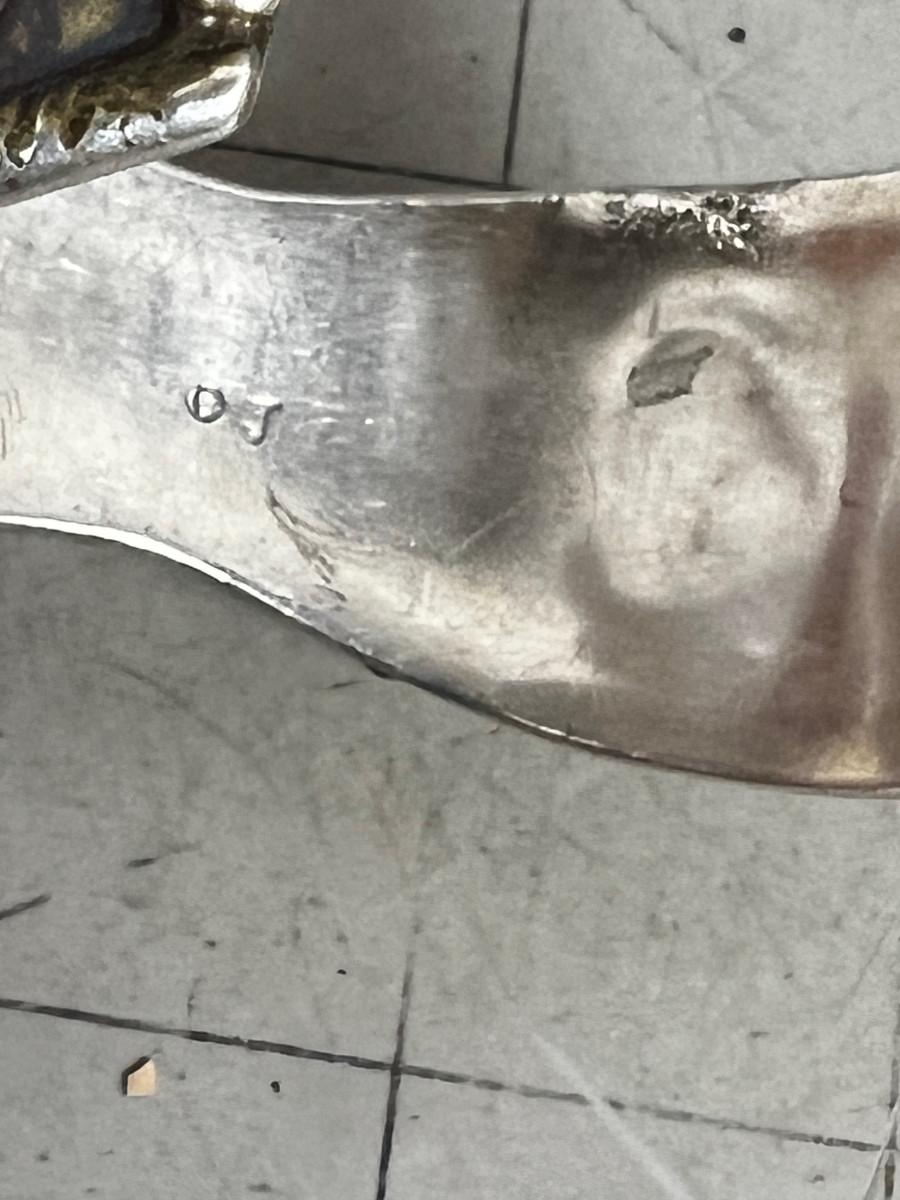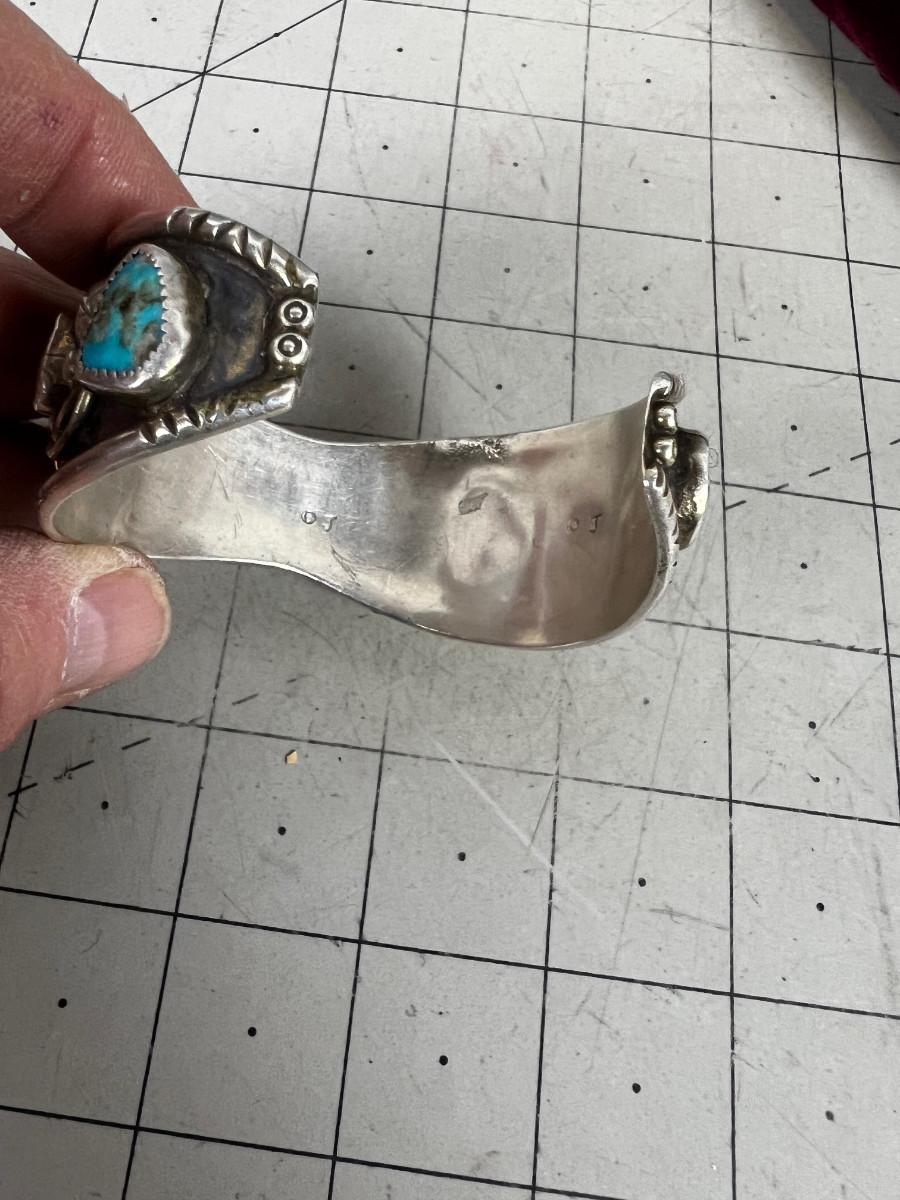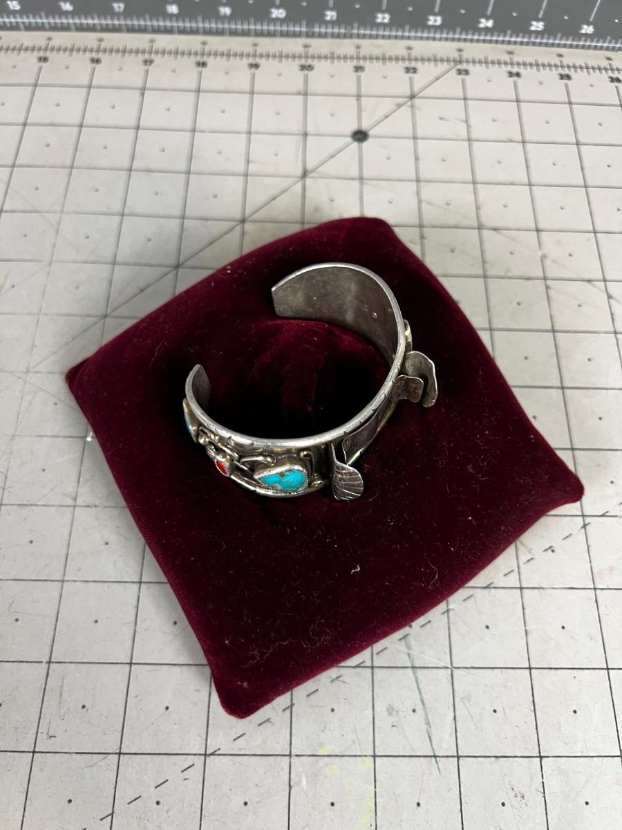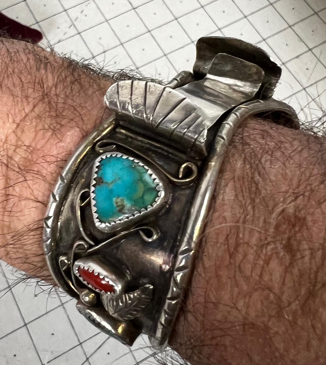 Men's Watch Cuff Turquoise, Coral and Silver Marked OJ