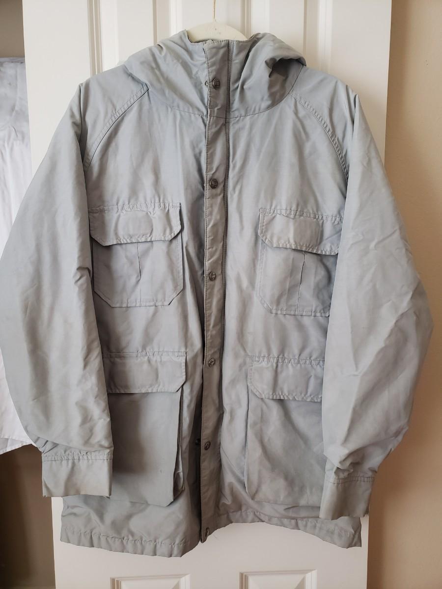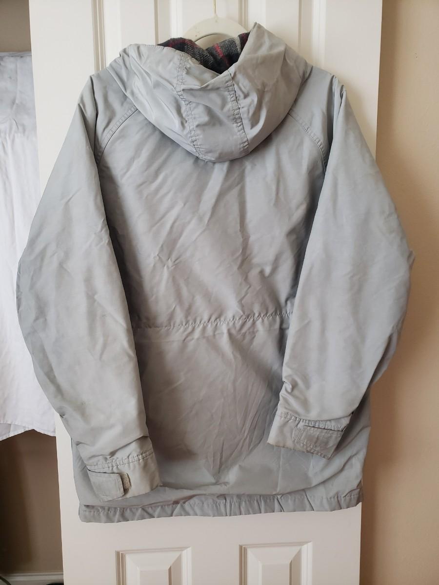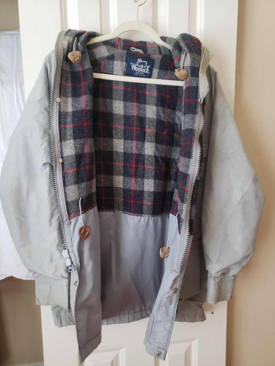 Mens Woolrich wool lined Coat. Front zip & snap closure with hood size L