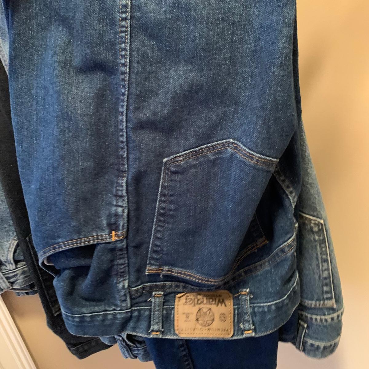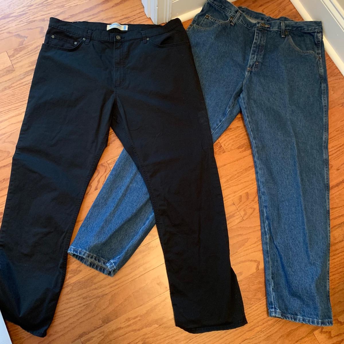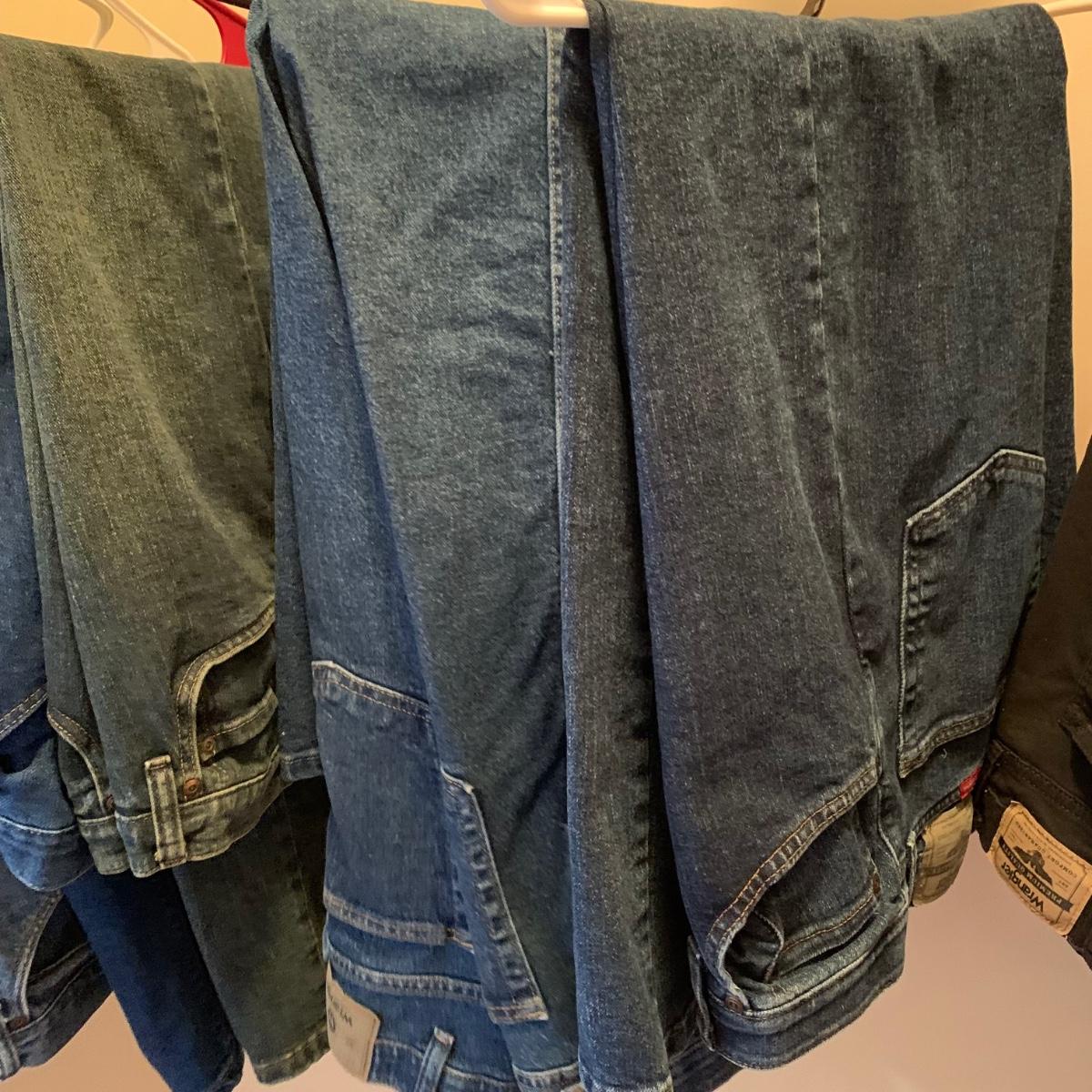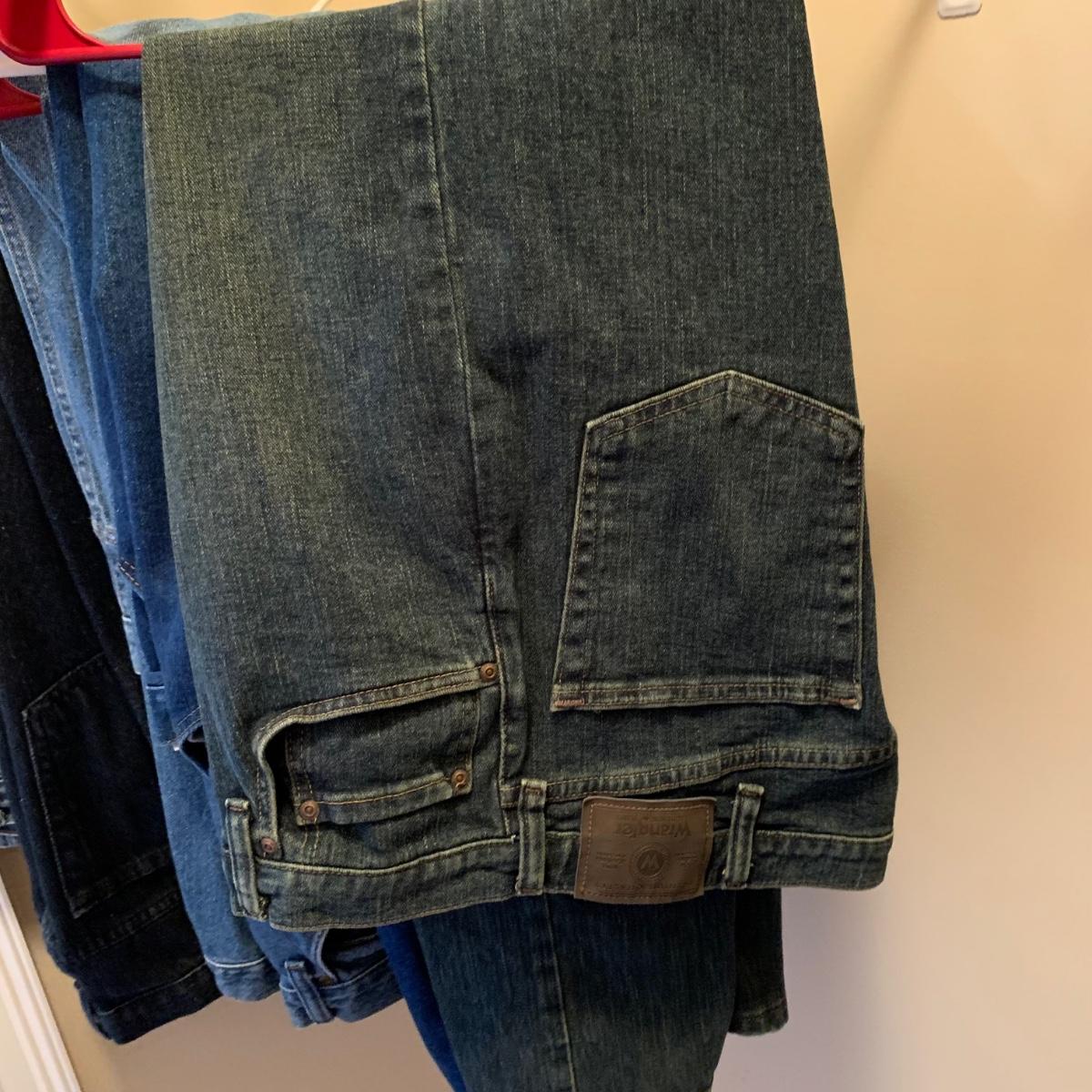 Ten pairs of men’s jeans that are size 38x30 and 40x30. Seven of the ten are Wrangler brand. Jeans vary from shades of blue to black.