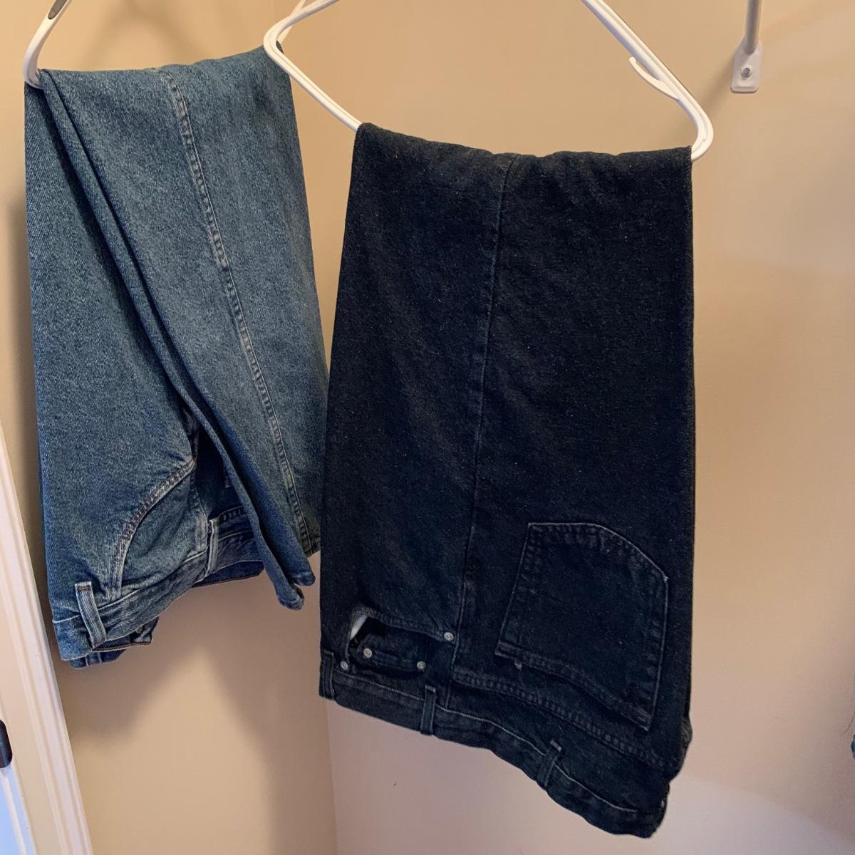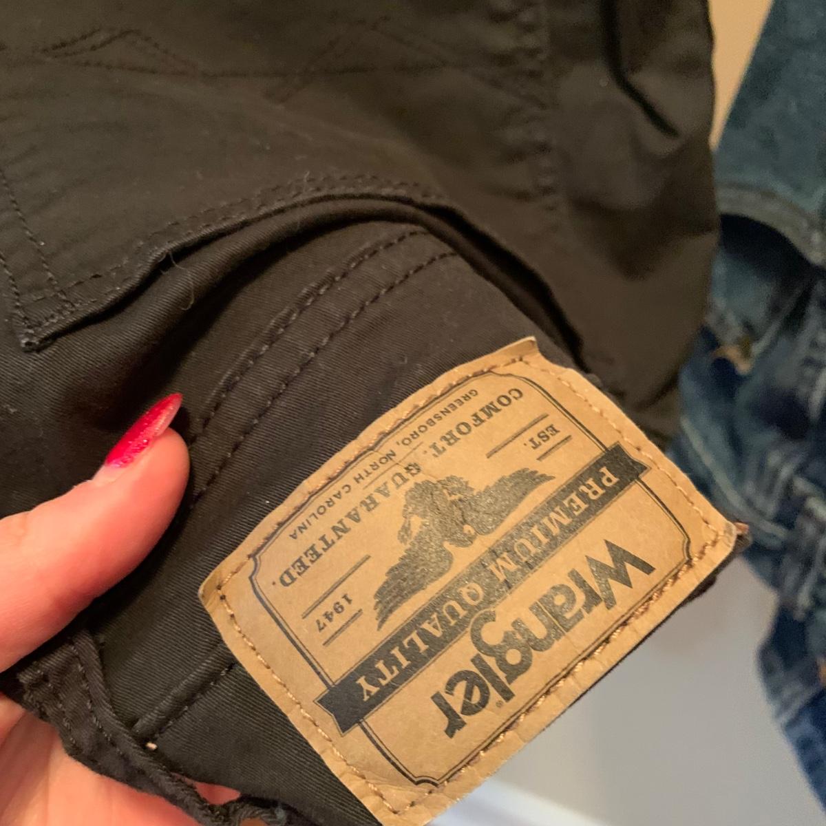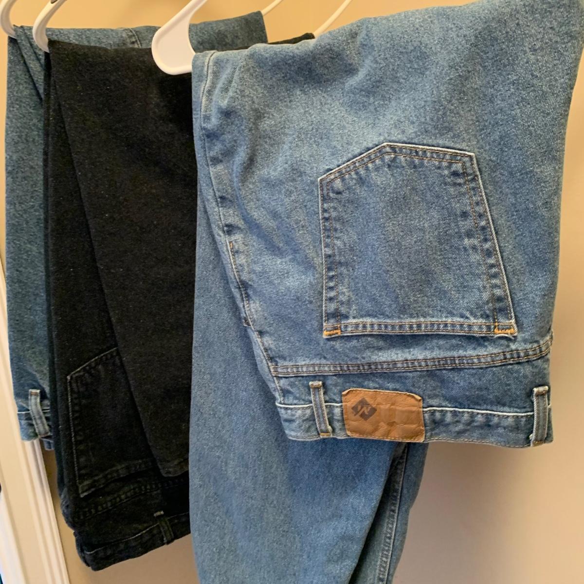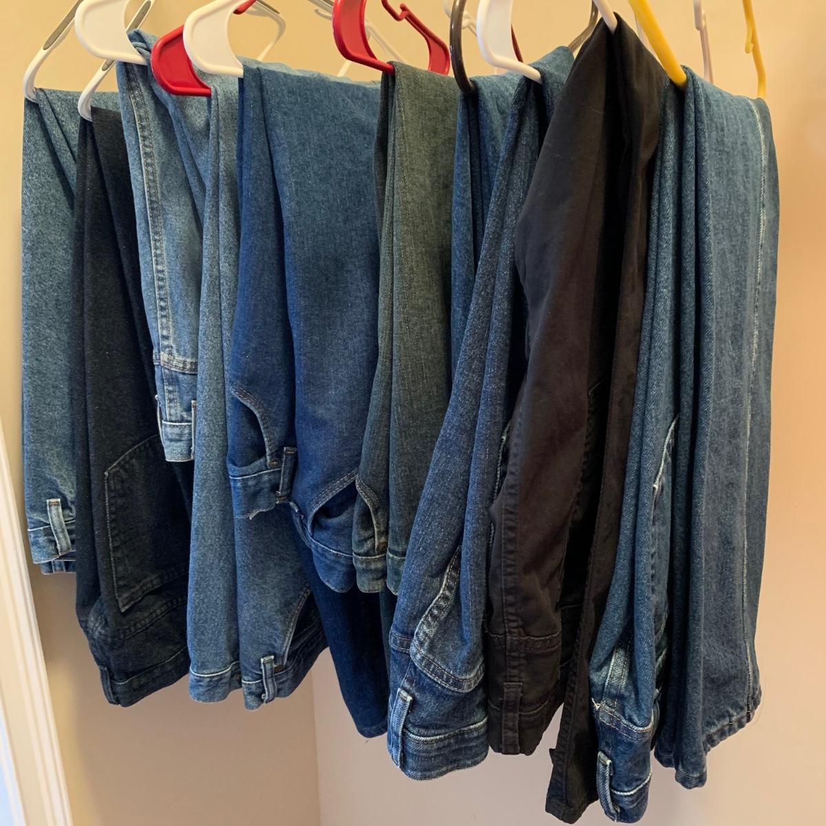 Ten pairs of men’s jeans that are size 38x30 and 40x30. Seven of the ten are Wrangler brand. Jeans vary from shades of blue to black.