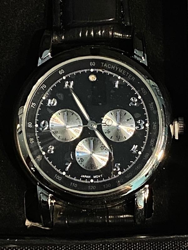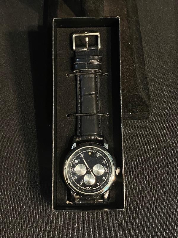 Silvertone and Black Mens Wristwatch from Avon. In original box. Unfortunately it seems the battery has died. Still has the plastic protector on the face and instruction booklet.