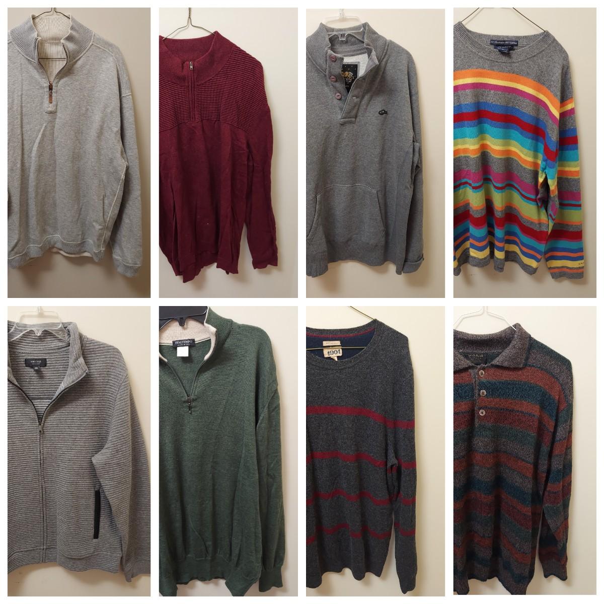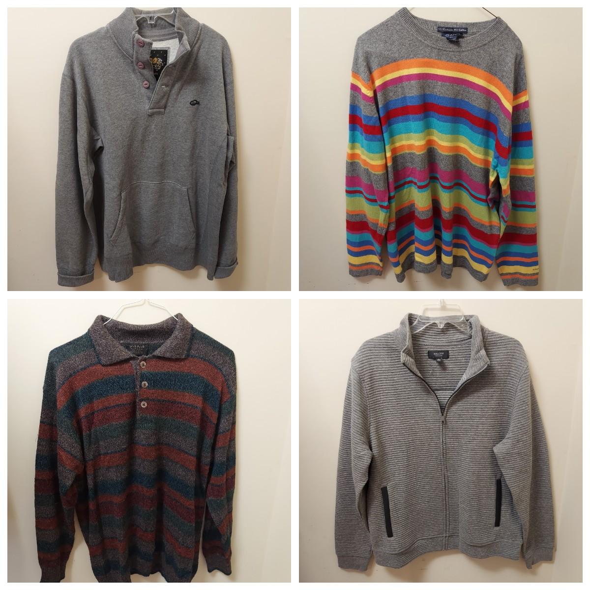 Lot includes eight sweaters and henleys in mostly size XL. Brands include Roots, Tommy Bahama, Nordstrom and more. Some Cashmere and Merino wool pieces. Please see photos for details. Shipping available