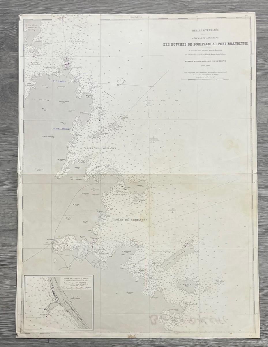 Description: : MER MEDITERRANEE / COTE EST DE SARDAIGNE/ DES BOUCHES DE BONIFACIO AU PORT BRANDINCHI/ du commandant MAGNAHI de la marine Royale Italienne 1886 - Reproduction. Material: Paper Measurement approximate: 29" x 21” (Inches) Condition: Good