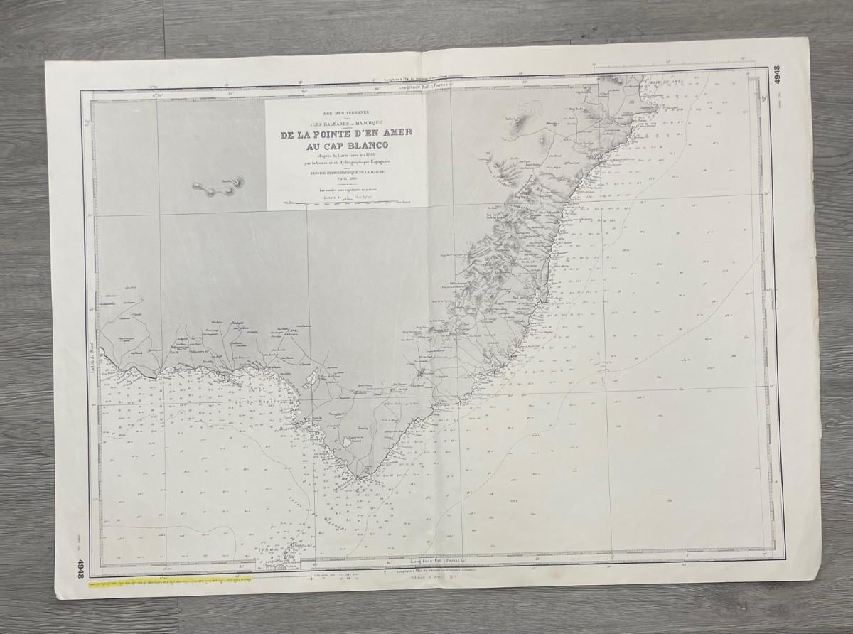 Description: MER MEDITERRANEE/ ILES BALEARES / MAJORQUE/ DE LA POINTE D'EN AMER AU CAP BLANCO/ d'apres la Carte levee en 1891/ SERVICE HYDROGRAPHQUE DE LA MARINE Paris 1896 - Reproduction.Material: Paper Measurement approximate: 29" x 21” (Inches). Condition: Good