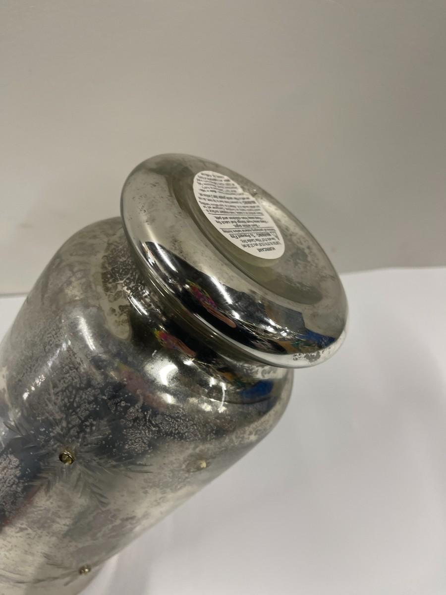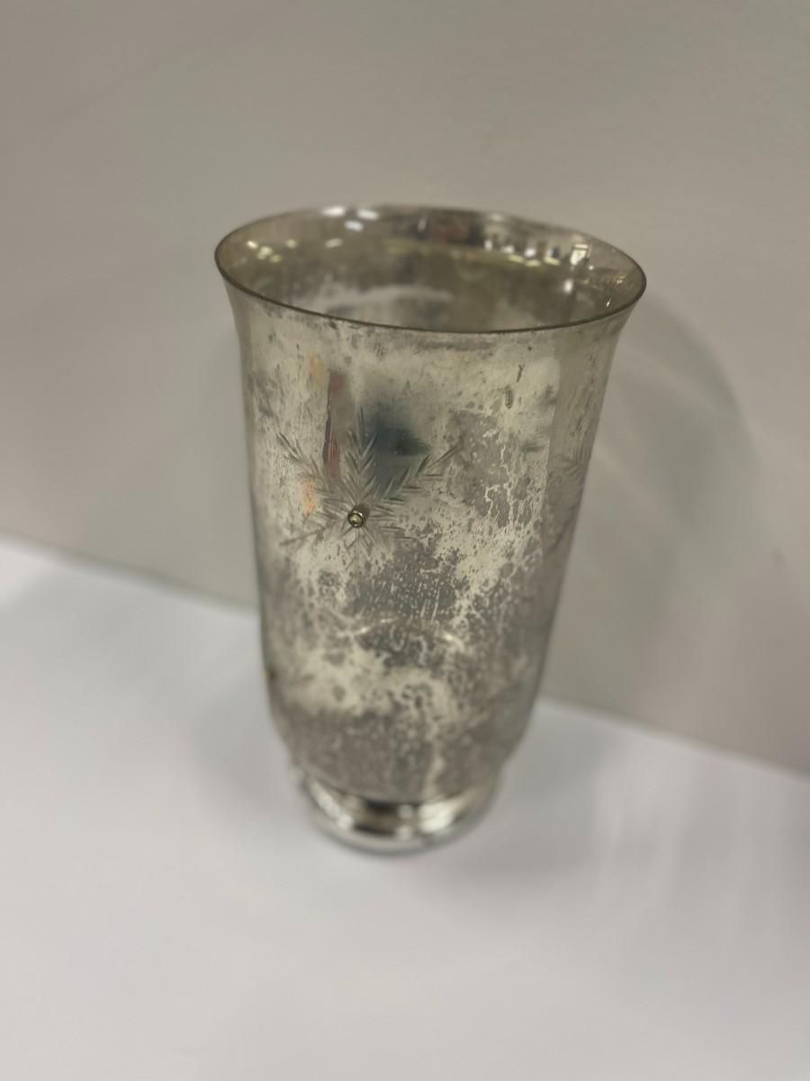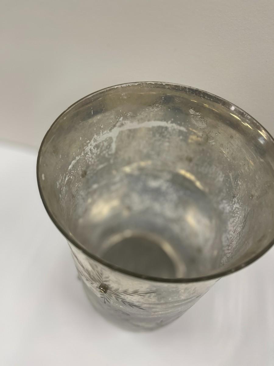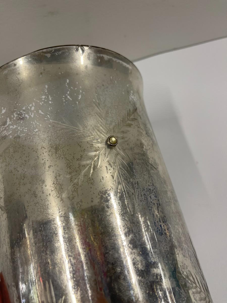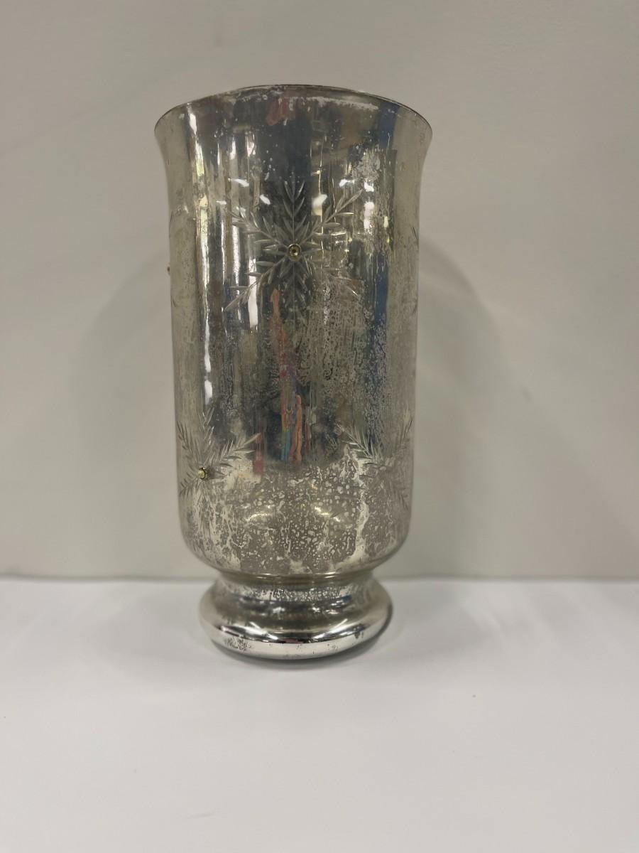 Mercury glass pillar candle holder with etched snowflake design and rhinestone embellishments. Excellent condition. 11" x 6". # 899