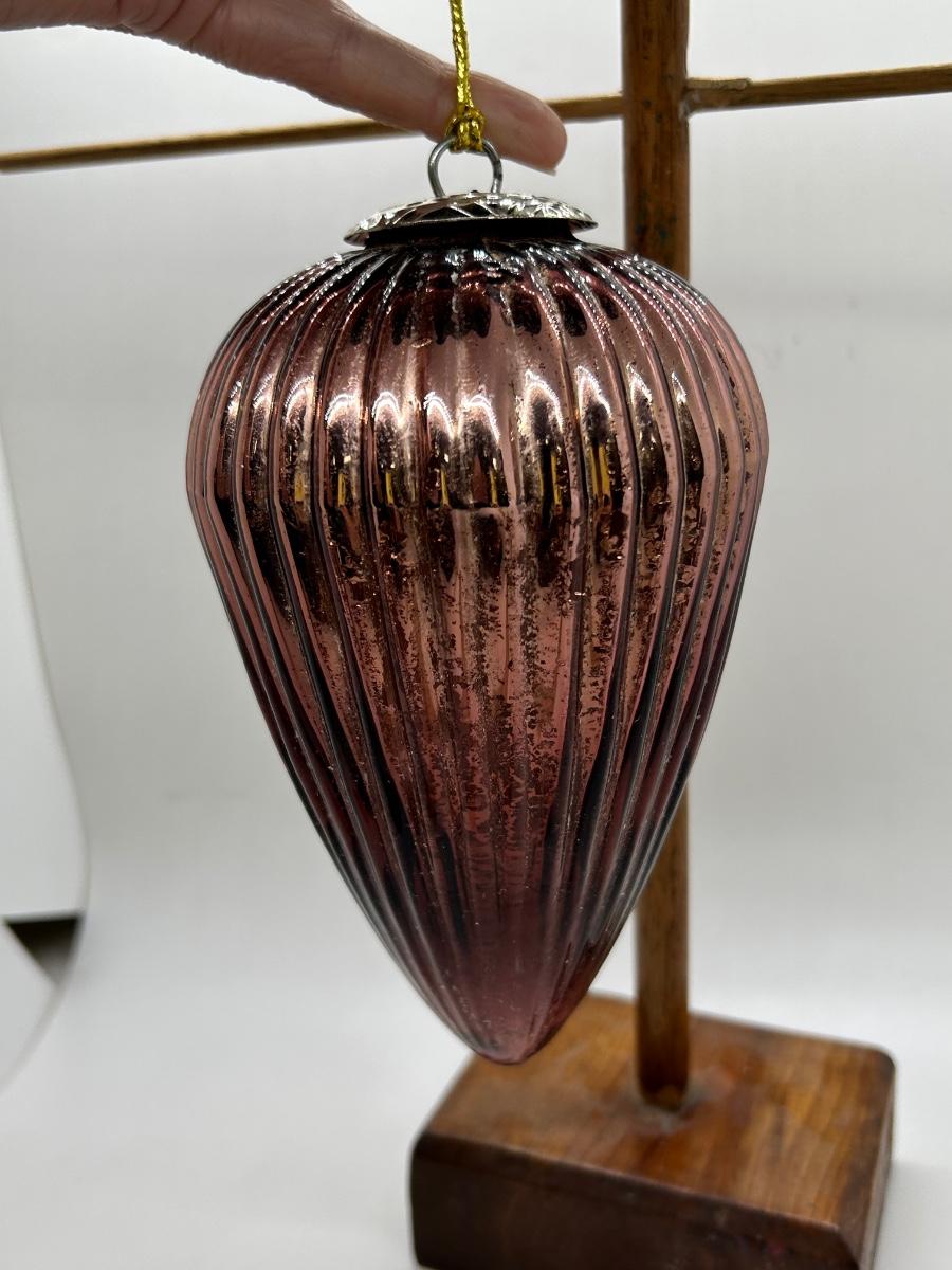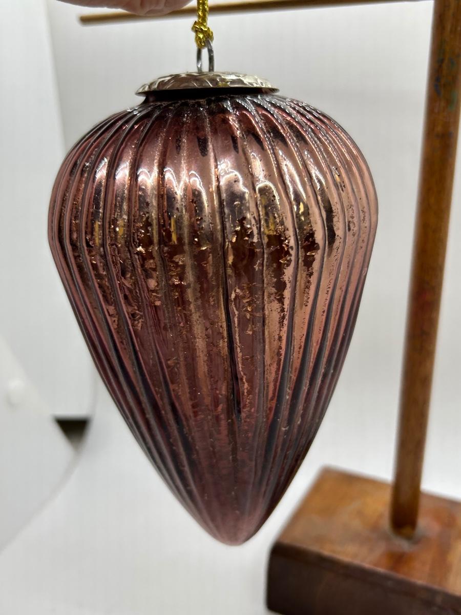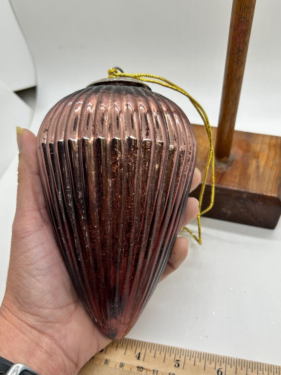 Mercury Glass Style Heavy Spinning Top Raindrop Shaped Christmas Holiday Tree Ornament Burgundy Brown Color. In good condition. Heavy. About 7" size.