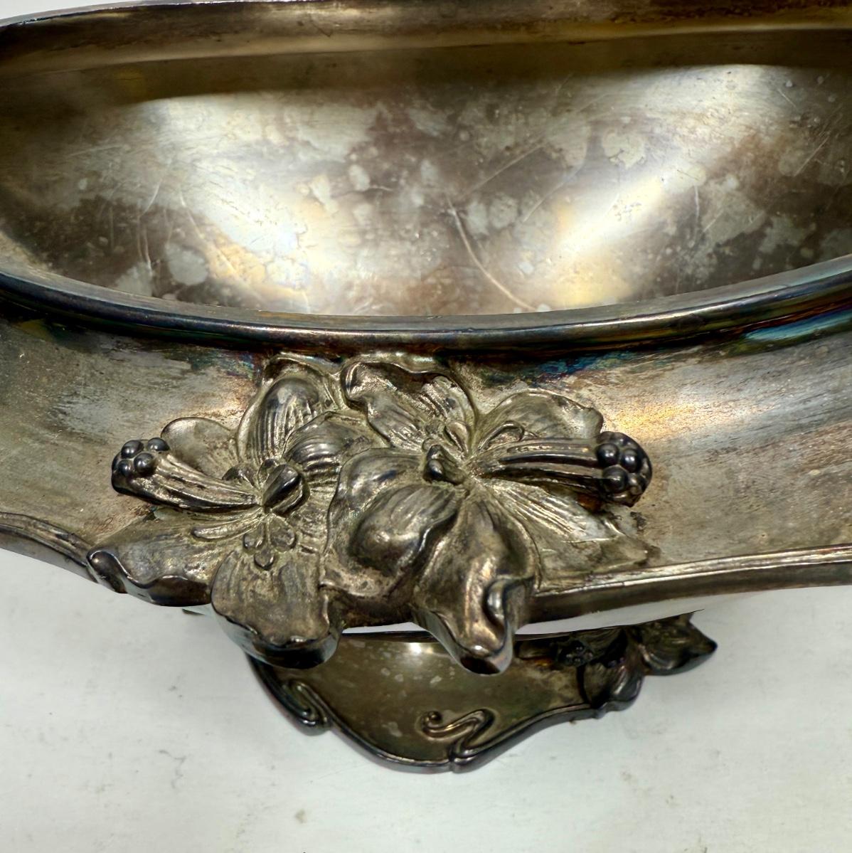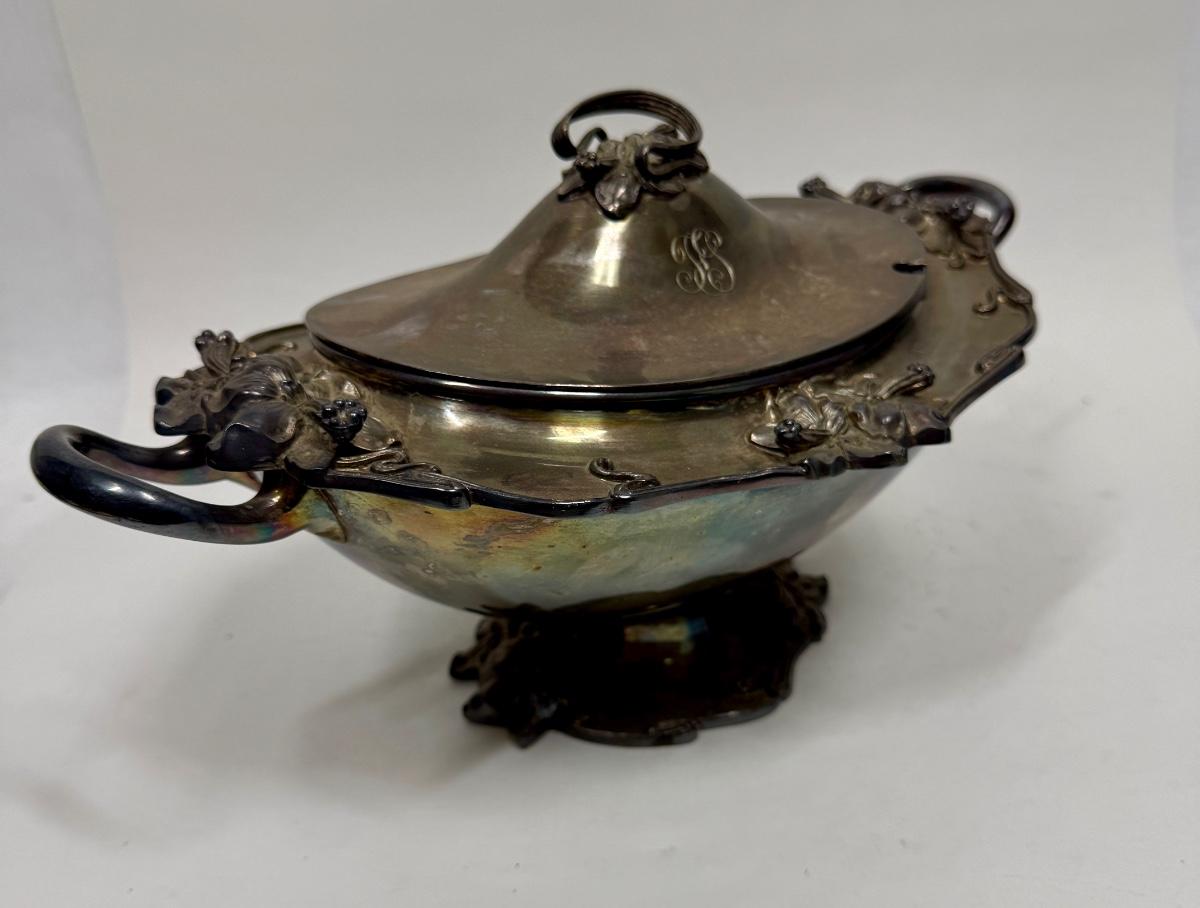 Meridian Silver Plate Company. Based on marks, this item was produced in 1865. Lid has a slot for a spoon, but note that a spoon is not included. Nice patina. Good condition. Approx. 14.5" long and 7.5" tall.