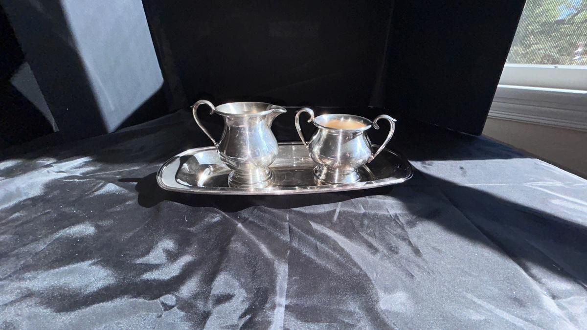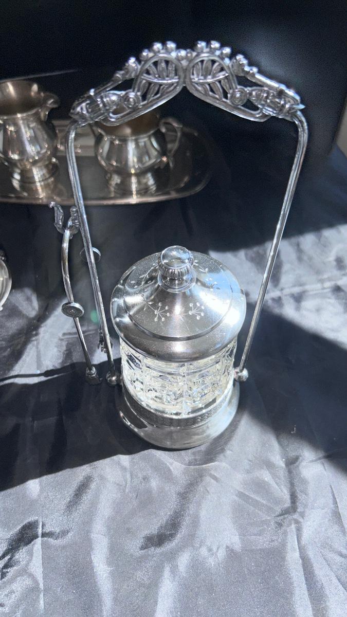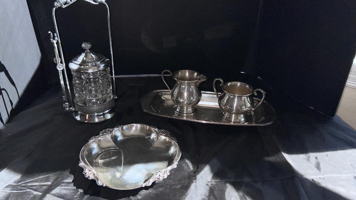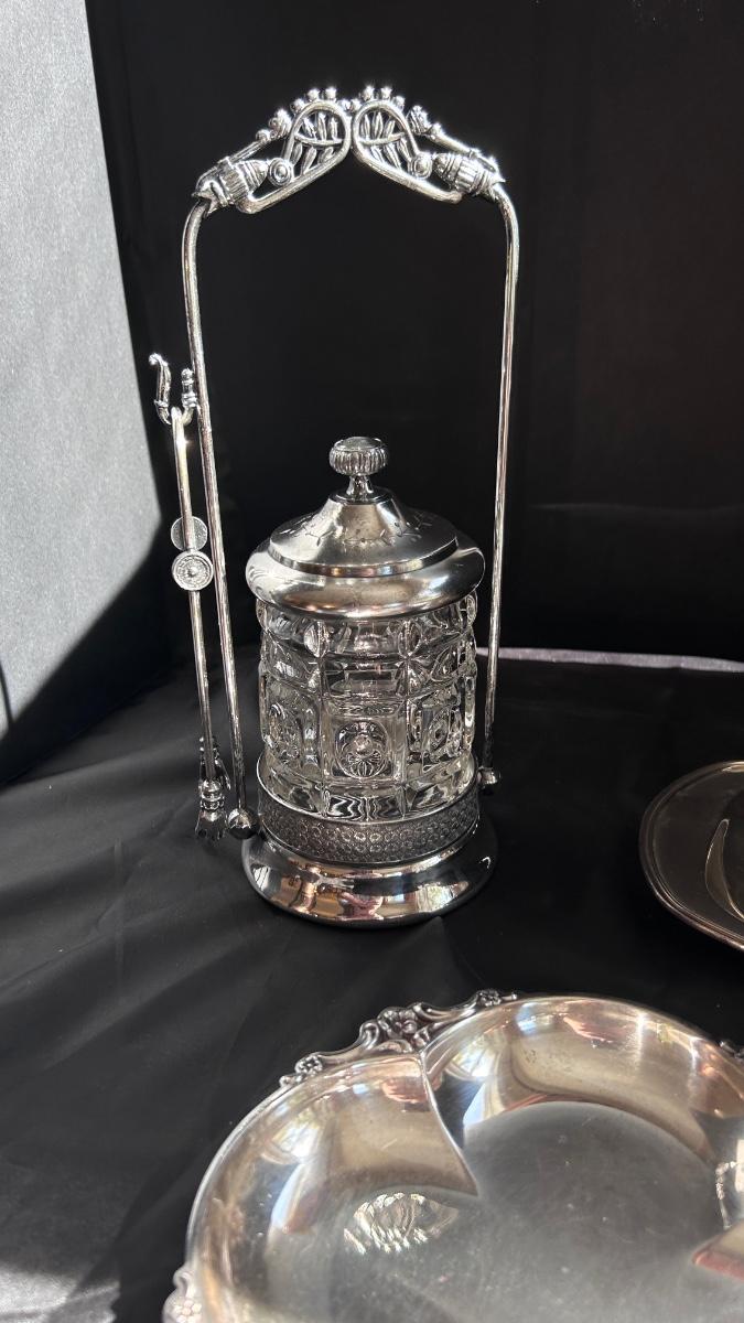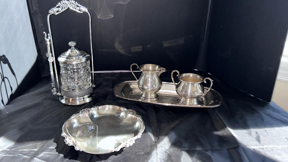 MERIDIAN, SILVER PLATE COMPANY QUADRUPLE PLATE, PICKLE SERVER, AND SHEFFIELD SILVER CREAM AND SUGAR BOWLS
