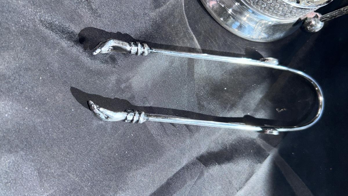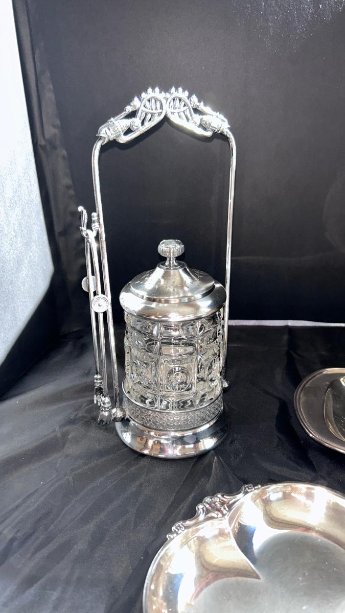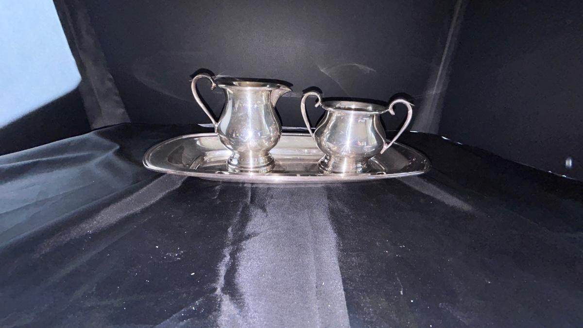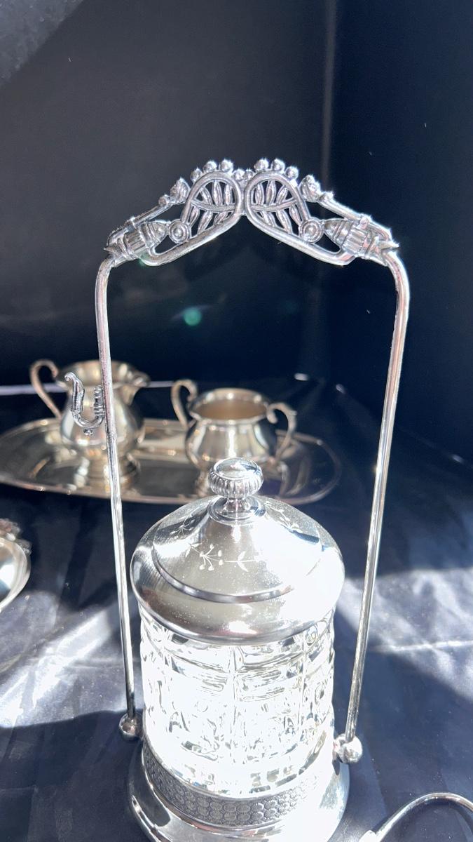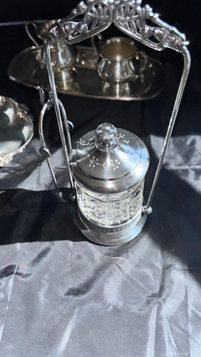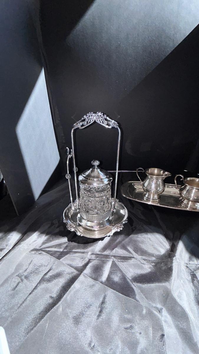 MERIDIAN, SILVER PLATE COMPANY QUADRUPLE PLATE, PICKLE SERVER, AND SHEFFIELD SILVER CREAM AND SUGAR BOWLS
