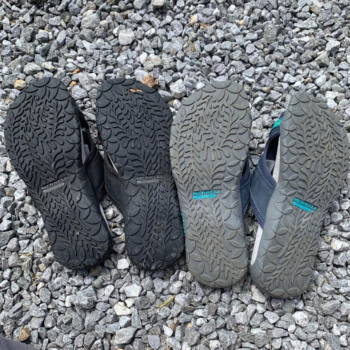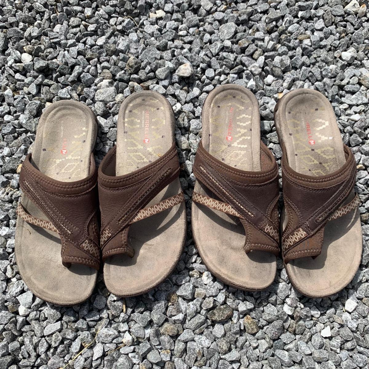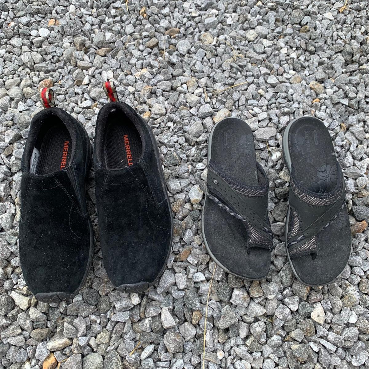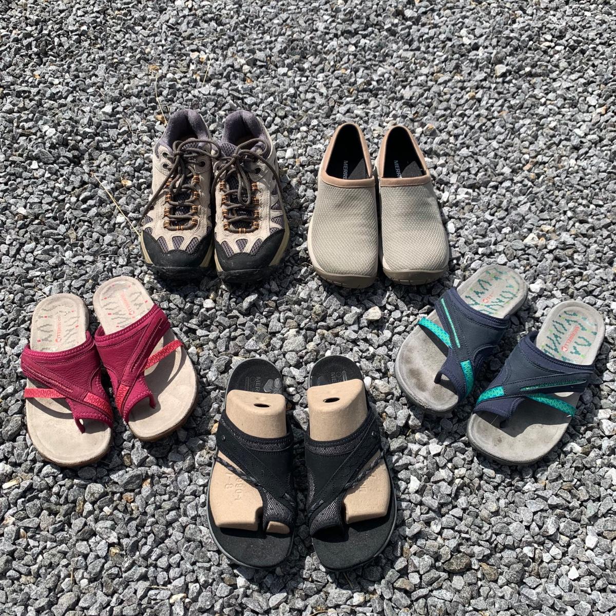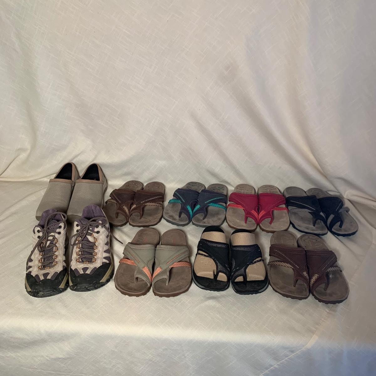 11 total pairs of Merrell brand shoes and sandals. The collection includes eight pairs of sandals that are all the same style but in different colors. One pair appears to be brand new. There is also a pair of hiking boots and two pairs of slip-on shoes. Two of the sandals have a little wear on the front and the hiking boots are a little dirty. The sandals are all size 7 and the other two pairs are 7.5.
