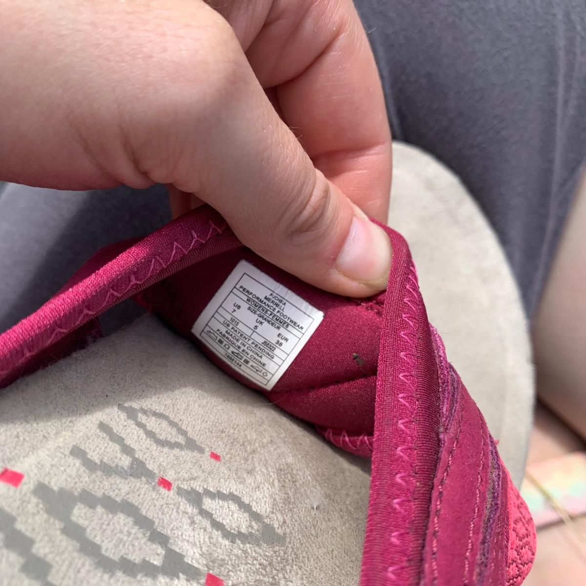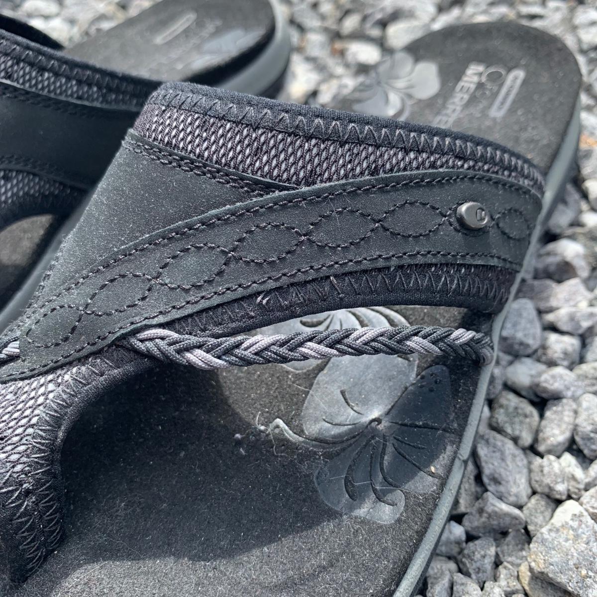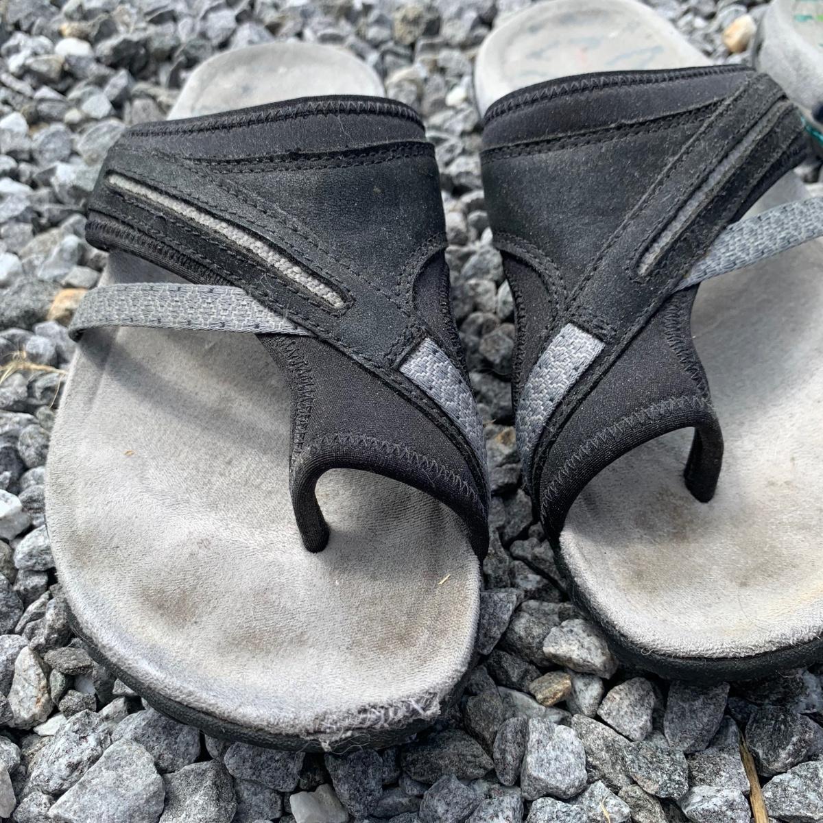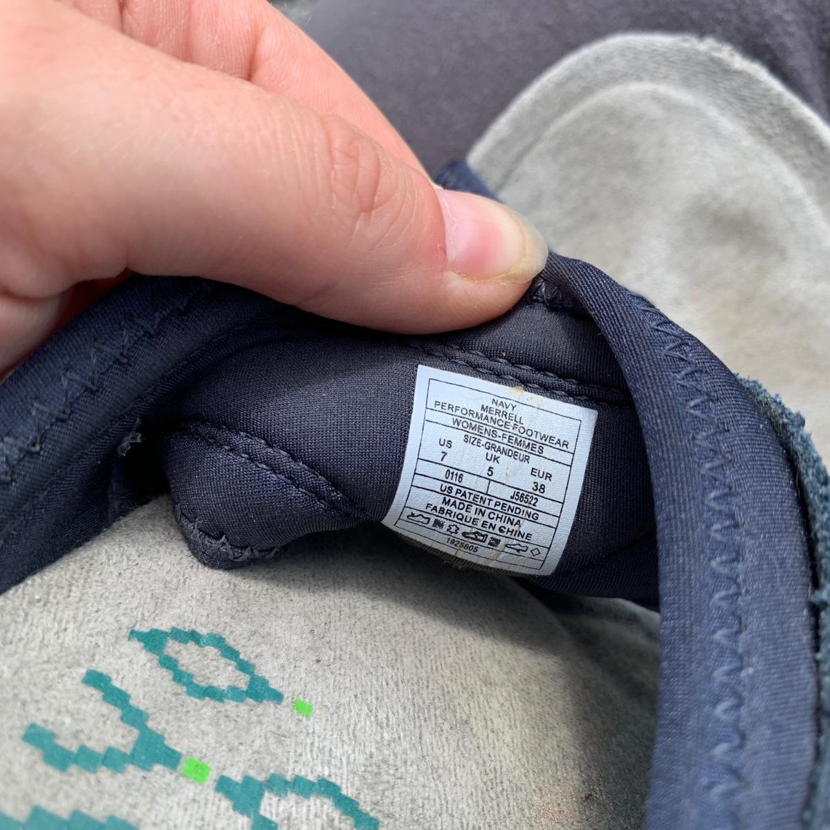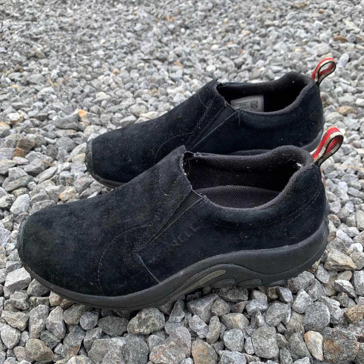11 total pairs of Merrell brand shoes and sandals. The collection includes eight pairs of sandals that are all the same style but in different colors. One pair appears to be brand new. There is also a pair of hiking boots and two pairs of slip-on shoes. Two of the sandals have a little wear on the front and the hiking boots are a little dirty. The sandals are all size 7 and the other two pairs are 7.5.