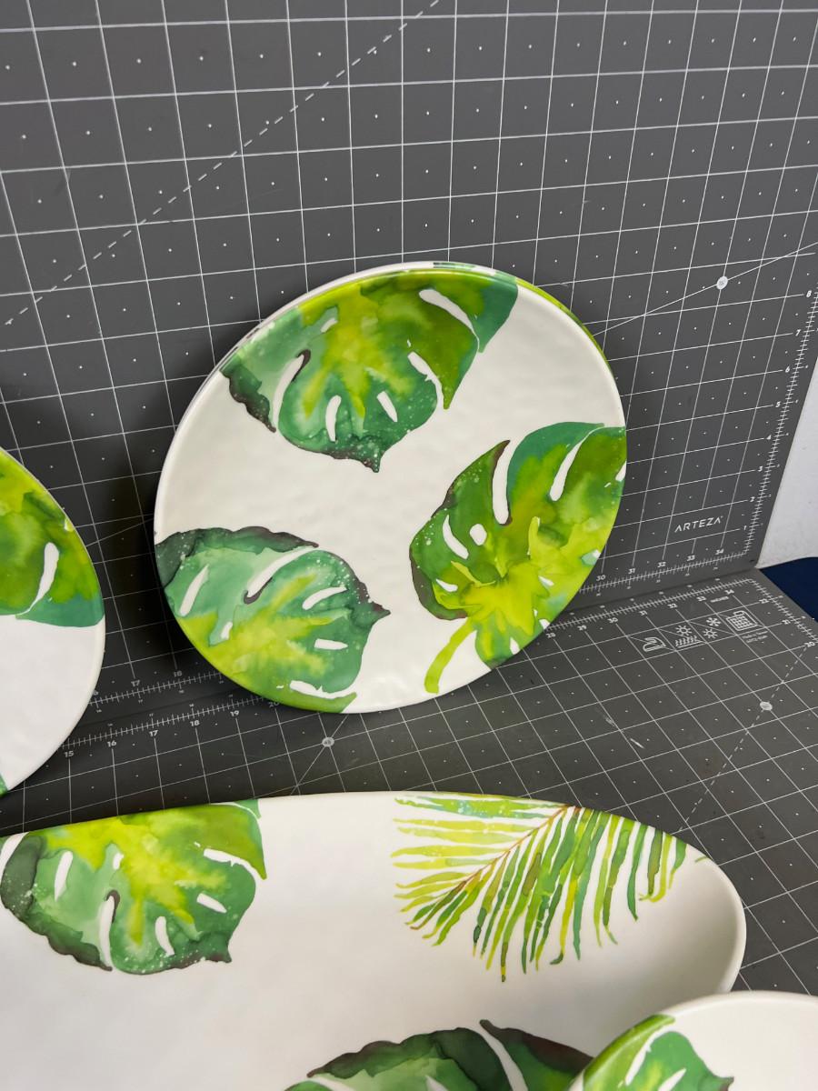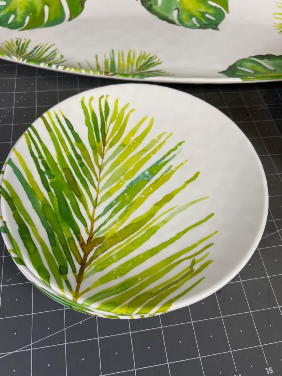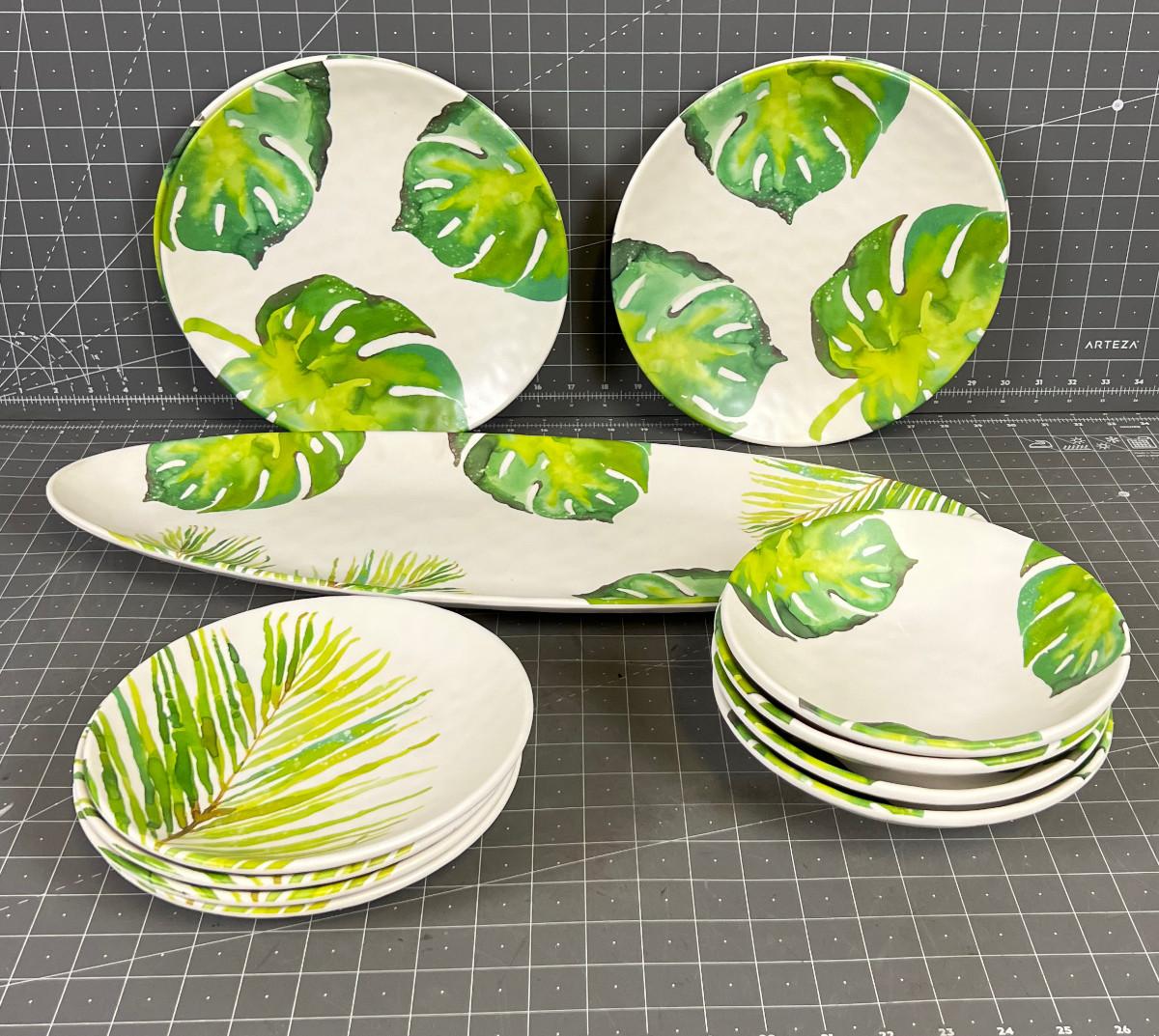 MERRITT Melamine Dishes with Platter, Like New Condition Palm Leaf Design
