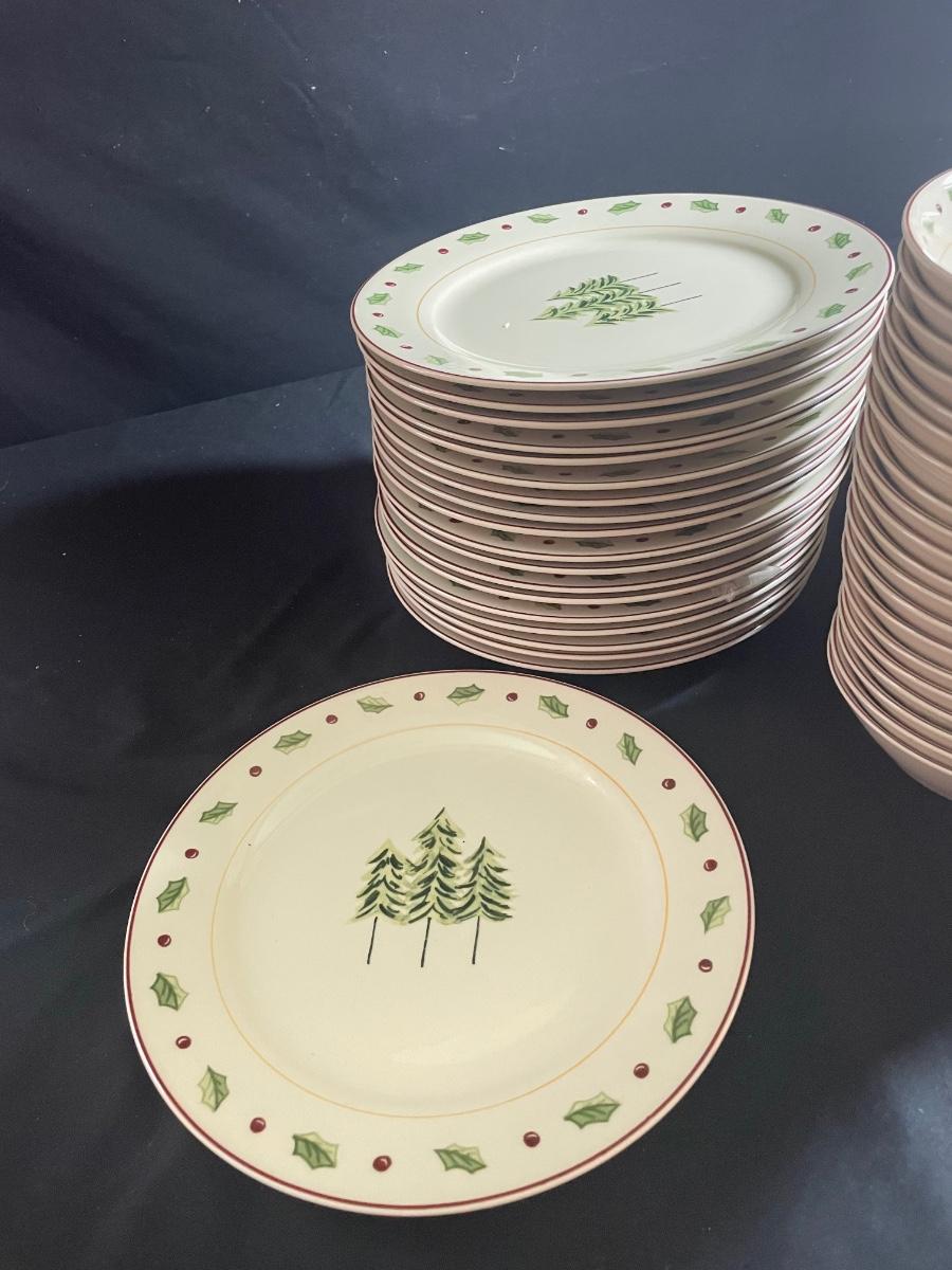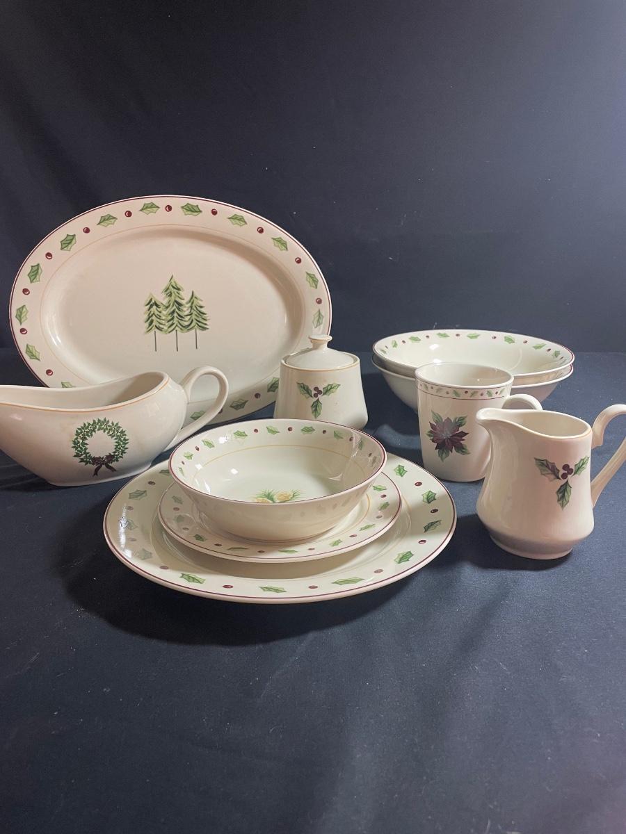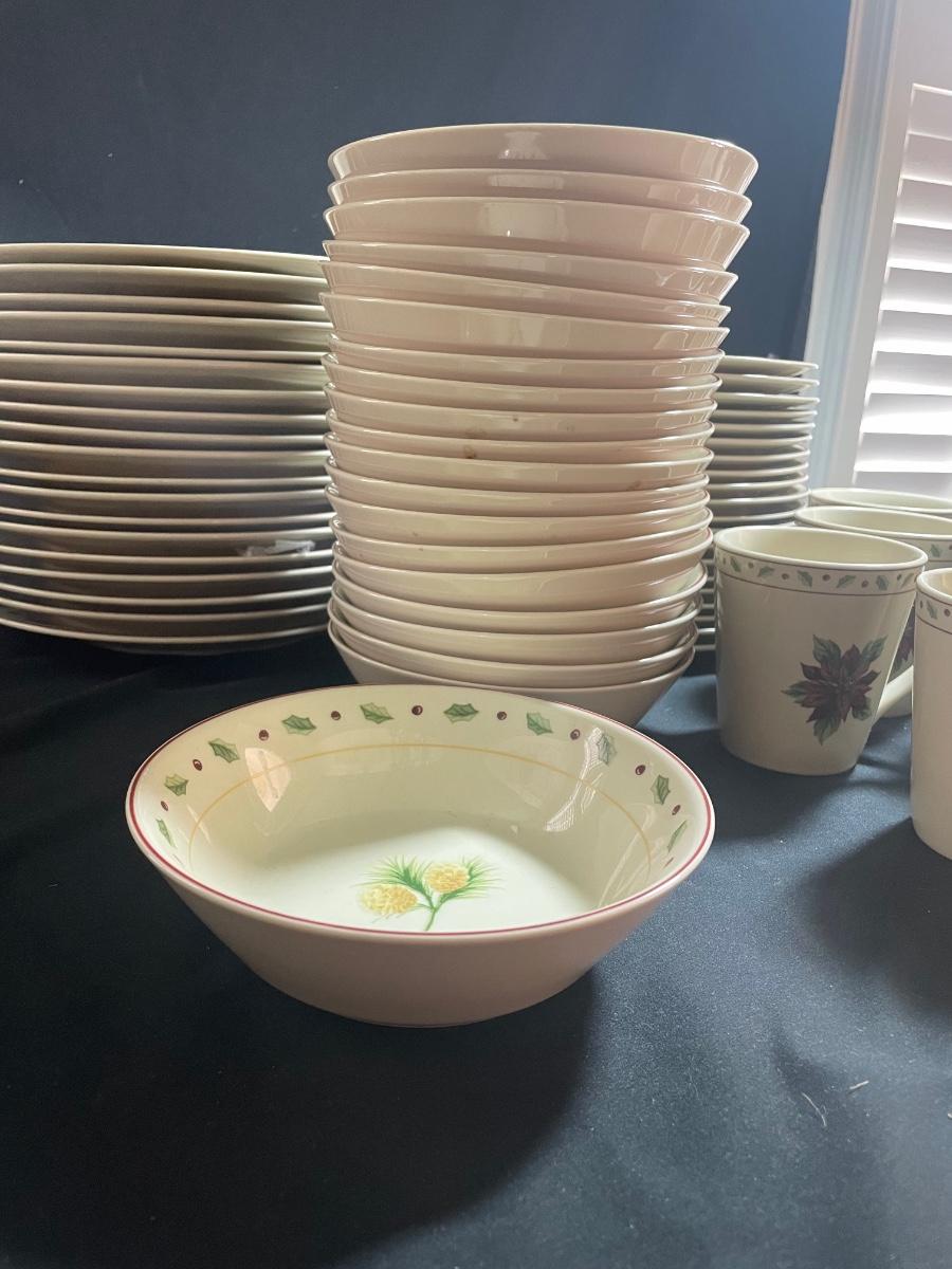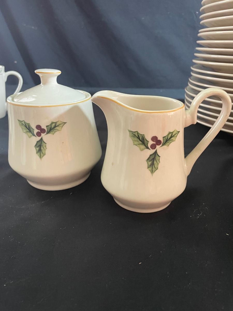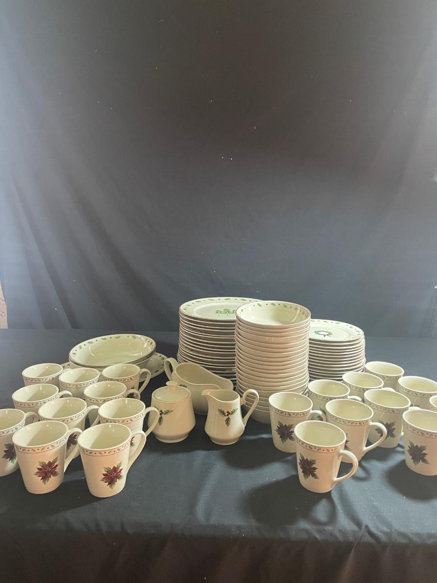 This 85 piece set of Merry Brite ceramic dinnerware would be a 20 person setting but one dinner plate is missing. This festive ceramic set includes 19 dinner plates that are 10.5” diameter and 20 each of side plates, bowls and cups. The collection also includes a platter, 2 large serving bowls, gravy boat, sugar bowl and creamer. All pieces are in excellent condition.