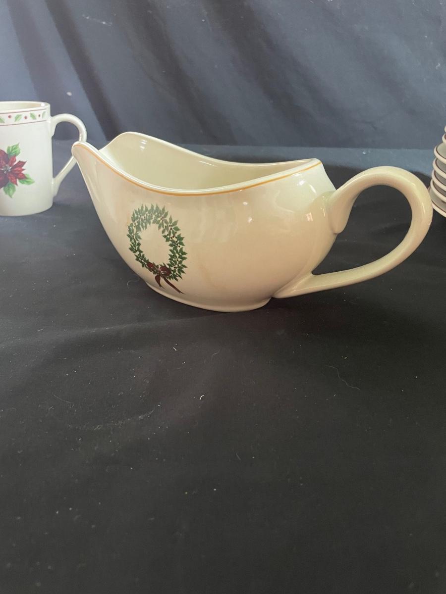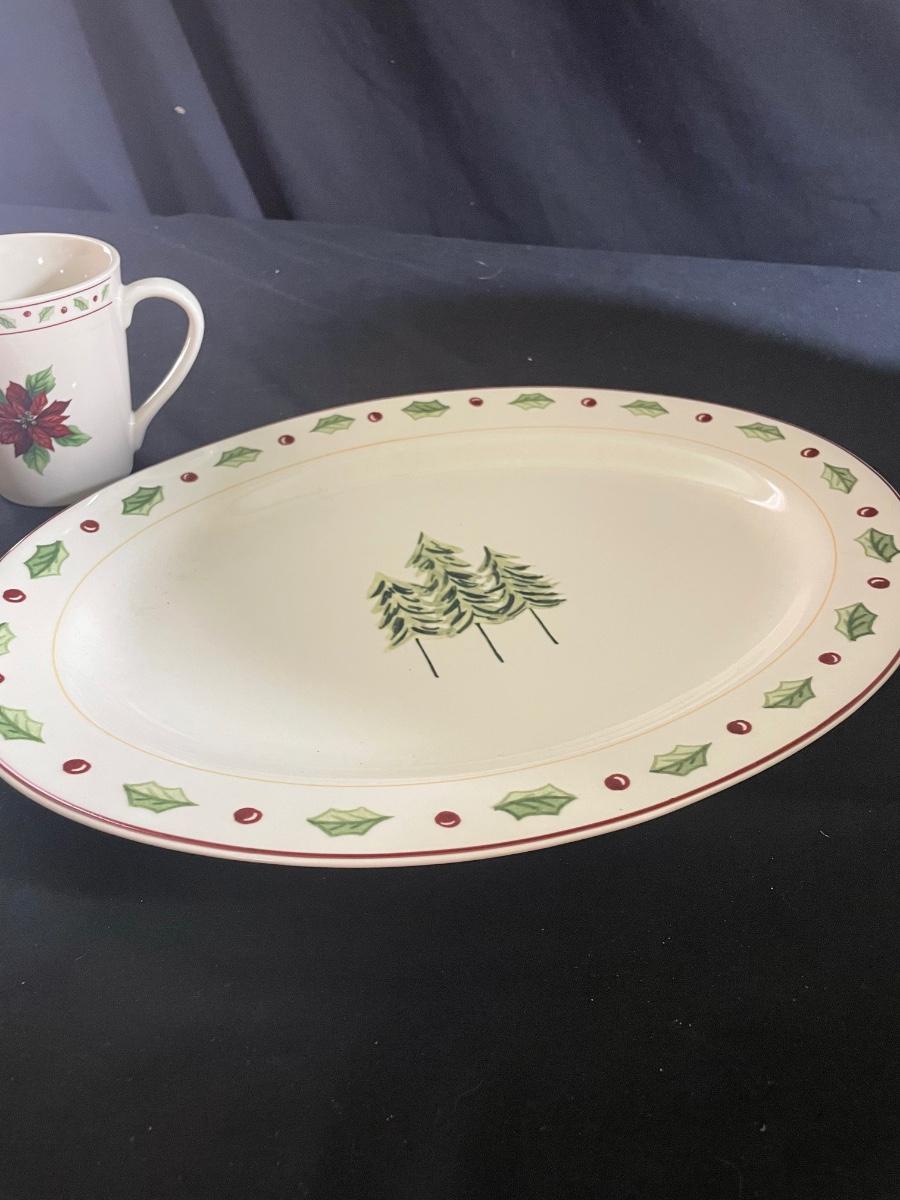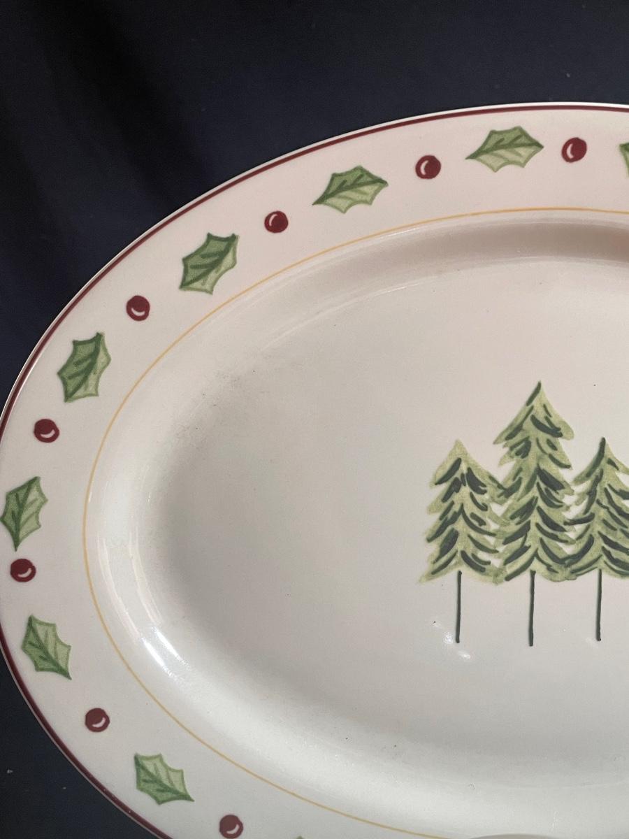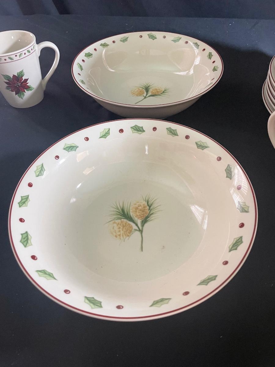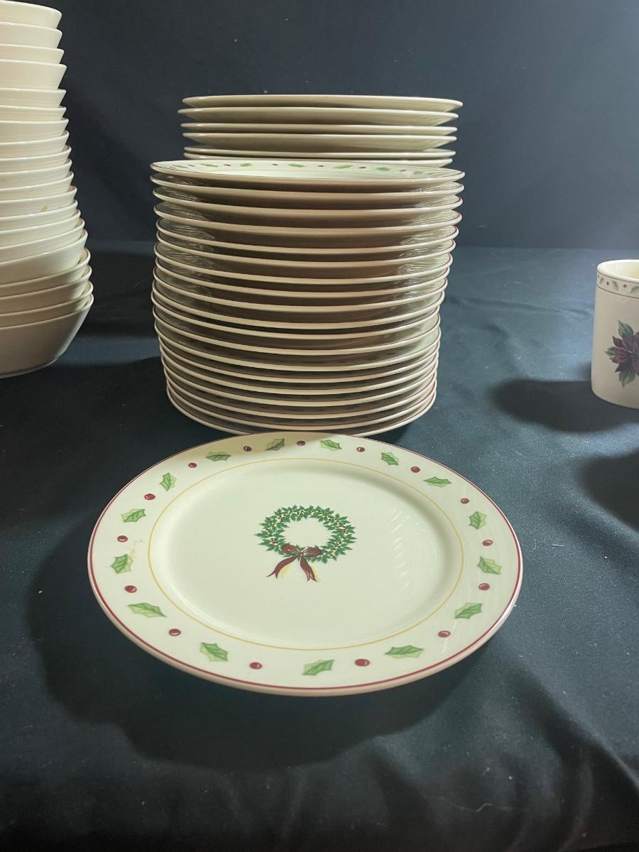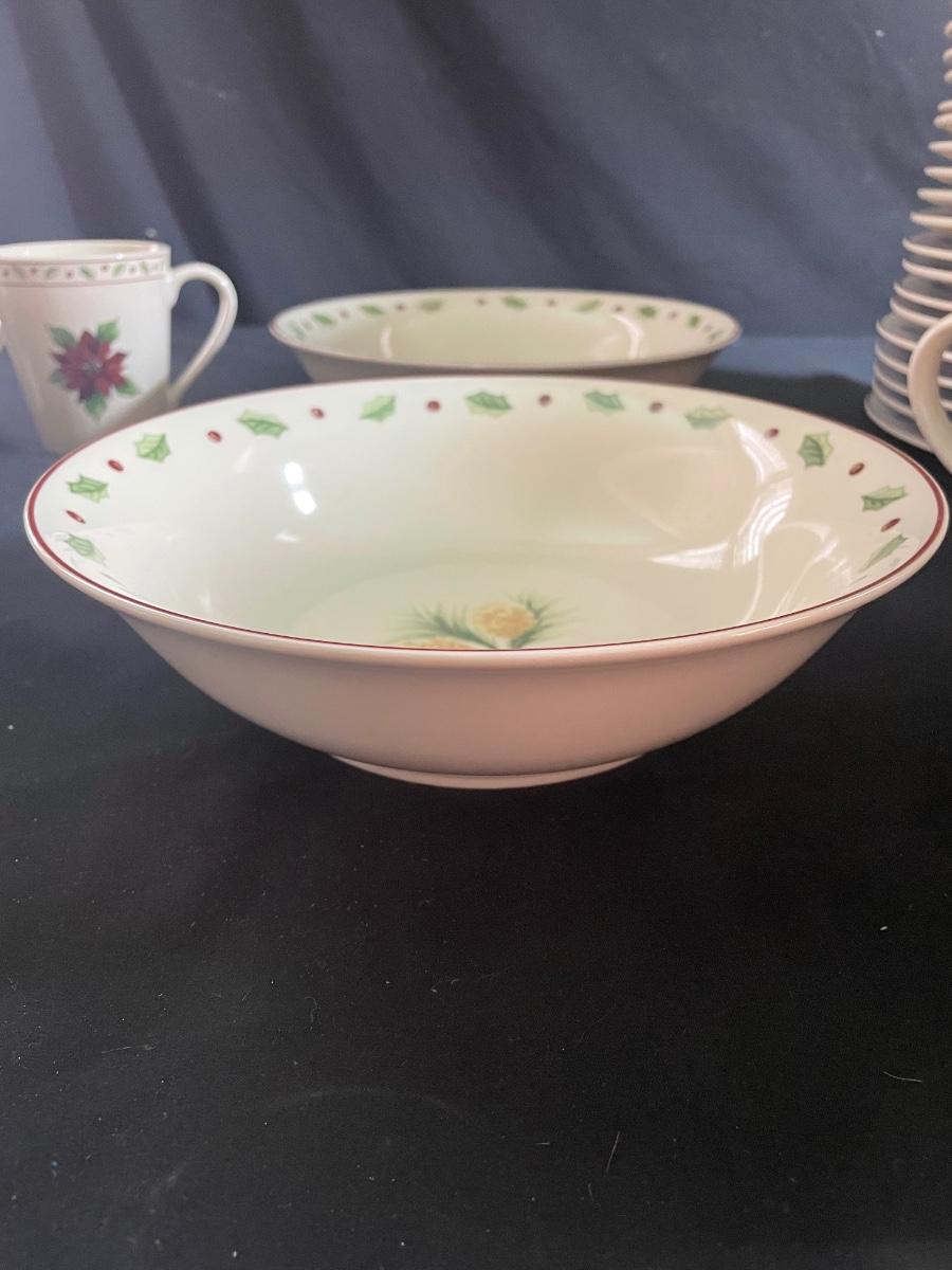 This 85 piece set of Merry Brite ceramic dinnerware would be a 20 person setting but one dinner plate is missing. This festive ceramic set includes 19 dinner plates that are 10.5” diameter and 20 each of side plates, bowls and cups. The collection also includes a platter, 2 large serving bowls, gravy boat, sugar bowl and creamer. All pieces are in excellent condition.