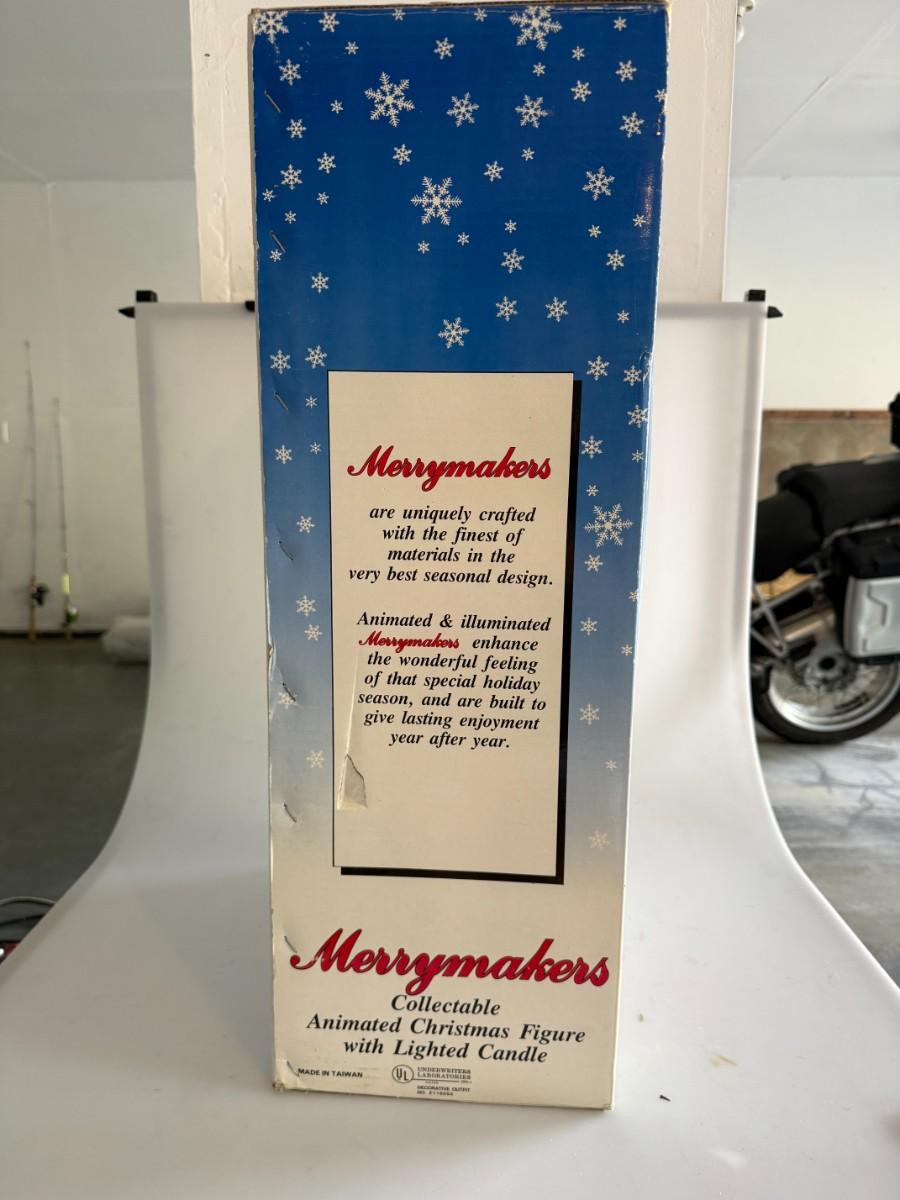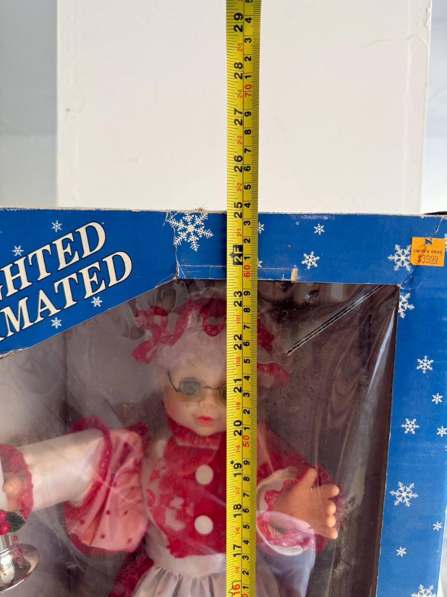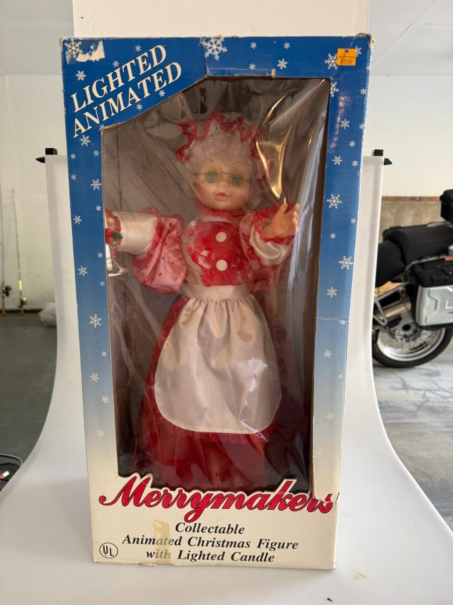 Charming lighted and animated Mrs. Claus figure by Merrymakers. A great collectible piece for holiday décor. In original box, plastic window has wear.