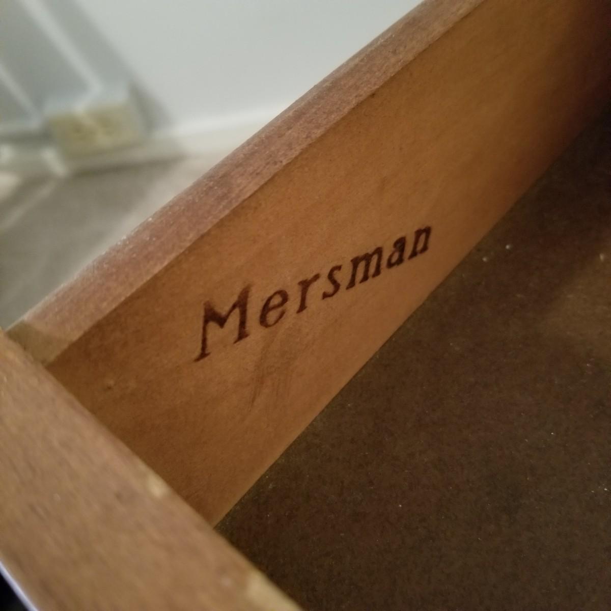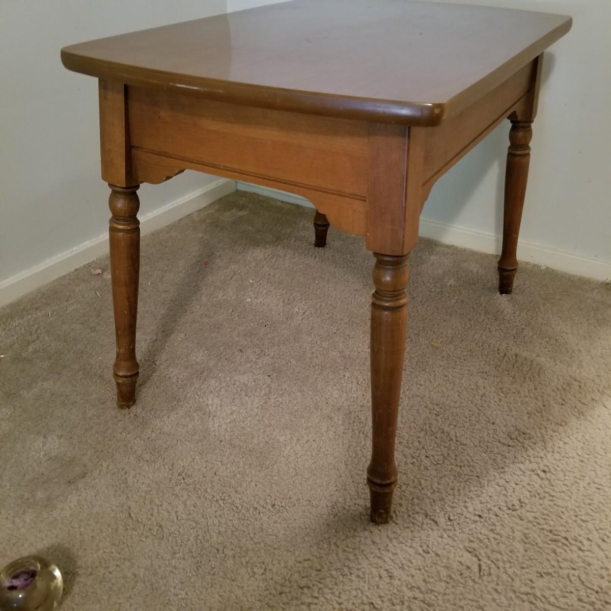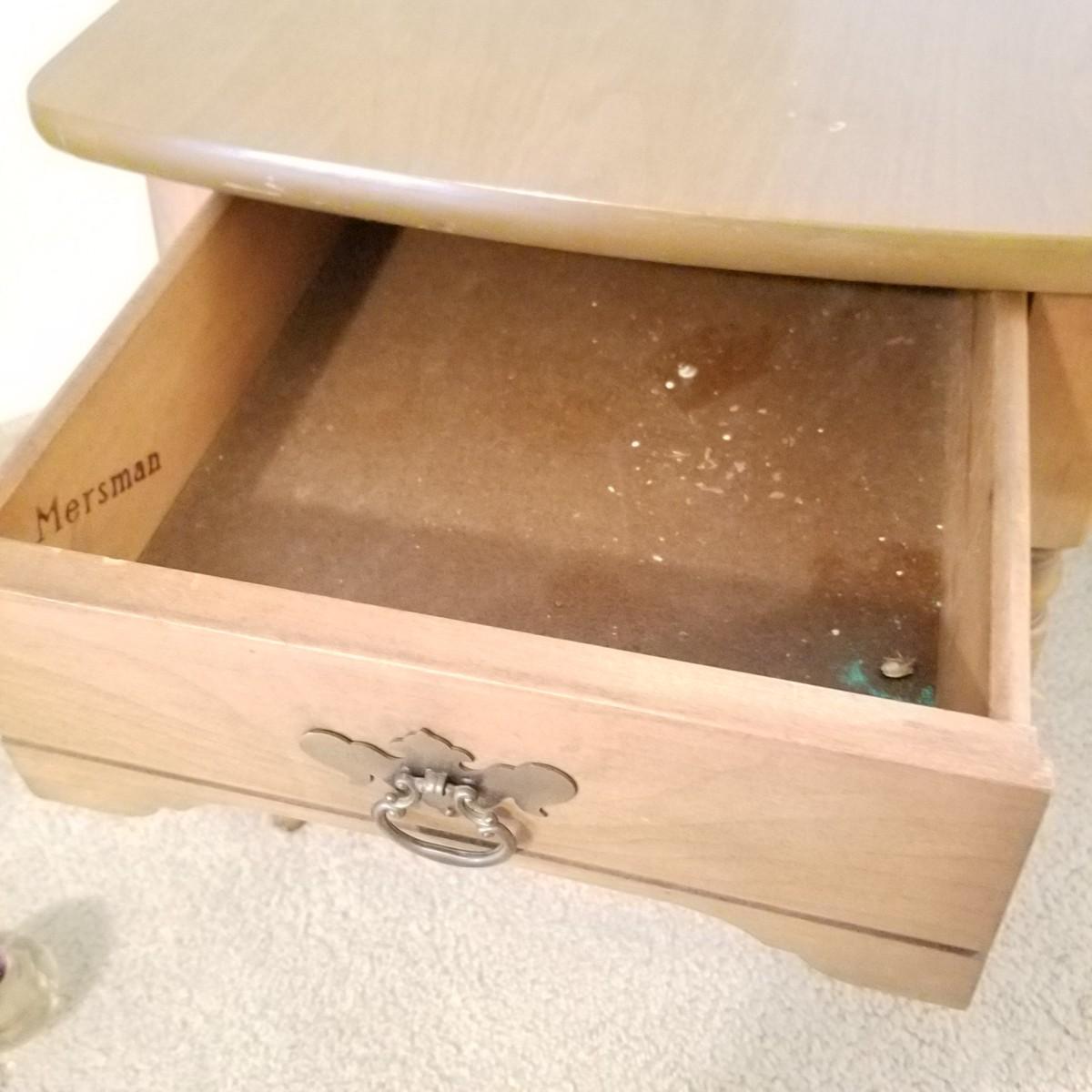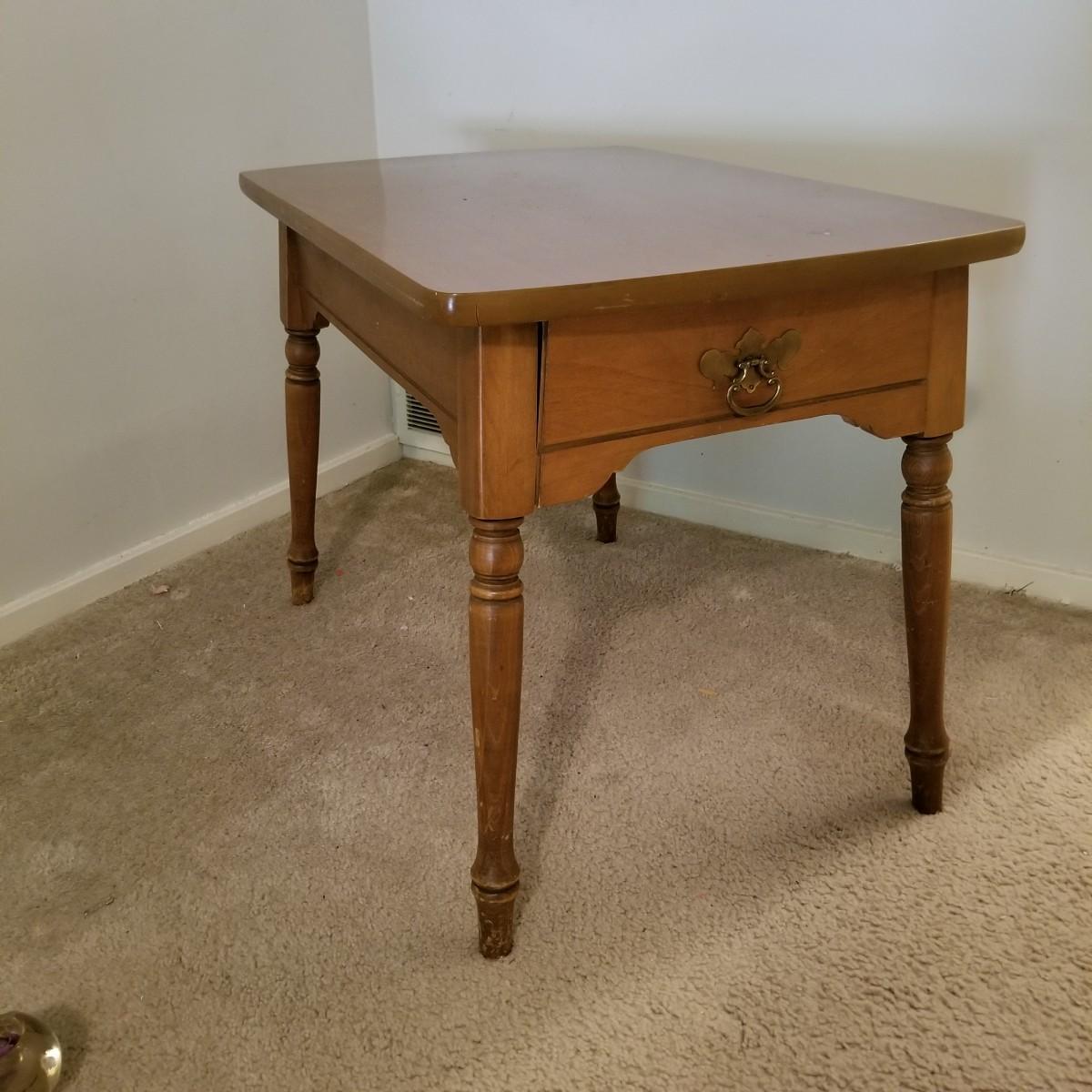 Solid wood side table with drawer. Made by Mersman. Table has turned legs and dovetail joints on its drawer. 29" x 20" x 22". Table in good condition structurally, with some surface blemishes. Local pickup only.