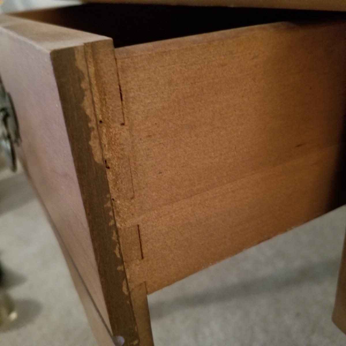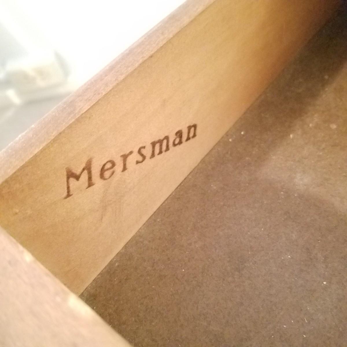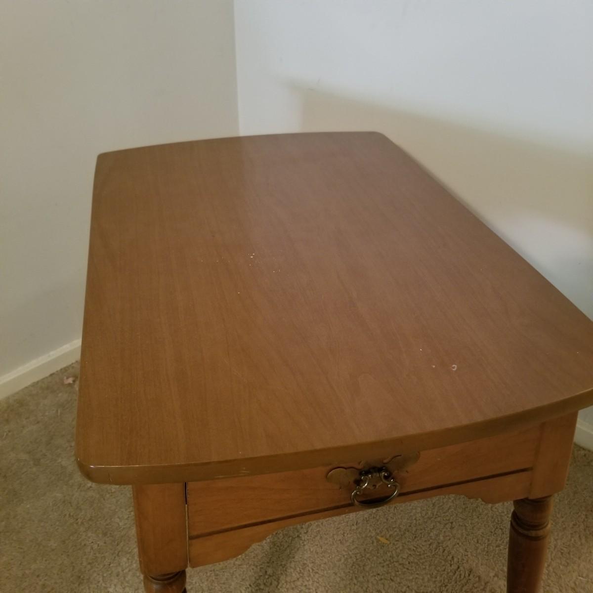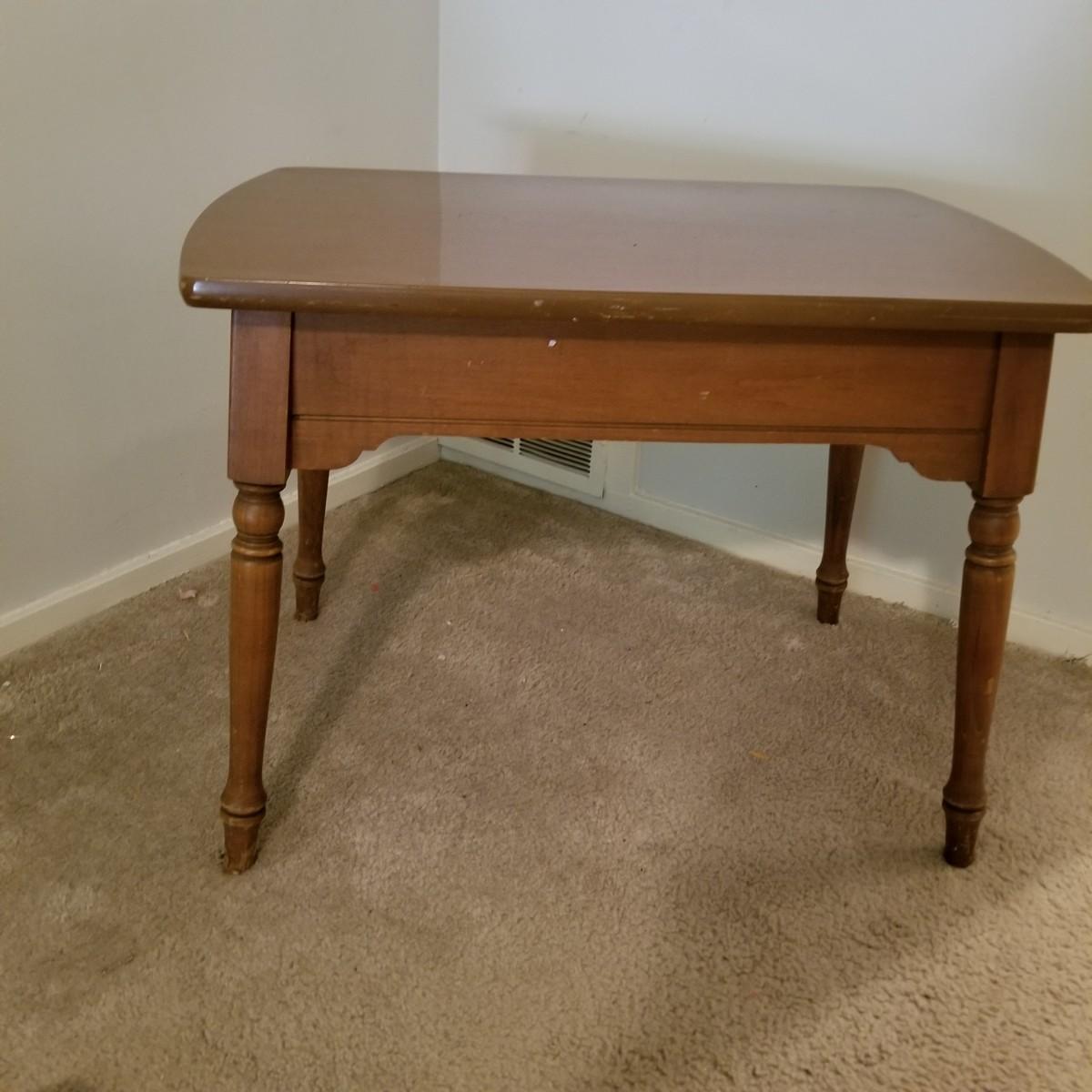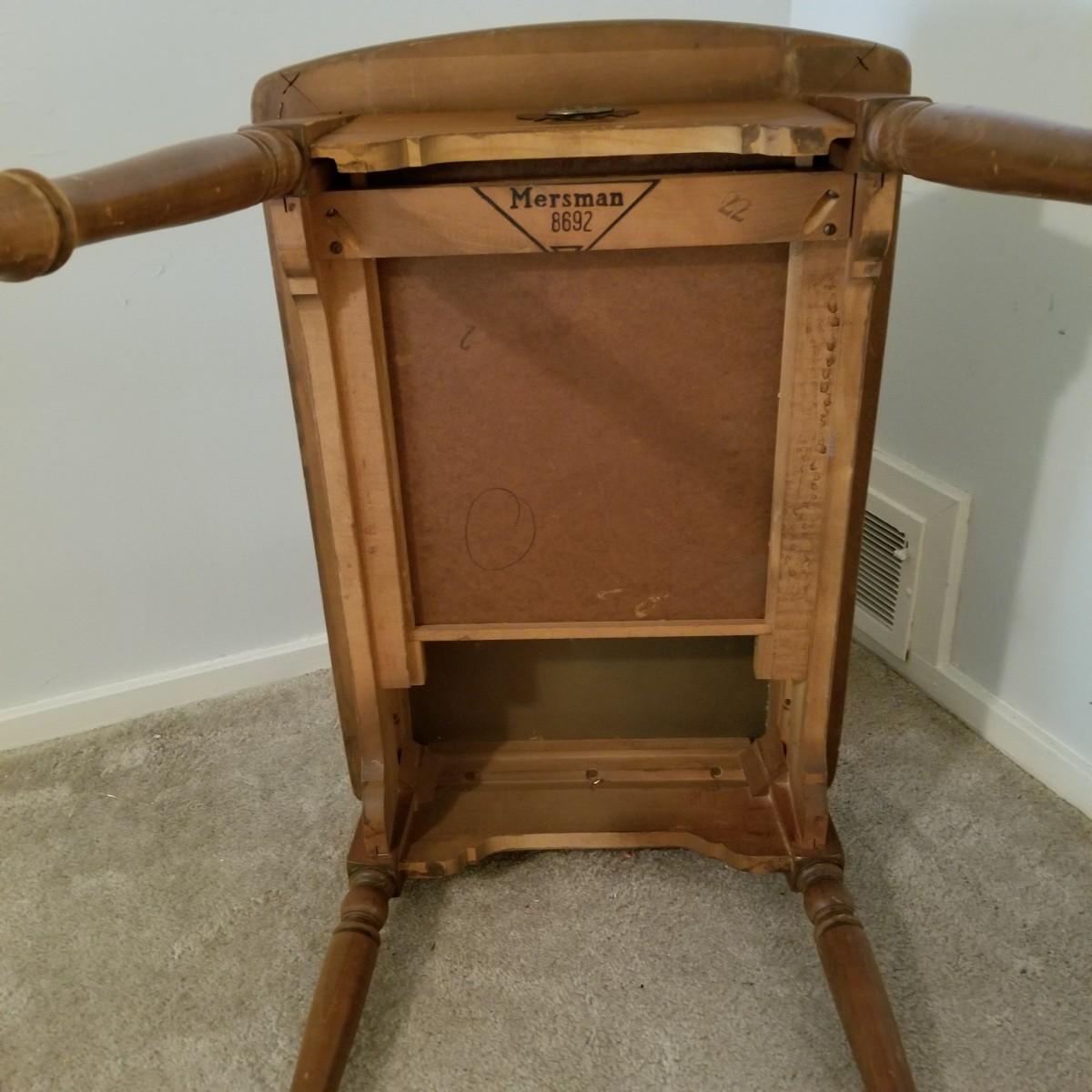 Solid wood side table with drawer. Made by Mersman. Table has turned legs and dovetail joints on its drawer. 29" x 20" x 22". Table in good condition structurally, with some surface blemishes. Local pickup only.