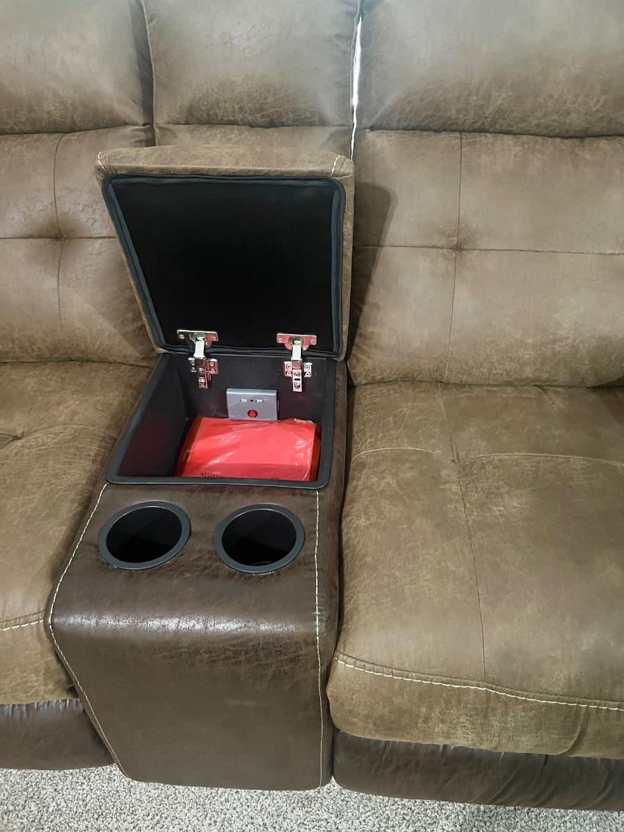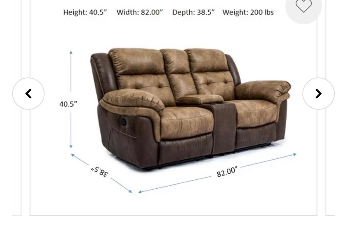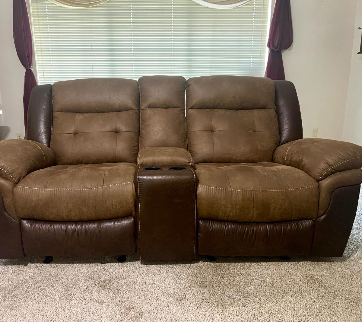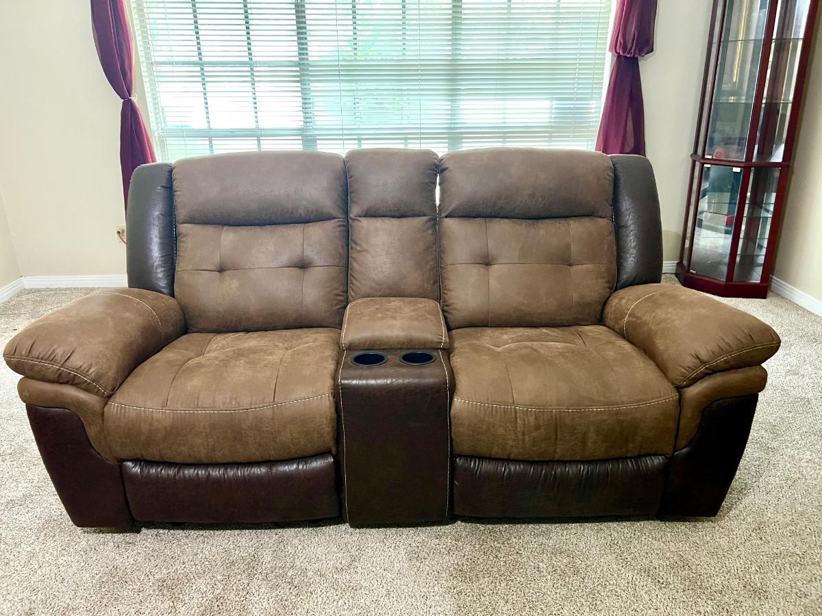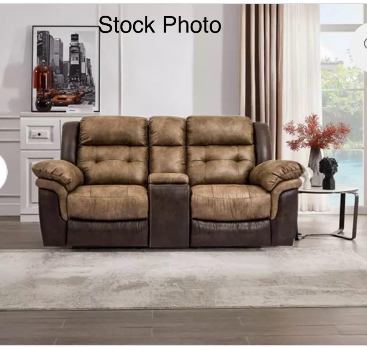 Mesa Brown Glider & Reclining Console Loveseat. Material Is Faux leather, polyester. This has a center console with 2 USB charging ports. This is like new. Both stock photos and actual photos are posted. Measurements are posted on picture.