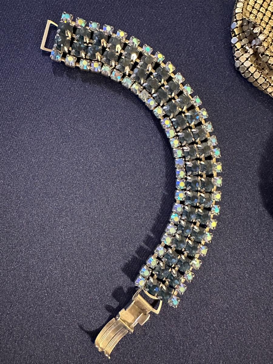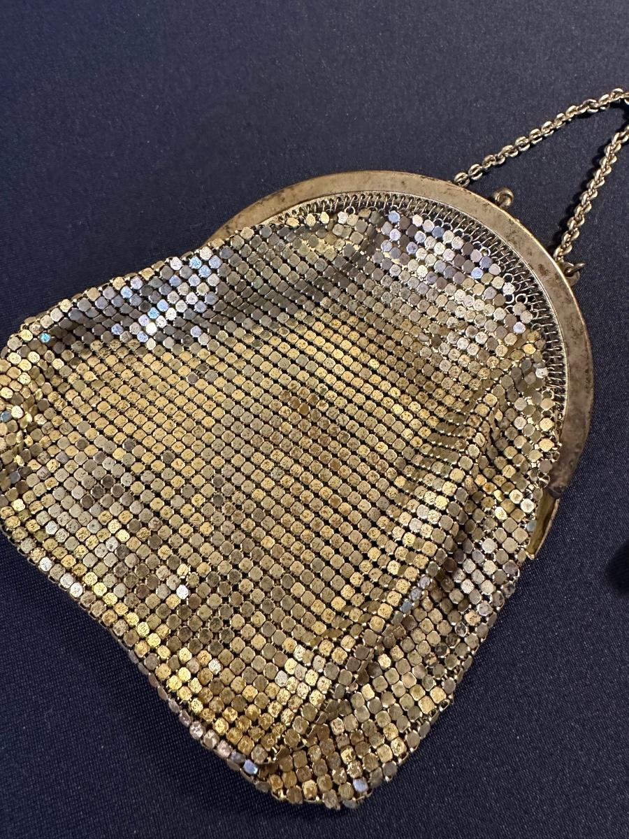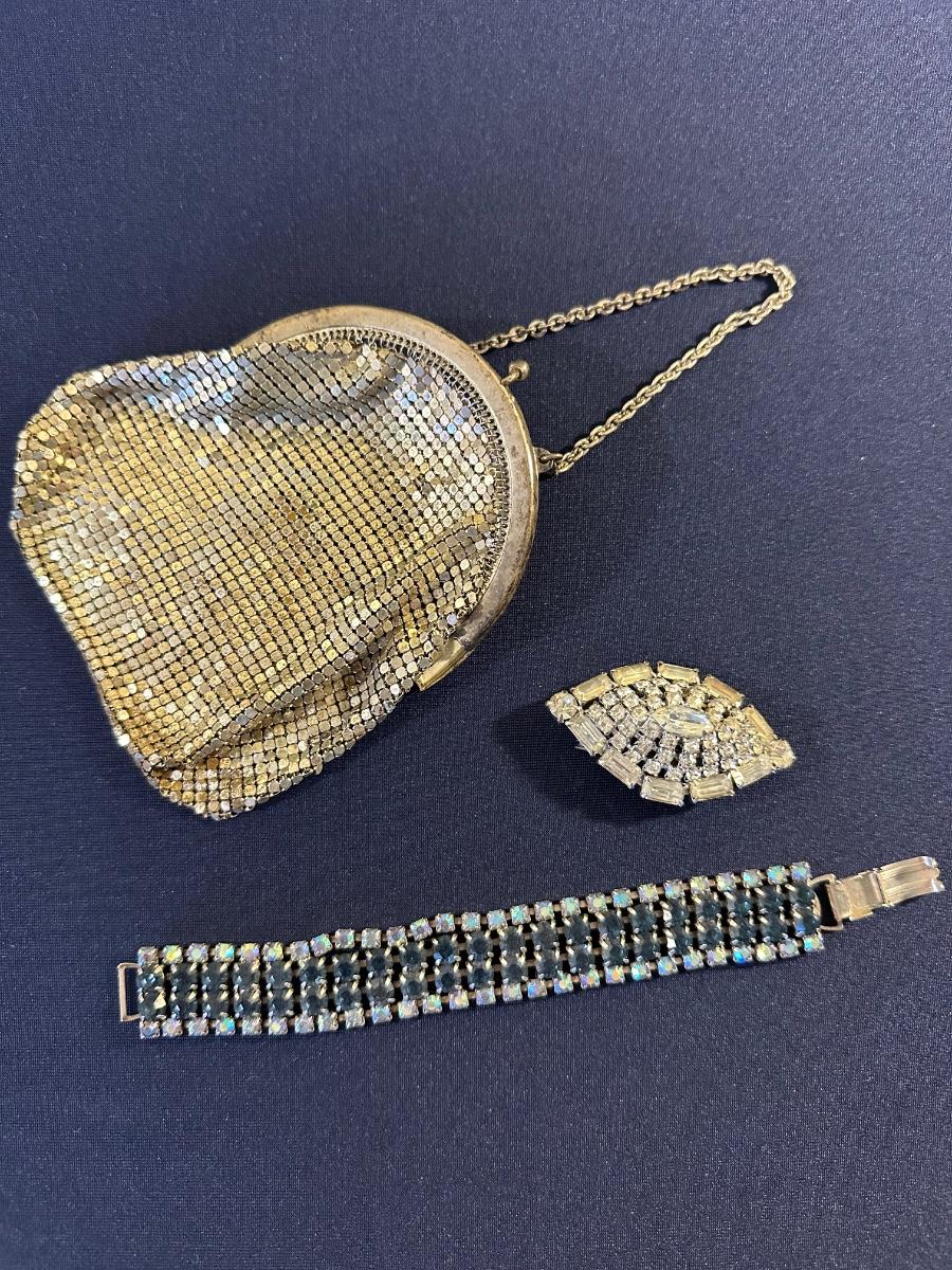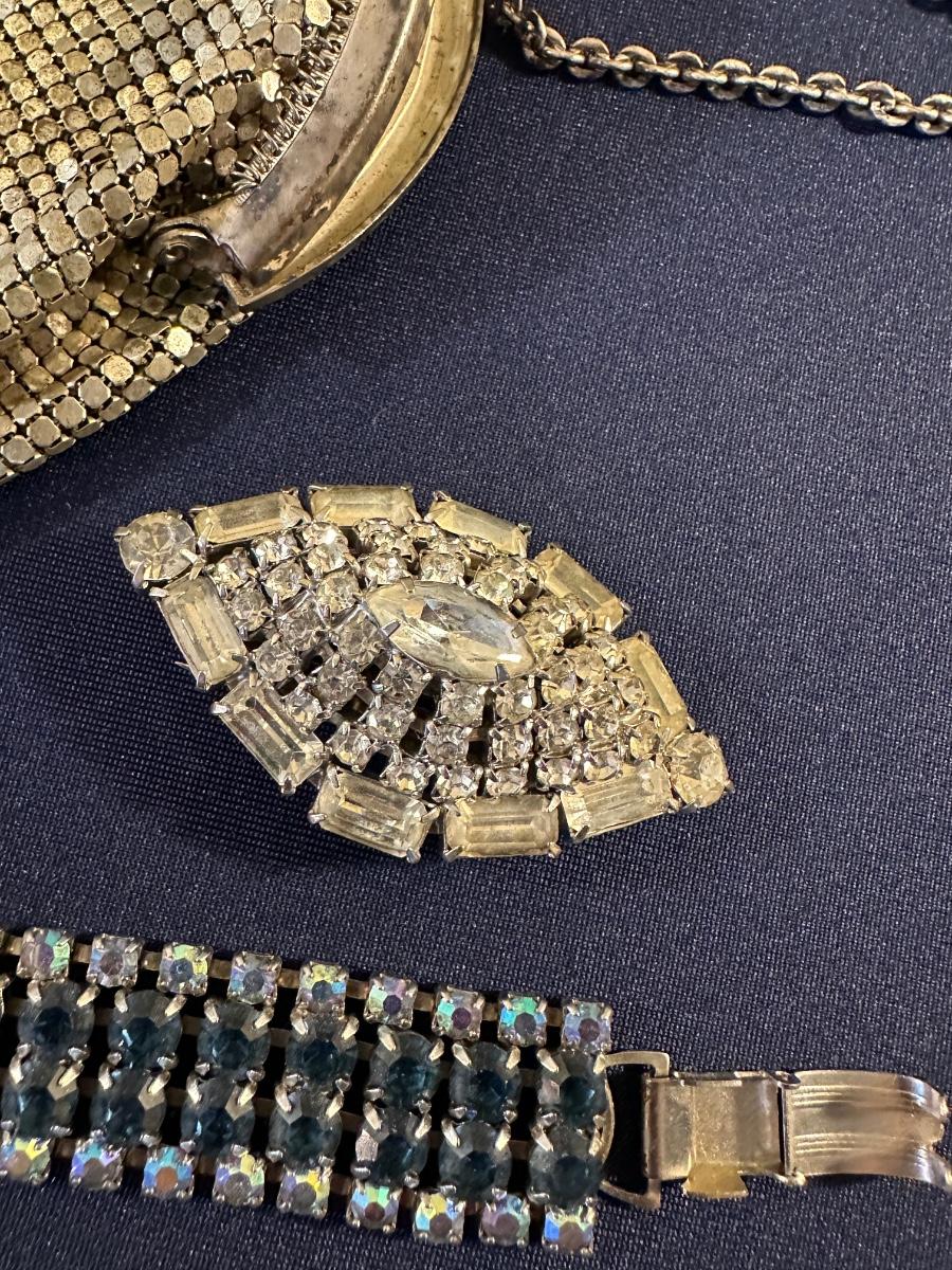 MESH PURSE, CLASP NEEDS ADJUSTING, 2 RHINESTONE COSTUME JEWEL PIECES