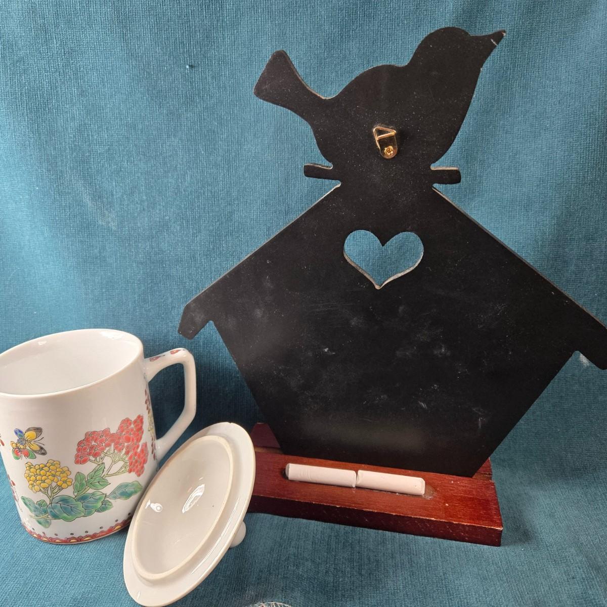 This lot is for a Message Board and a Covered Mug for Spring Dreams. This is a small blackboard Message Board and a Spring motif Covered Coffee Mug. The Chalkboard is made to fit the stand or it has a hanger if you wish to hang it. It is about 10-inches tall X 9-inches wide. The mug is a pretty floral with a lid to help keep it hot or safe from other's sneezing or coughing. The lid does have a small chip on inside but it doesn't effect how it sits on the mug - see photo.