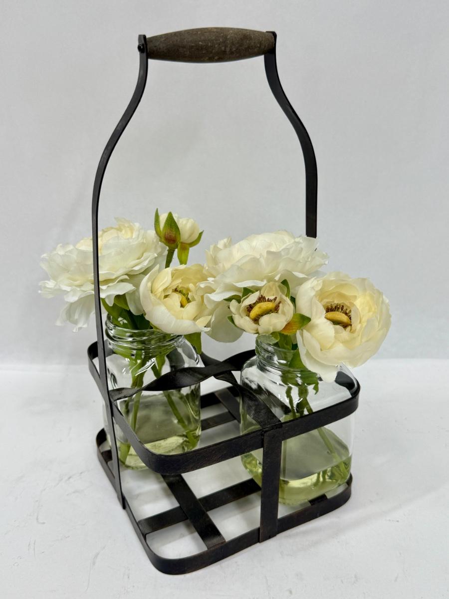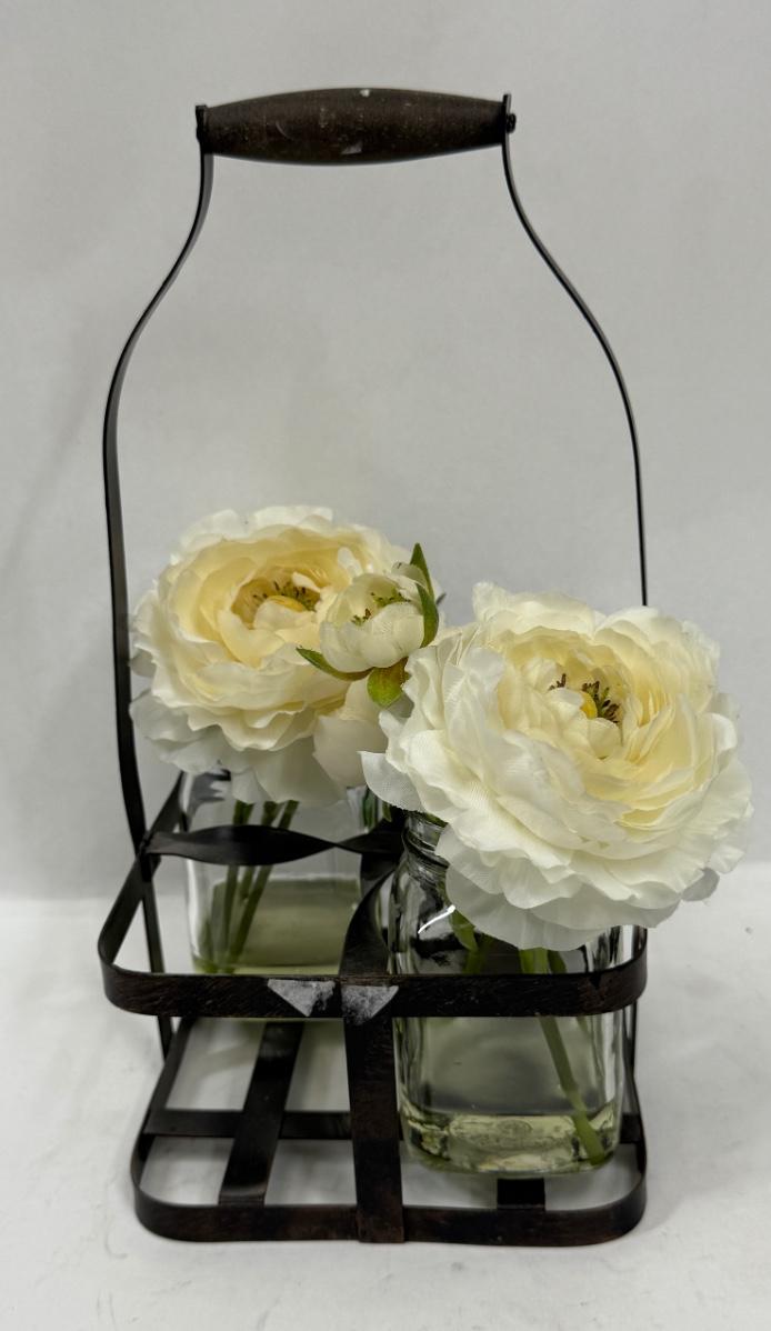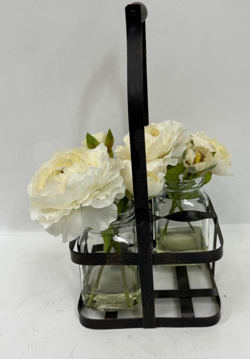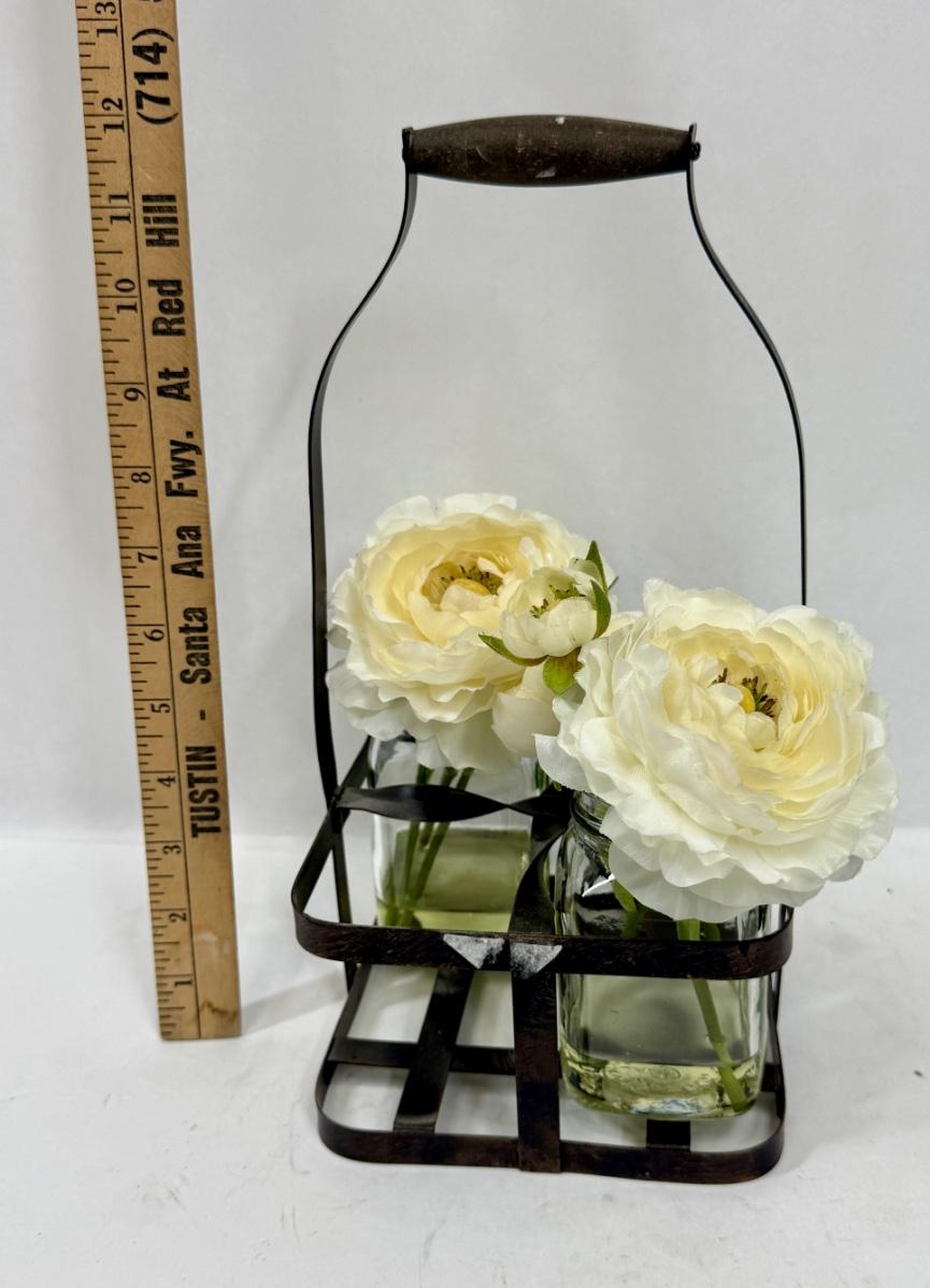 French Country Style Metal 4 Compartment Bottle Holder with 2 Faux Bed Vases
