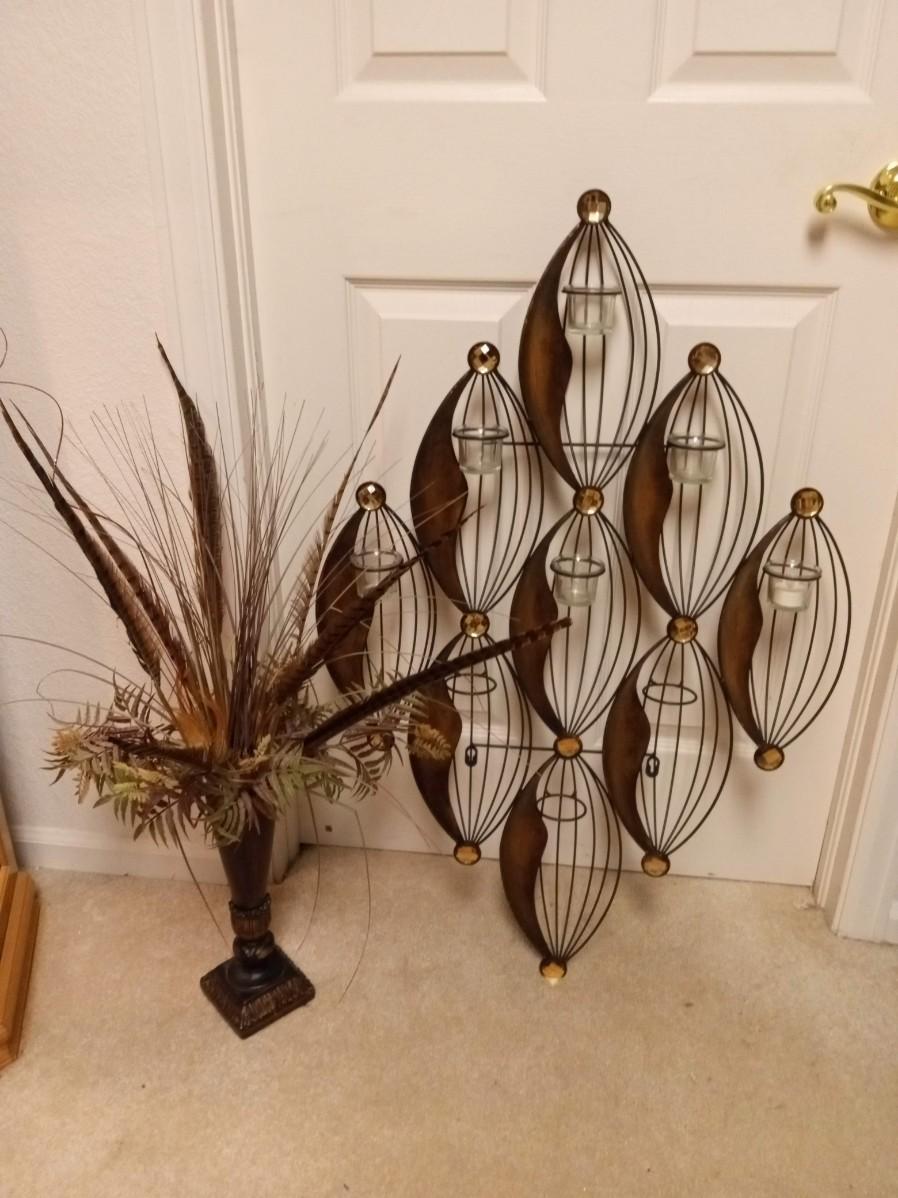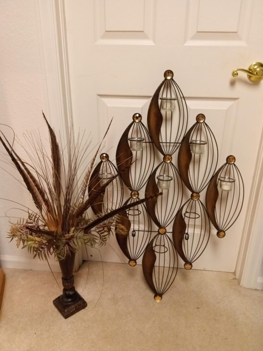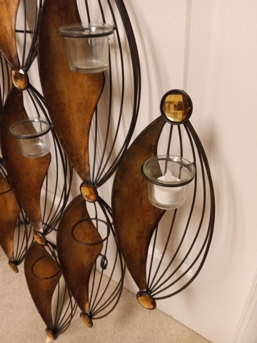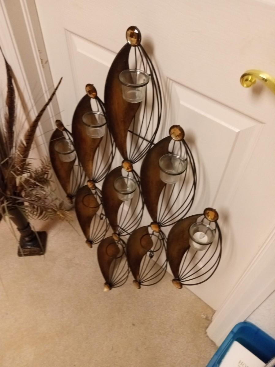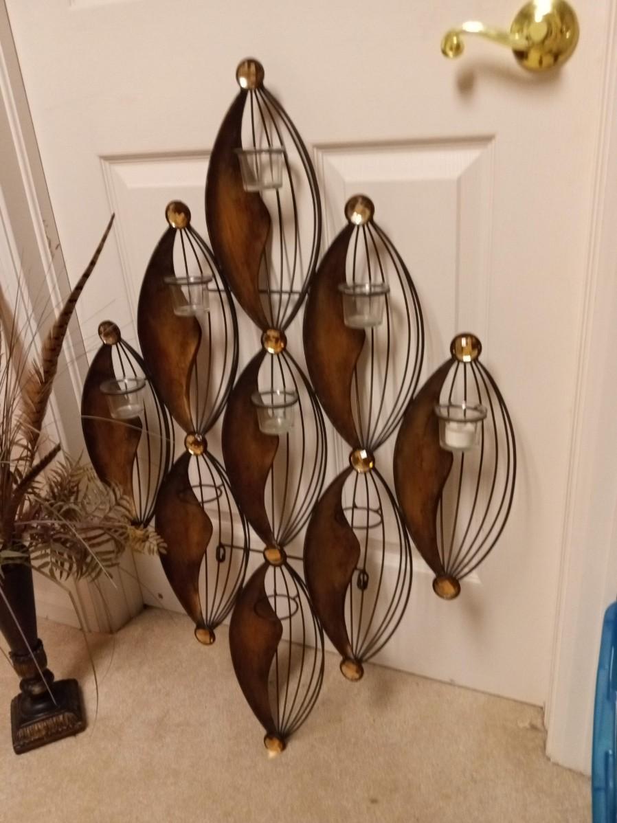 THE METAL WALL HANGING HOLDS VOTIVE CANDLES BUT IS MISSING SEVERAL OF THE GLASS HOLDERS, IT MEASURES 37" X 24"