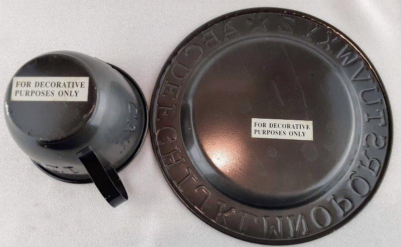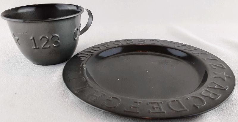 Just for fun alphabet plate 5.75in diameter and cup is 2in tall and 3in diameter