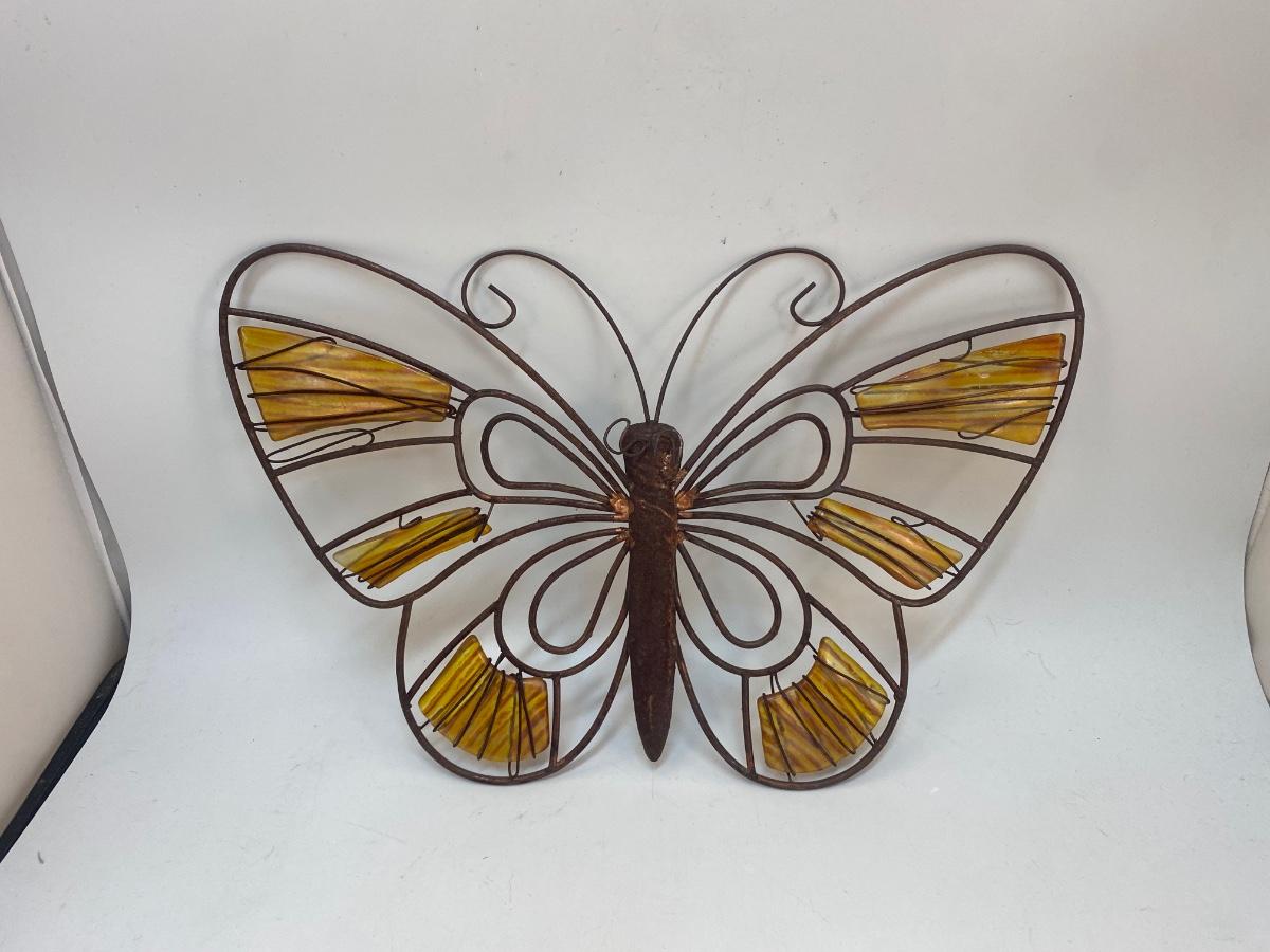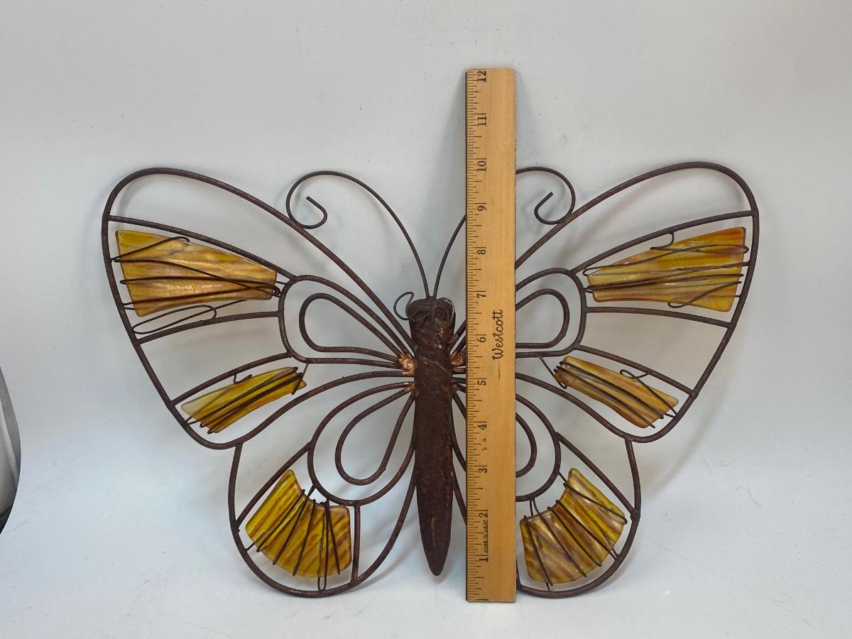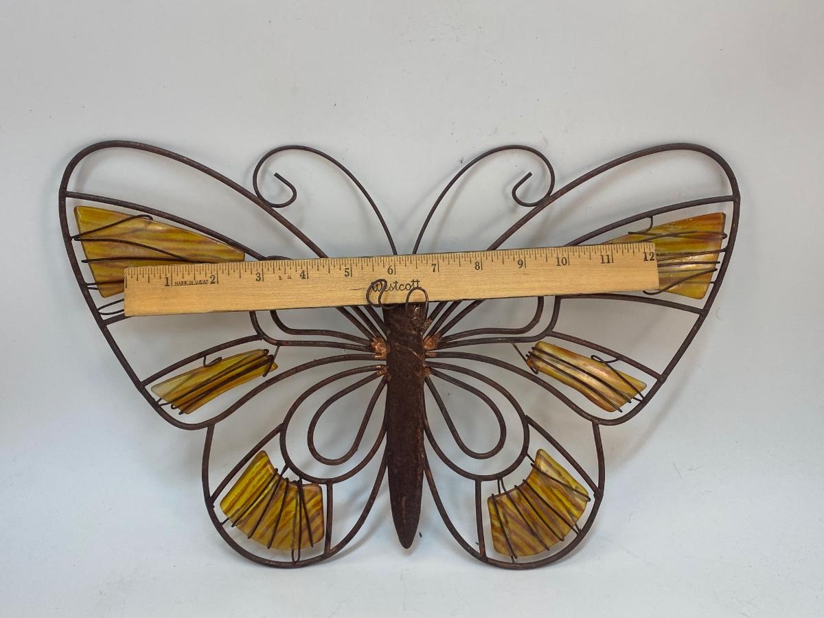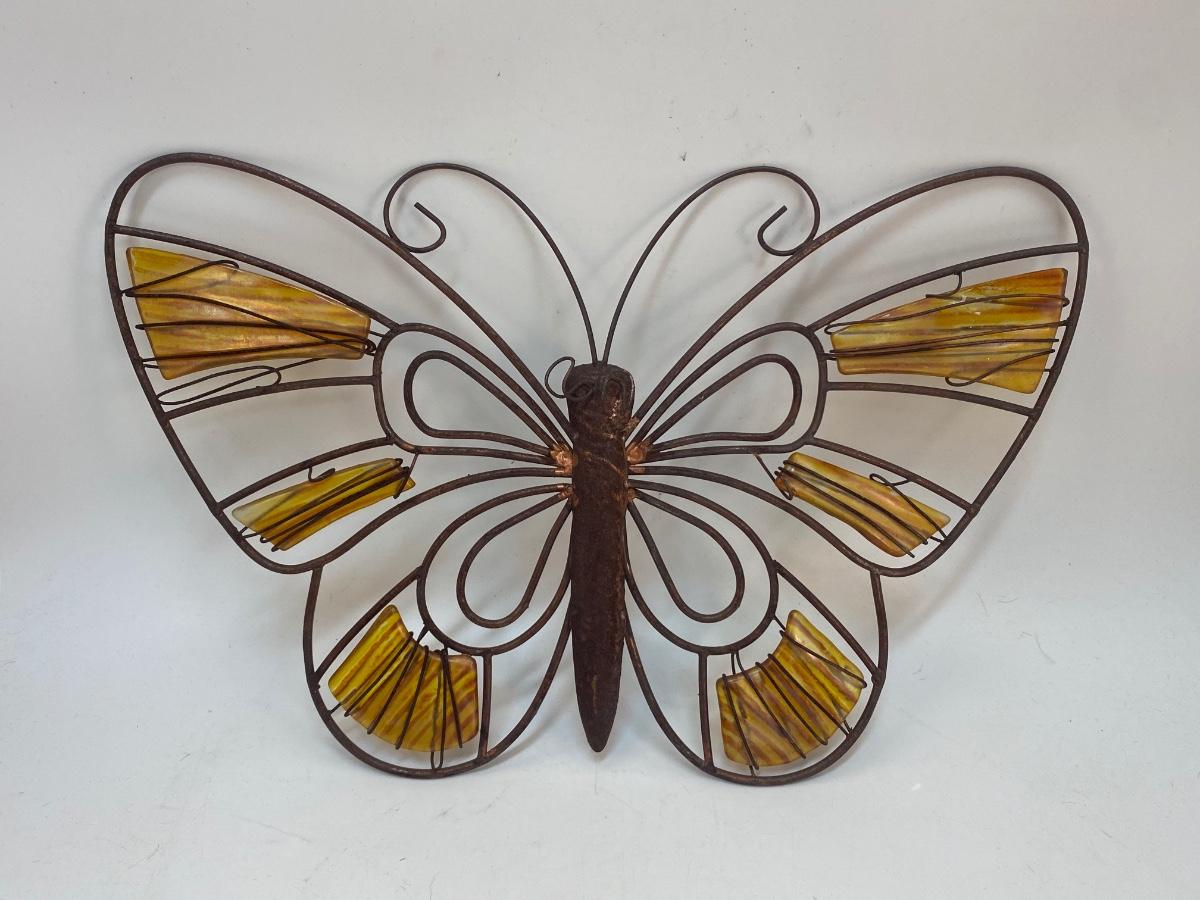 Metal and Glass Butterfly Yard Garden Wall Art. In good weathered condition. About 15” wide,