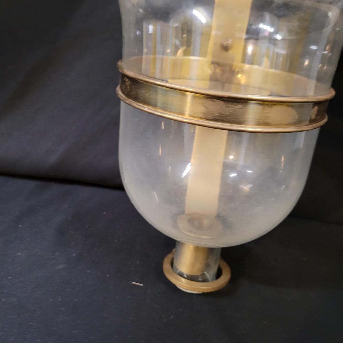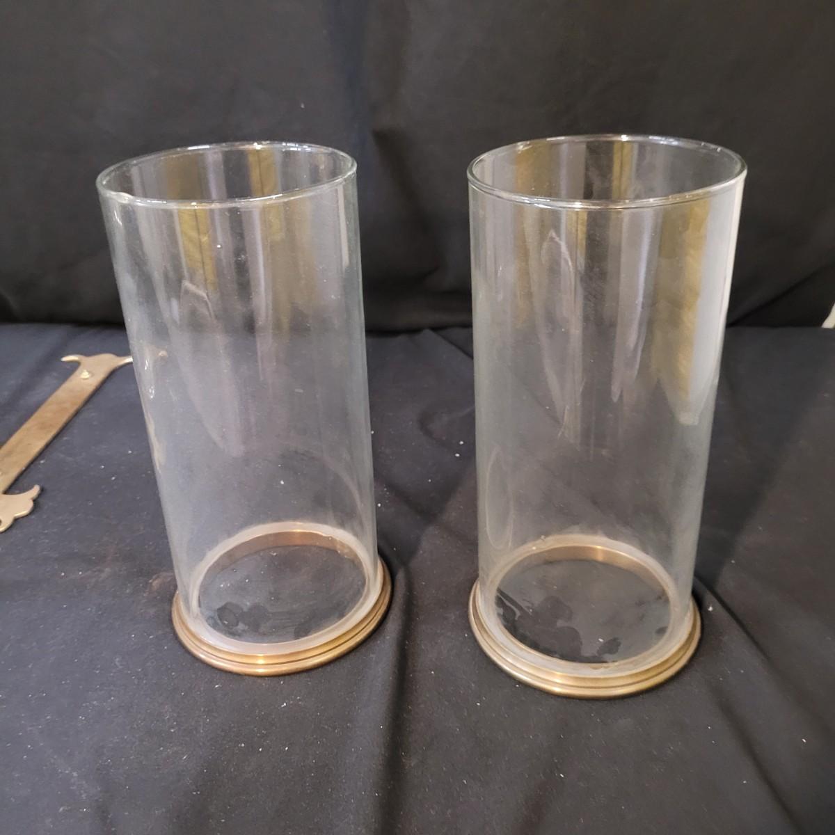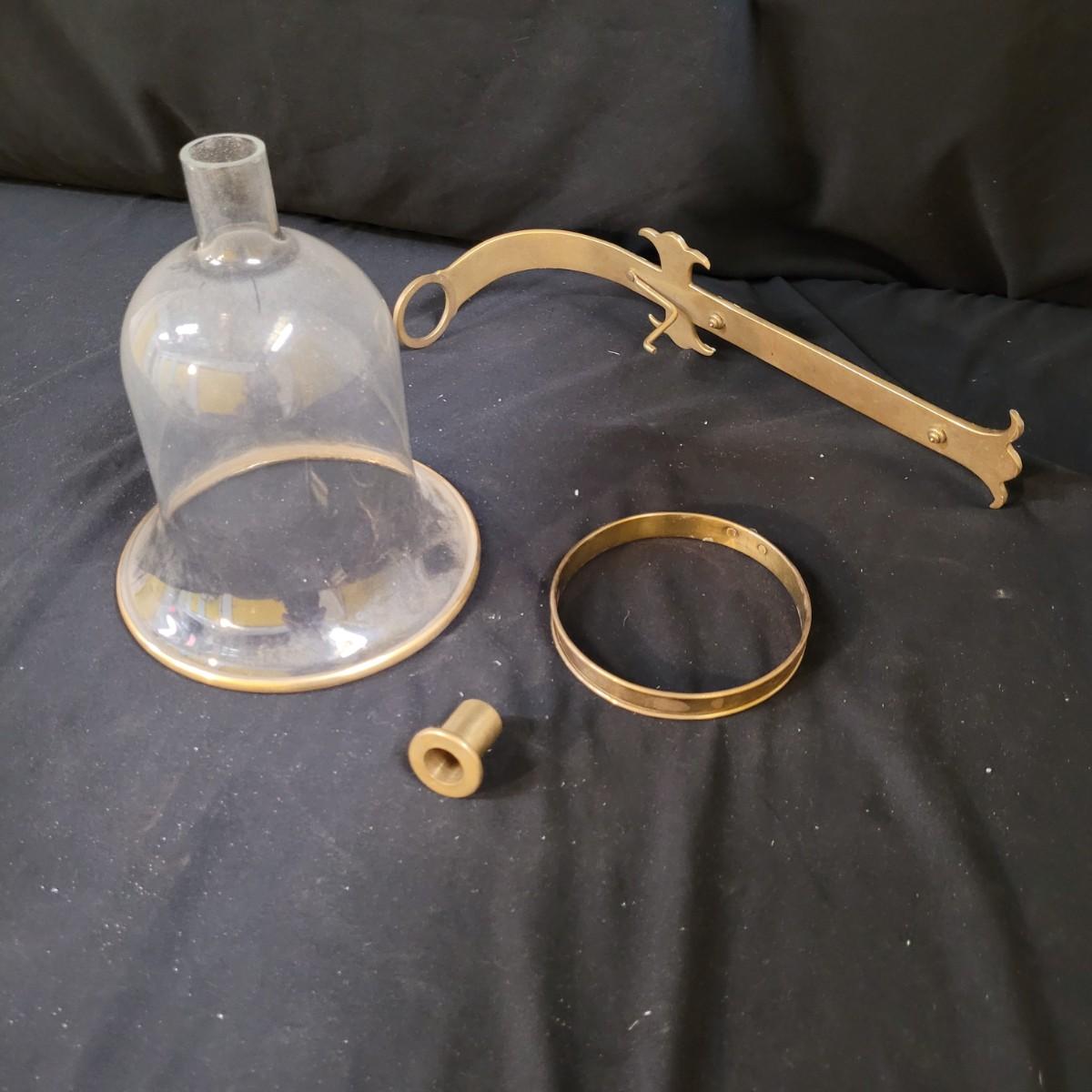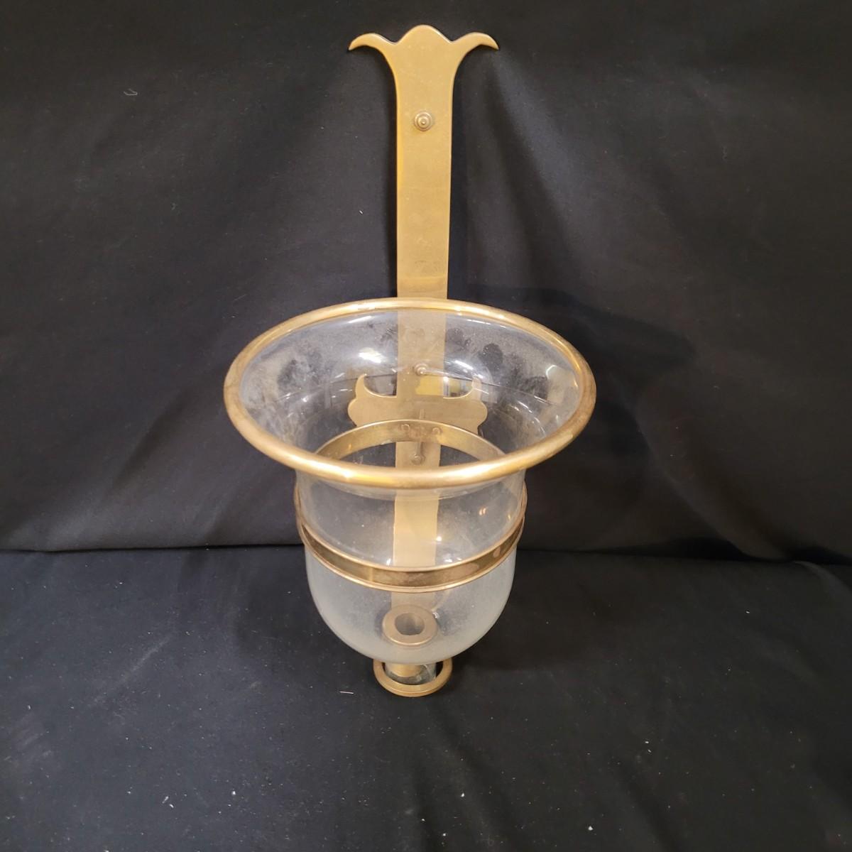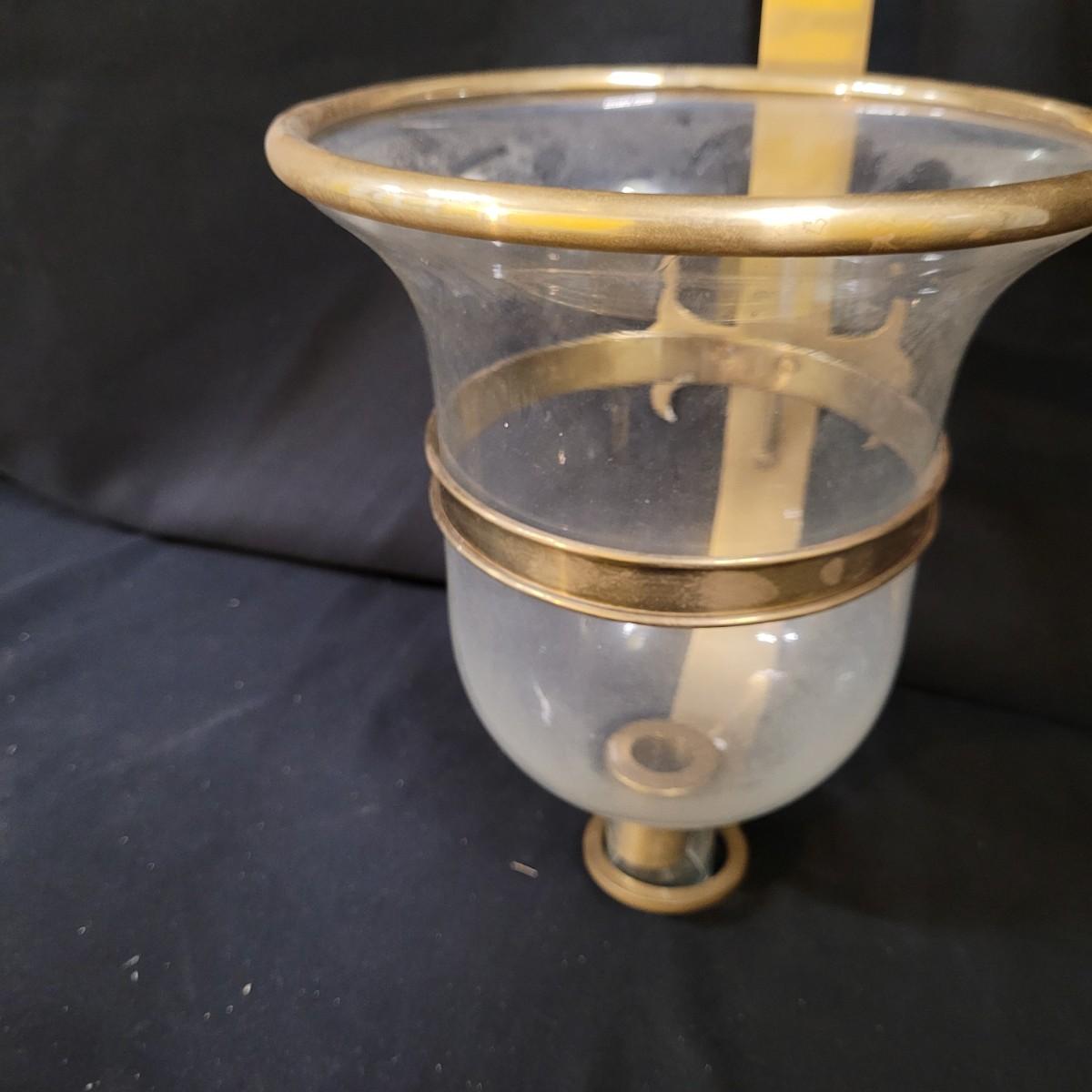 Metal sconce with small decorative hardware pieces to cover screw holes (hardware sticks on). Large glass globe sets in hole with removable candle holder base. Small chips at base. Two large hurricane globes in good condition with small chip at rim (see photos). Hurricane globes measure approximately 5"DIA x11"H. Shipping available.