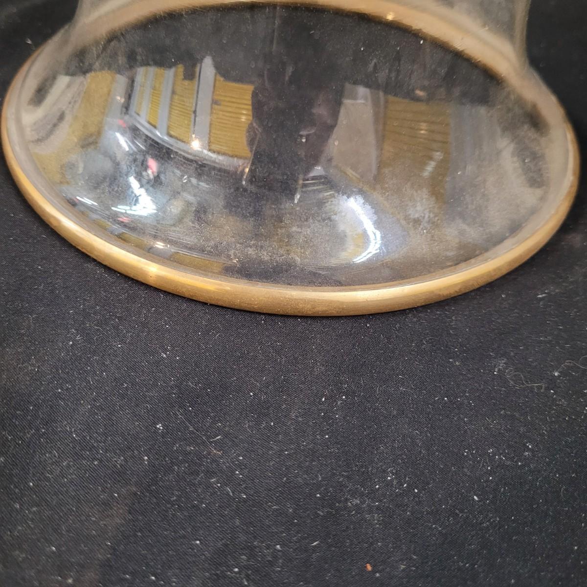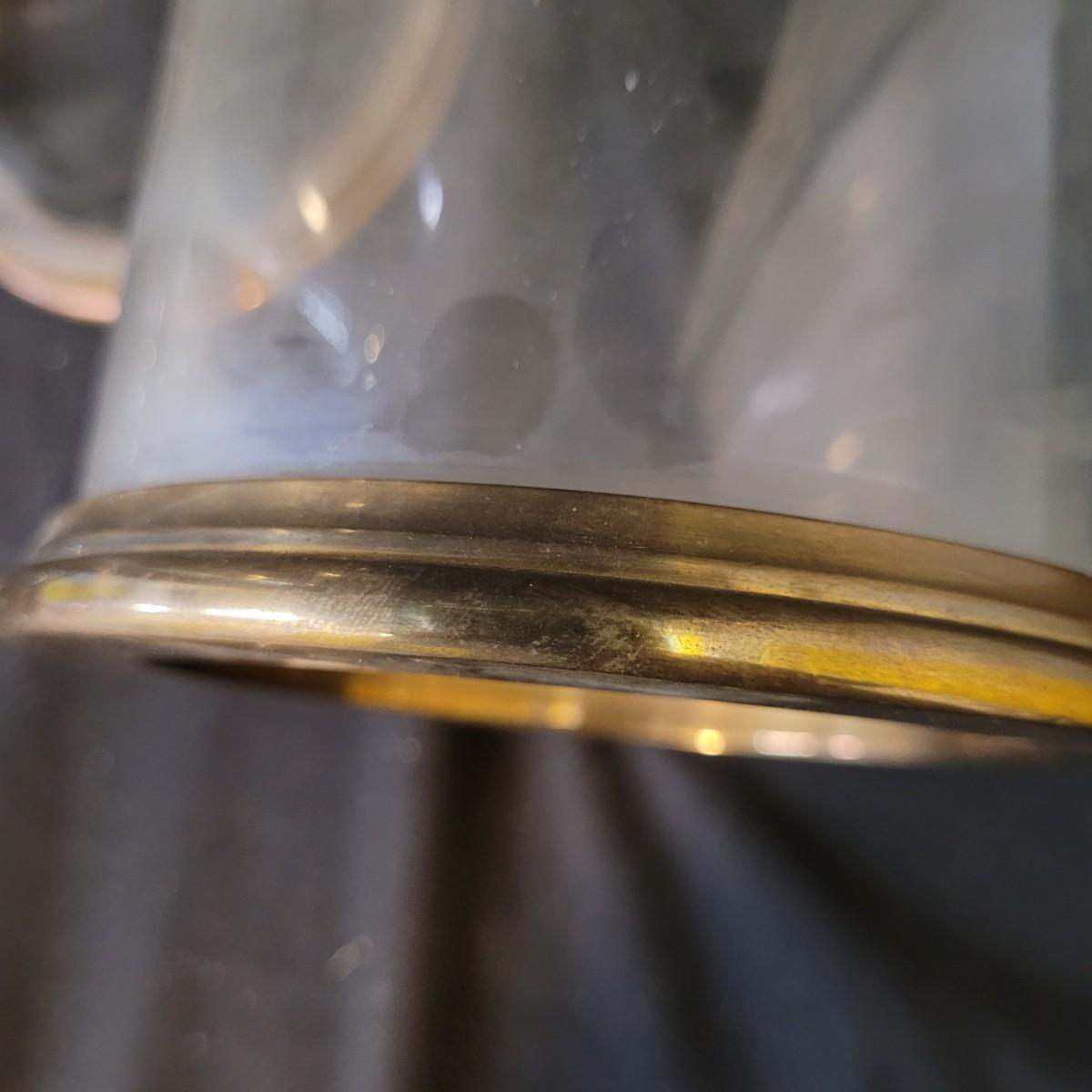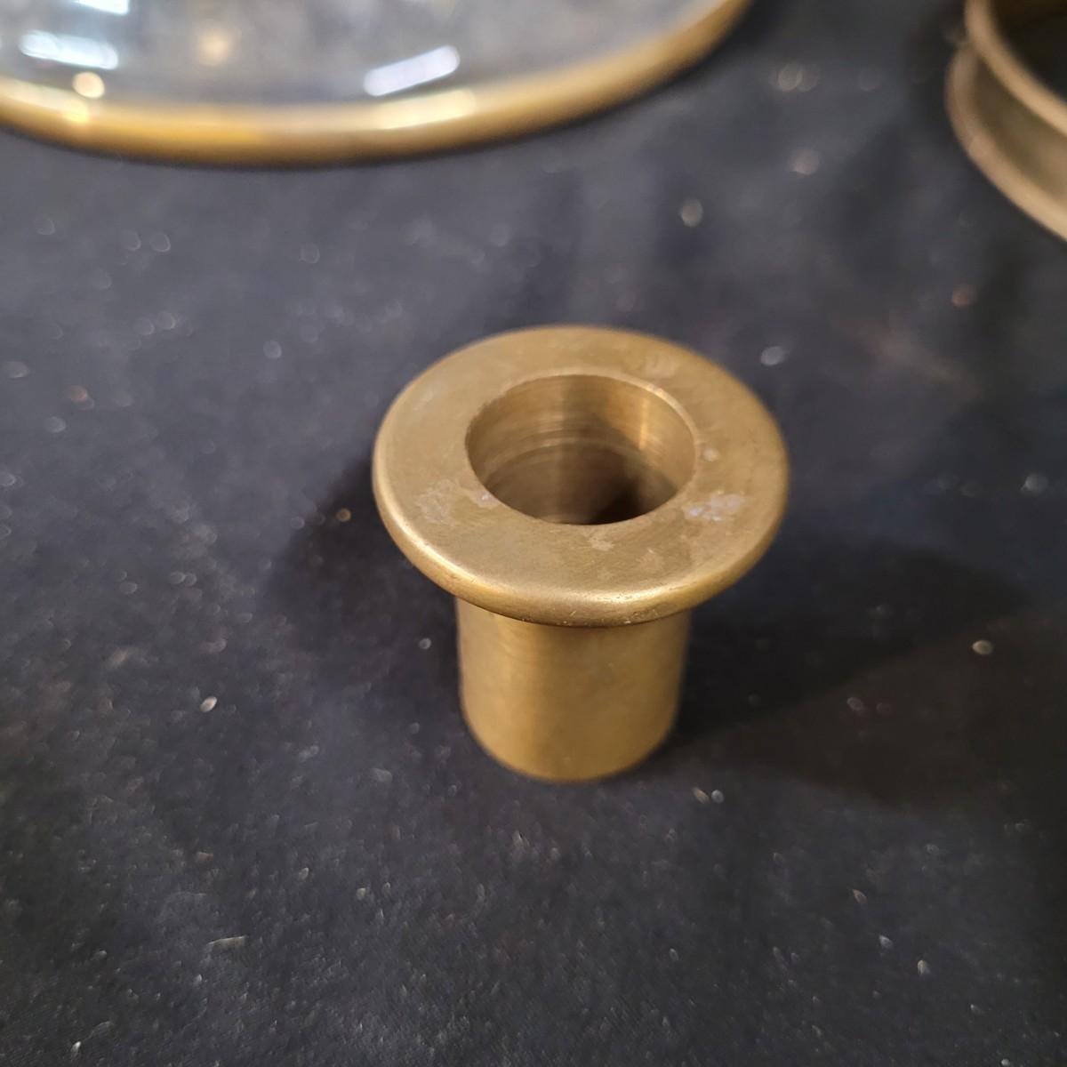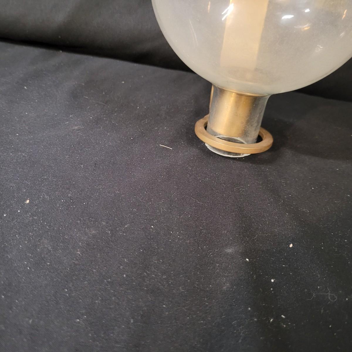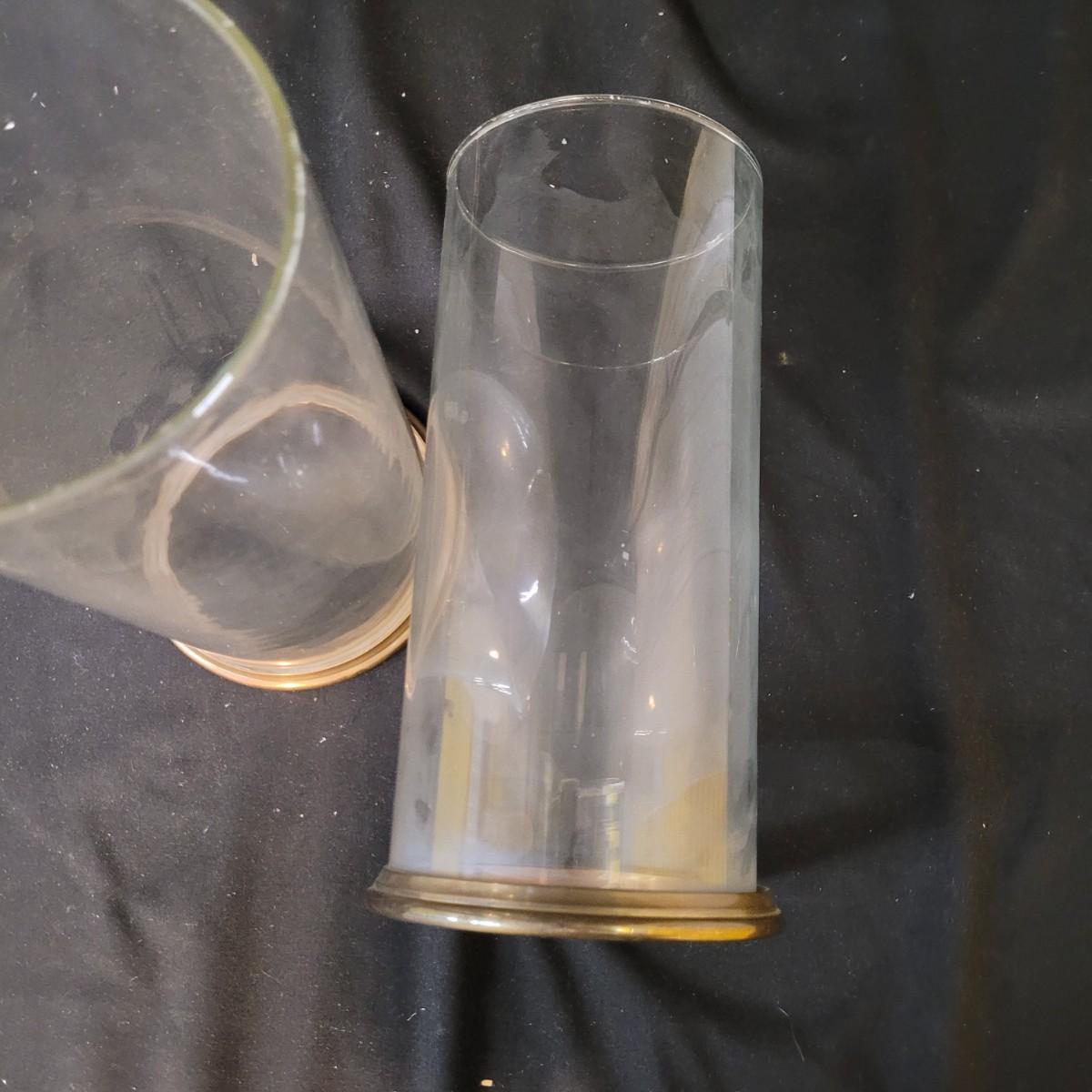 Metal sconce with small decorative hardware pieces to cover screw holes (hardware sticks on). Large glass globe sets in hole with removable candle holder base. Small chips at base. Two large hurricane globes in good condition with small chip at rim (see photos). Hurricane globes measure approximately 5"DIA x11"H. Shipping available.