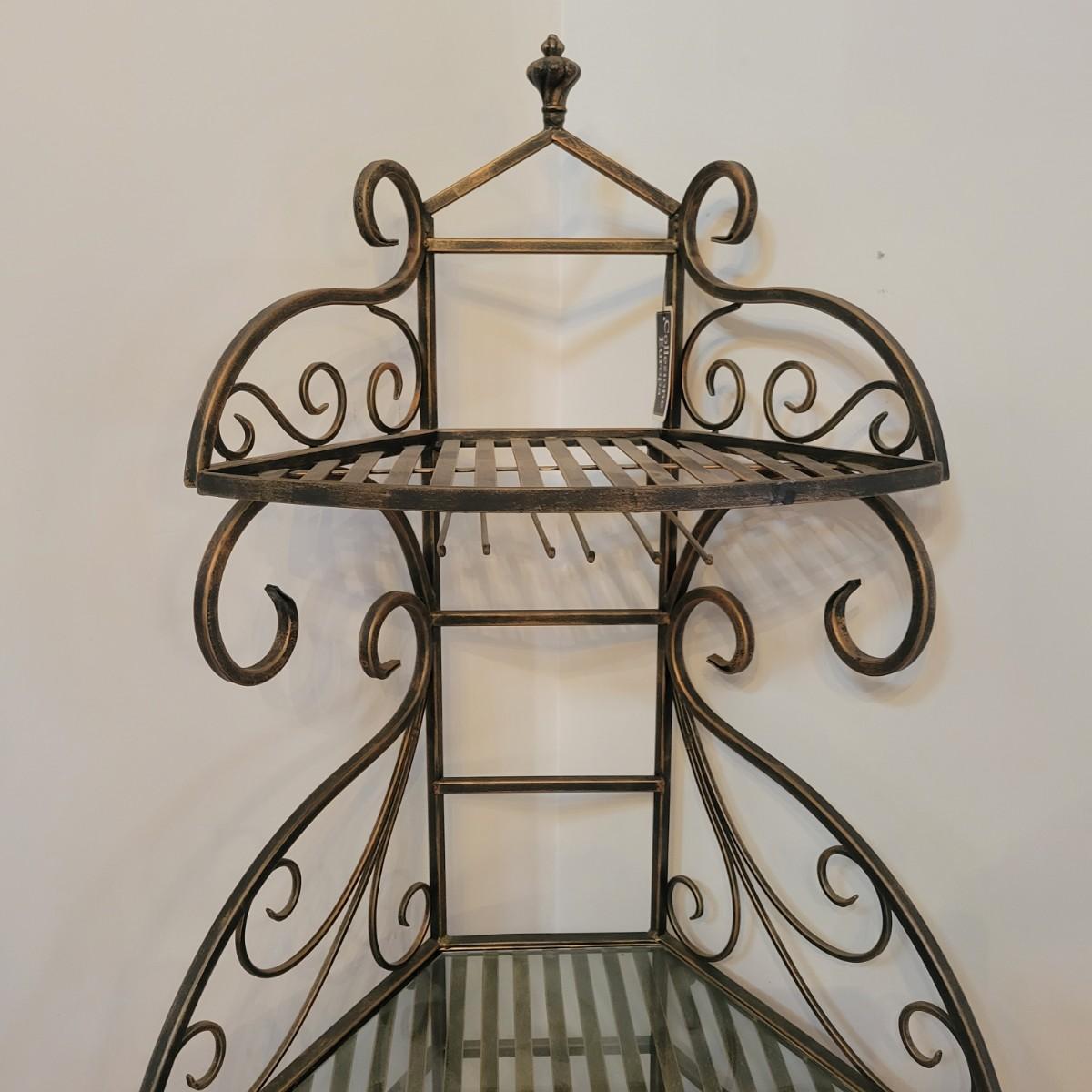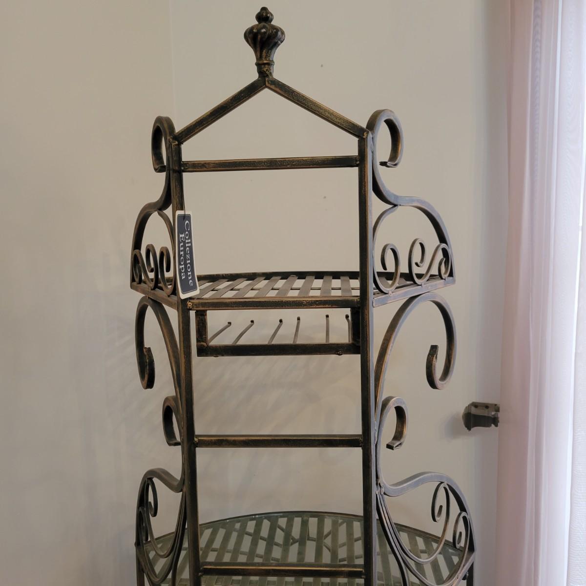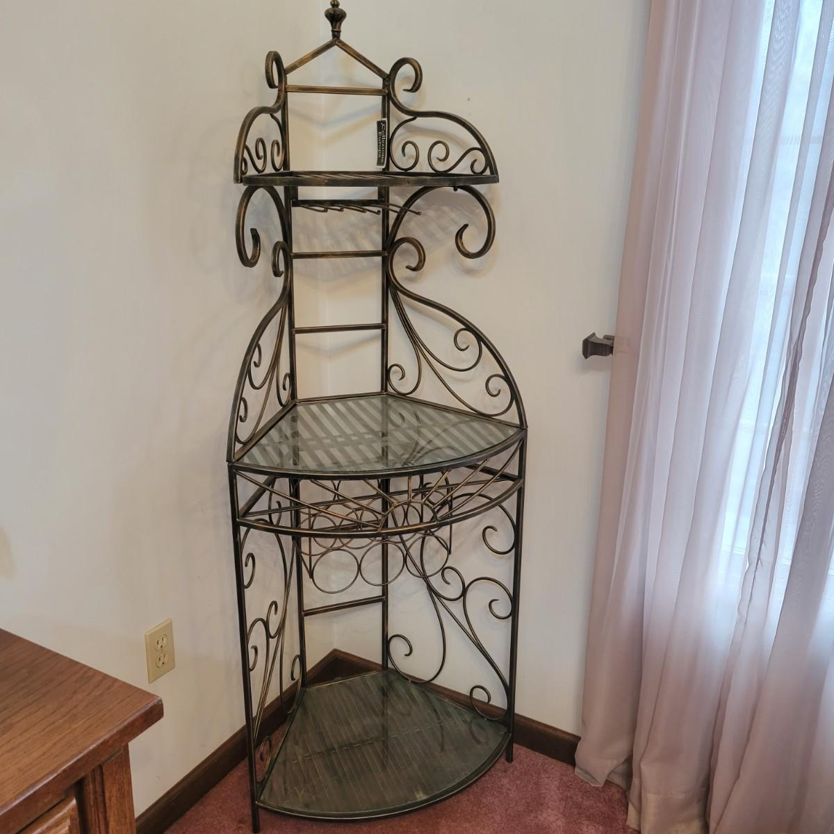 A metal and glass wine bar designed to fit in a corner. It has no obvious damage and measures approximately 26" x 19" x 67". It features three shelves, two that have glass tops. It has hangers for holding wine glasses and storage for six wine bottles. Attached tag reads "Collezione Europa". Local pickup only. Winning bidder must bring assistance to help move and load this item due to its weight and/or size.