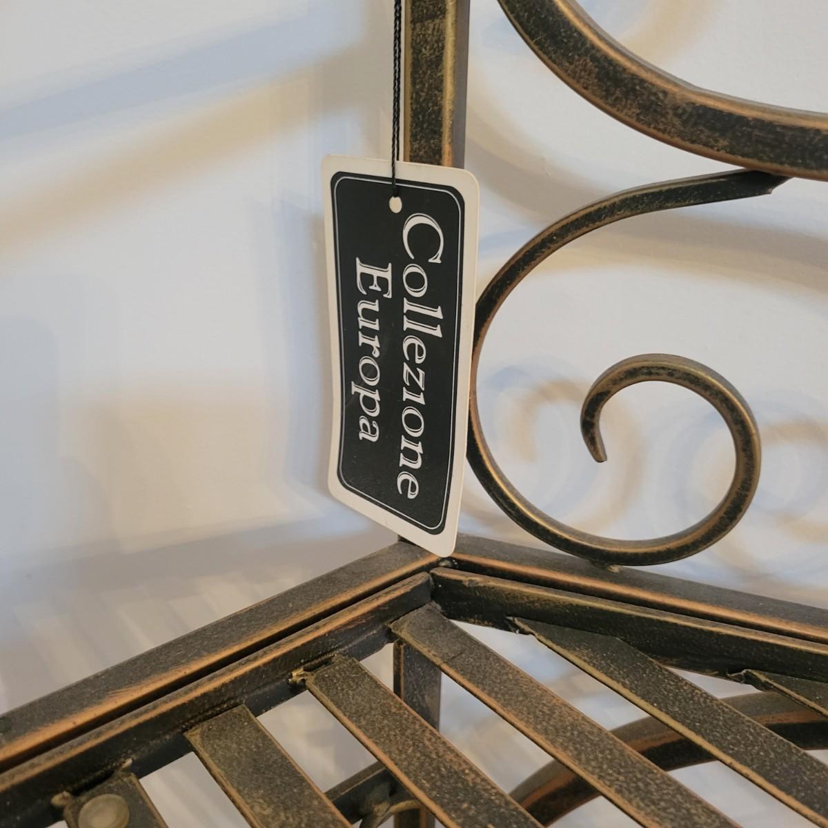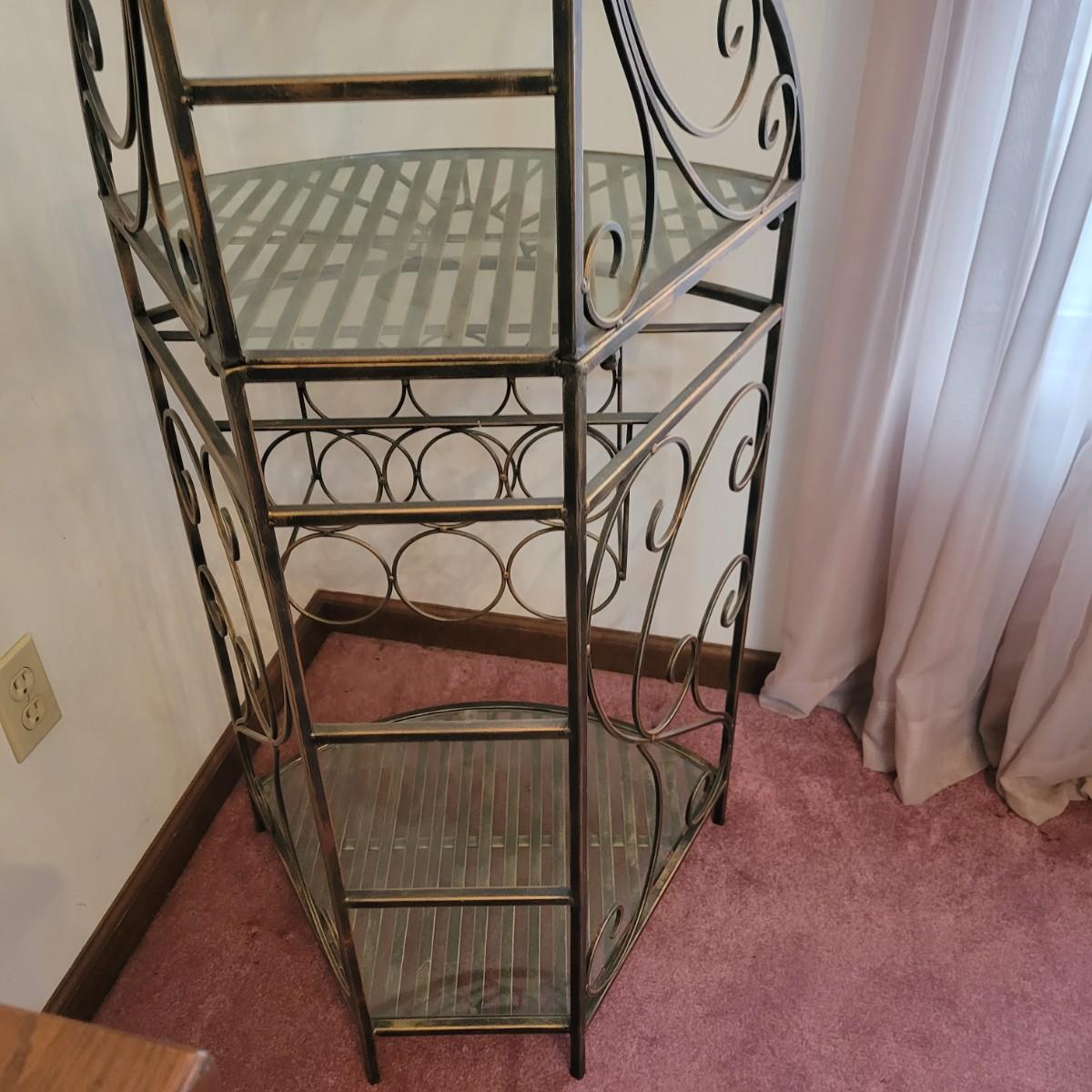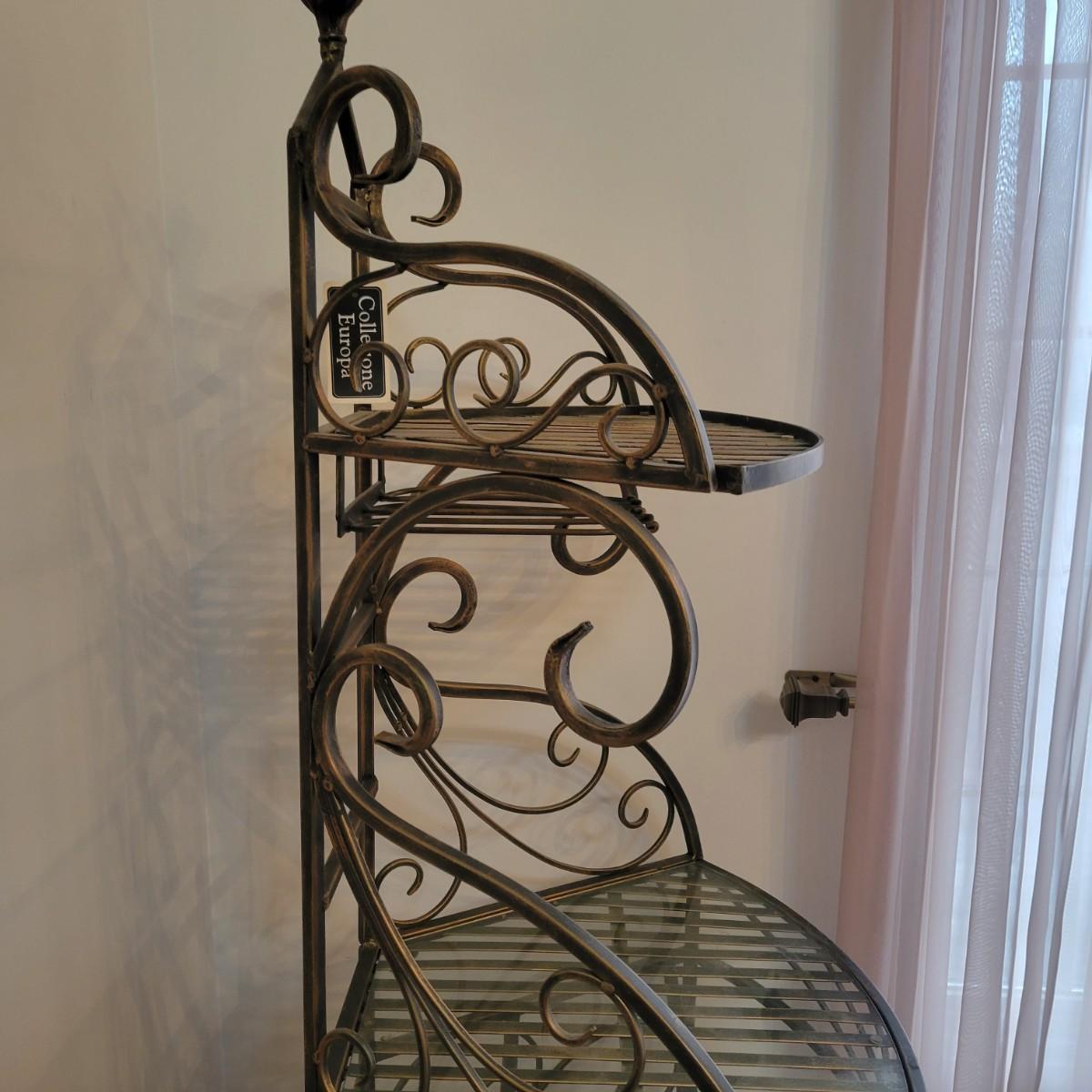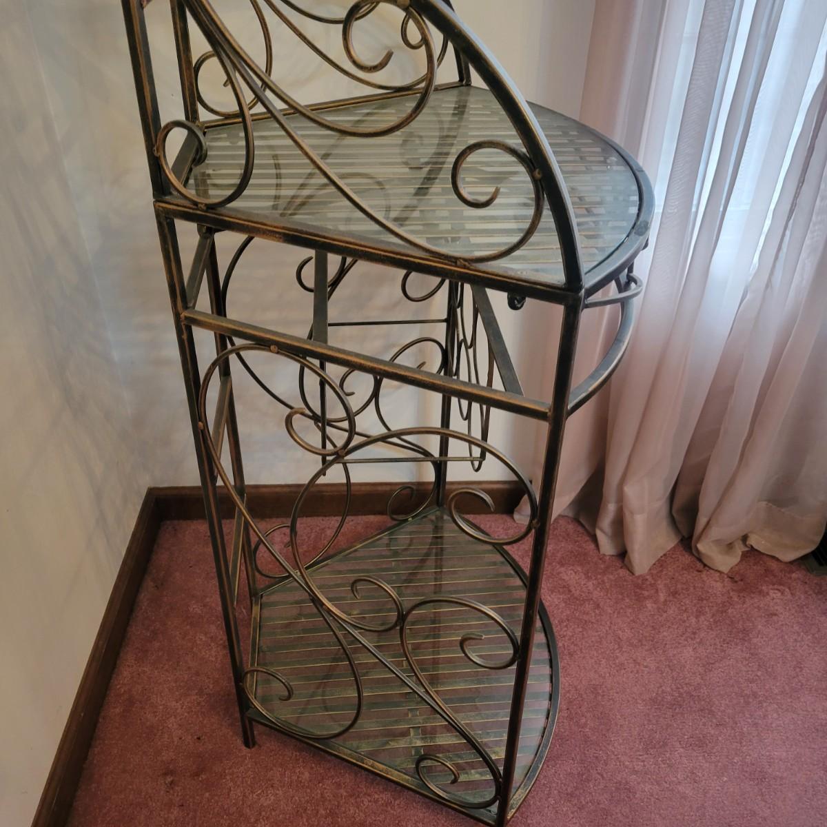 A metal and glass wine bar designed to fit in a corner. It has no obvious damage and measures approximately 26" x 19" x 67". It features three shelves, two that have glass tops. It has hangers for holding wine glasses and storage for six wine bottles. Attached tag reads "Collezione Europa". Local pickup only. Winning bidder must bring assistance to help move and load this item due to its weight and/or size.