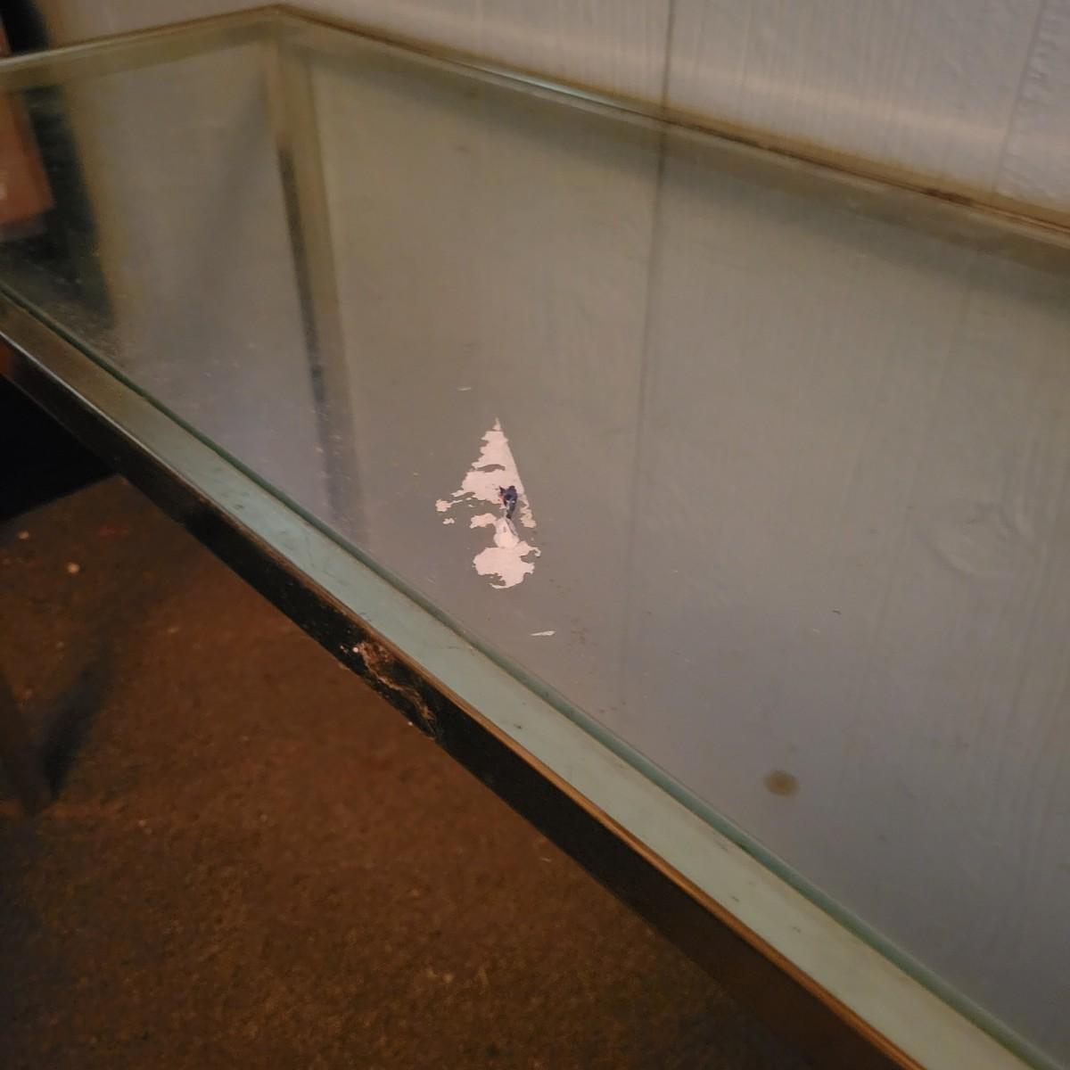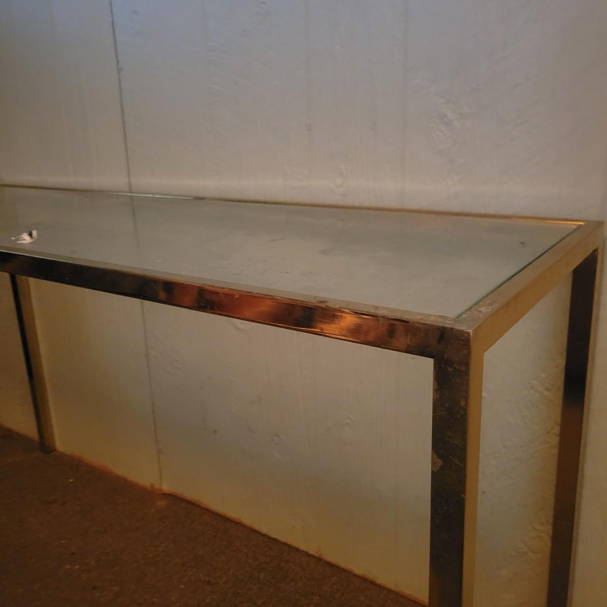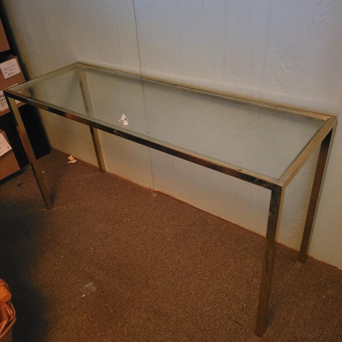 A long table with a metal frame and tempered glass top in fair condition. The top has a white sticker mark which should remove easily. Metal frame hase some peeling and scratches as does the glass. Table measures approximately 48" x 16" x 28" Local pickup only